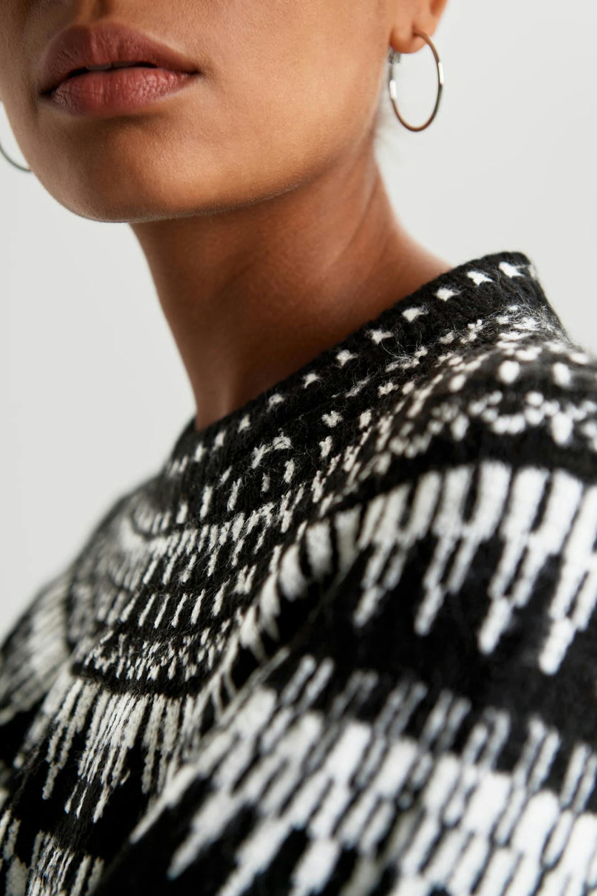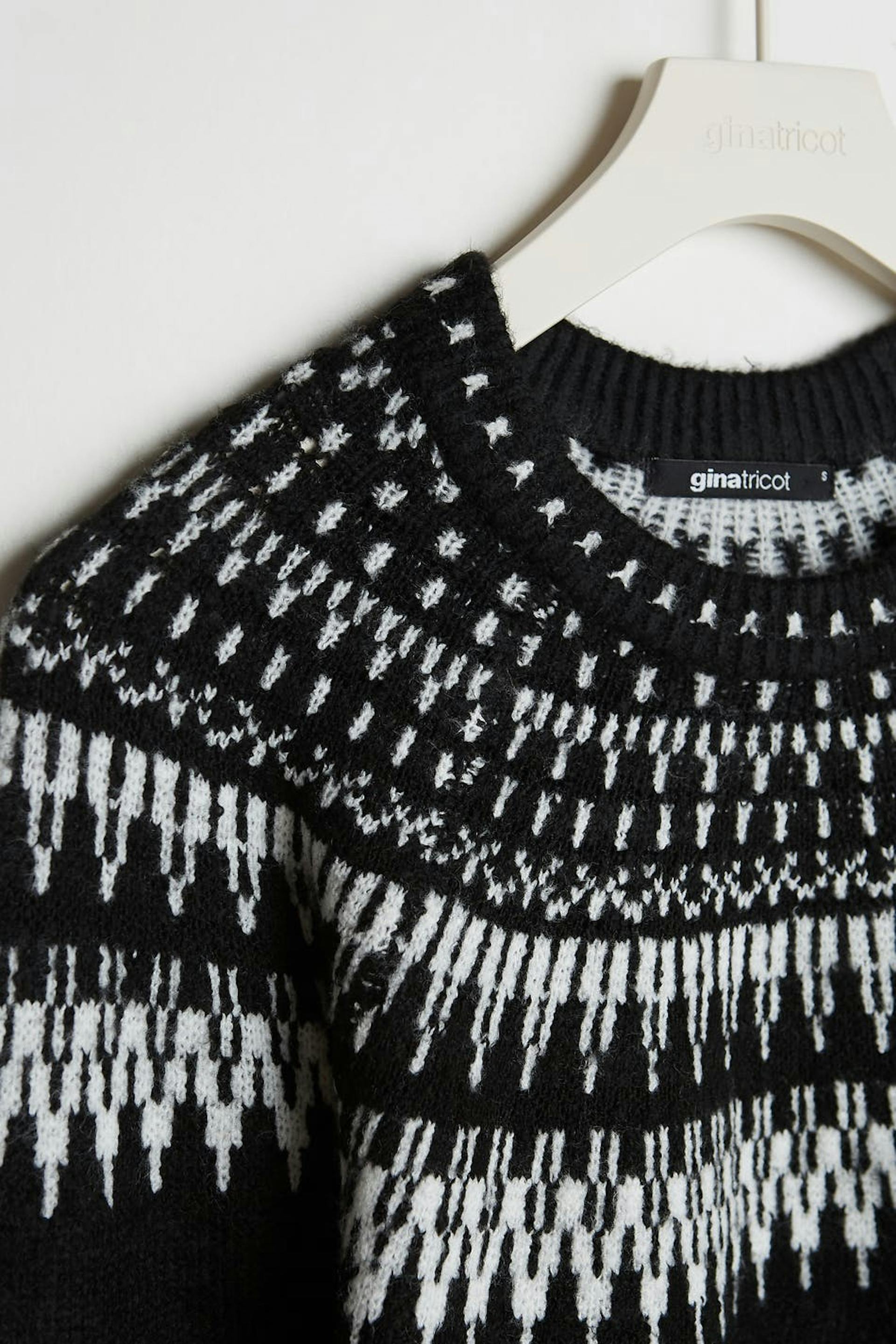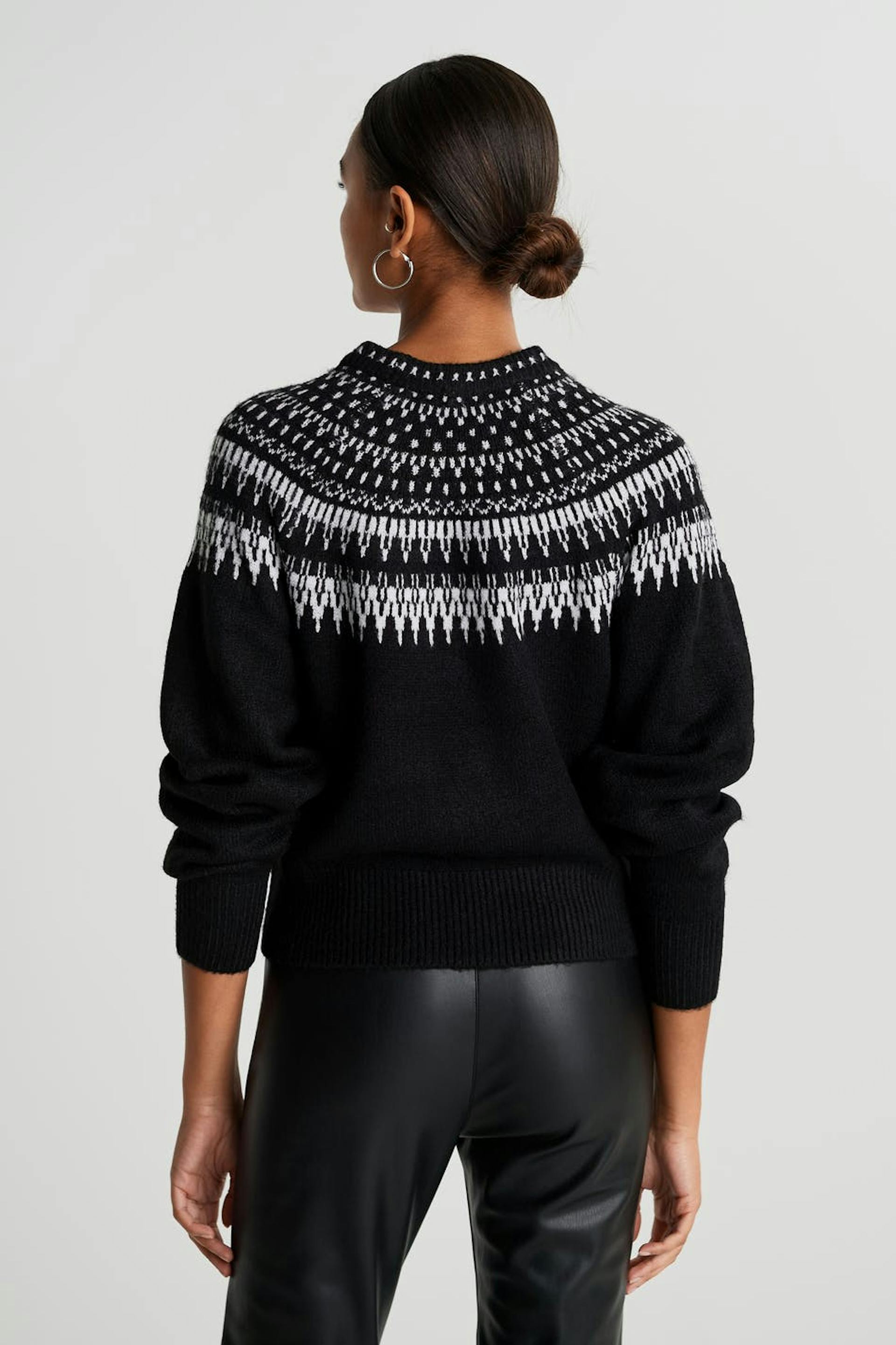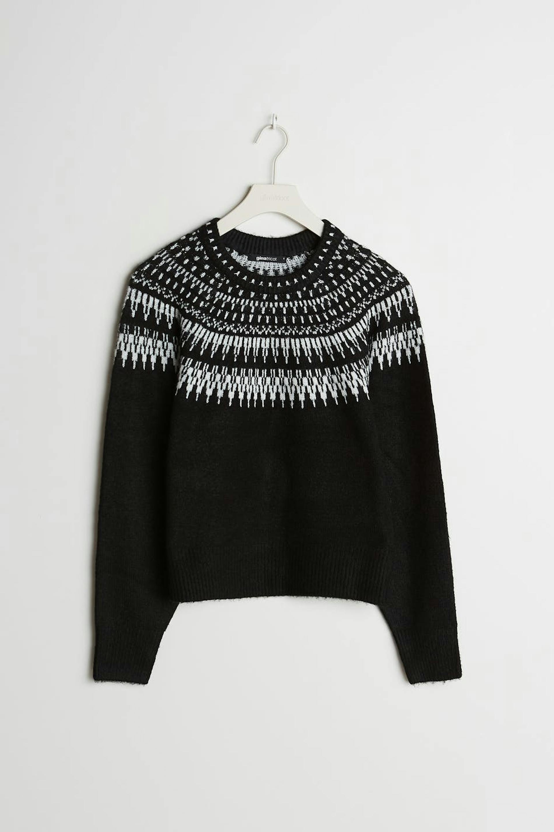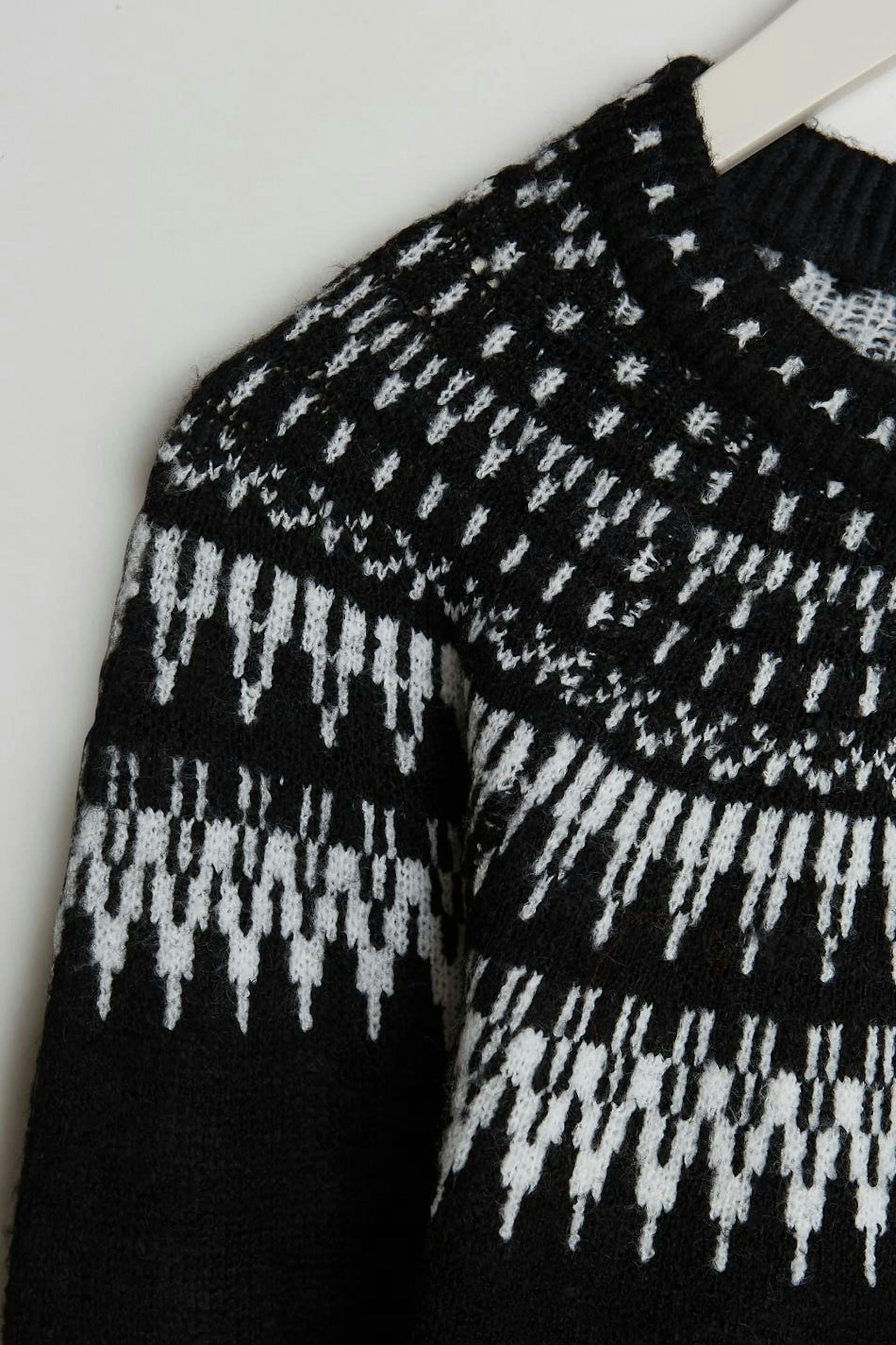 Knitted jumper with knitted, white details at the top. The jumper is black.