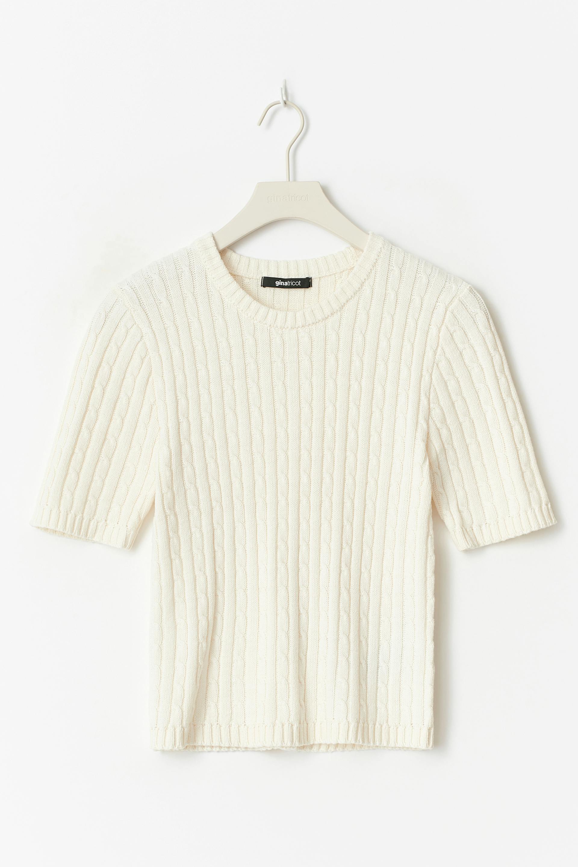 Cable knit top with short sleeve. The top is beige and has round neckline. It has rib knit at sleeve ends.