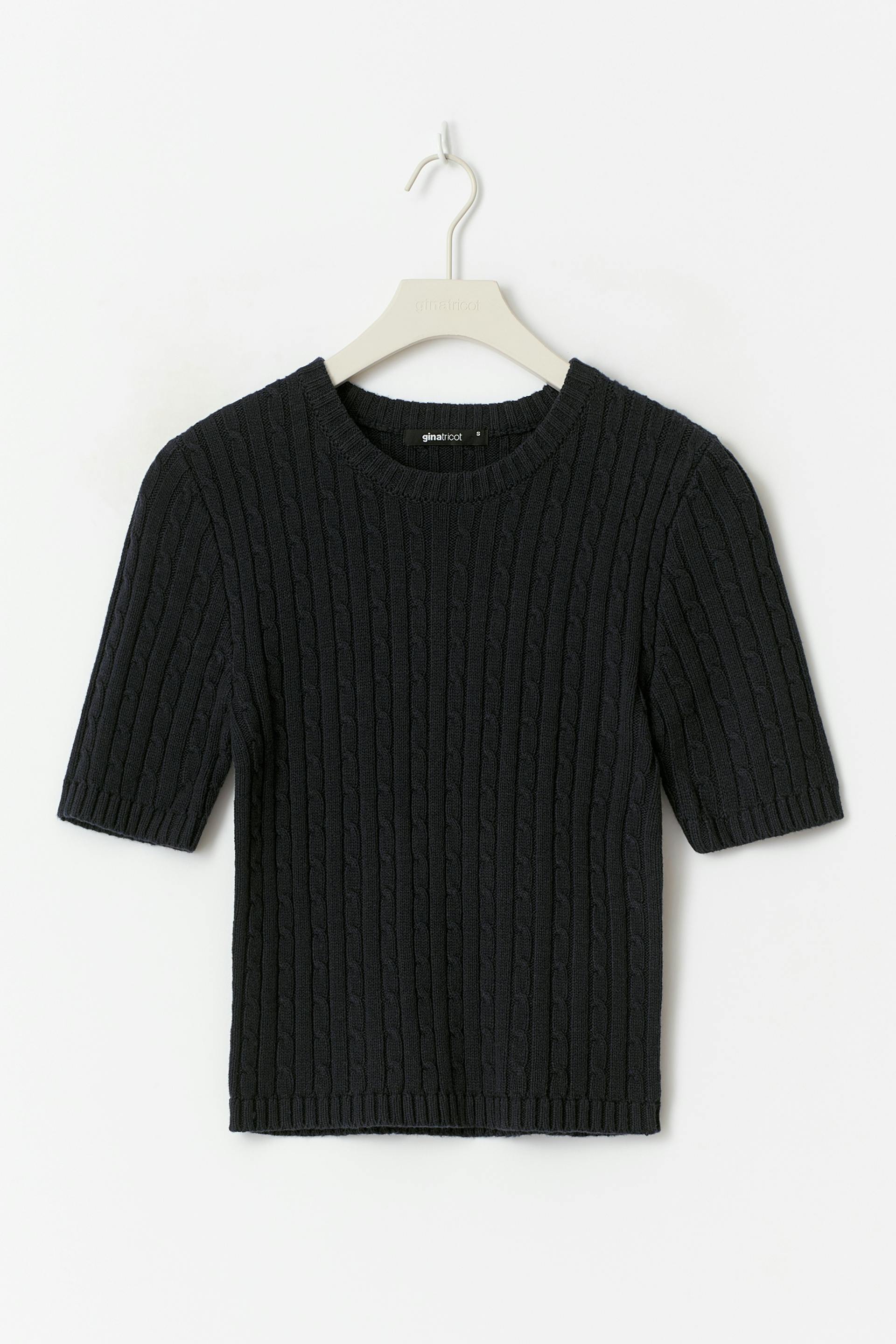 Cable knit top with short sleeve. The top is blue and has round neckline. It has rib knit at sleeve ends.