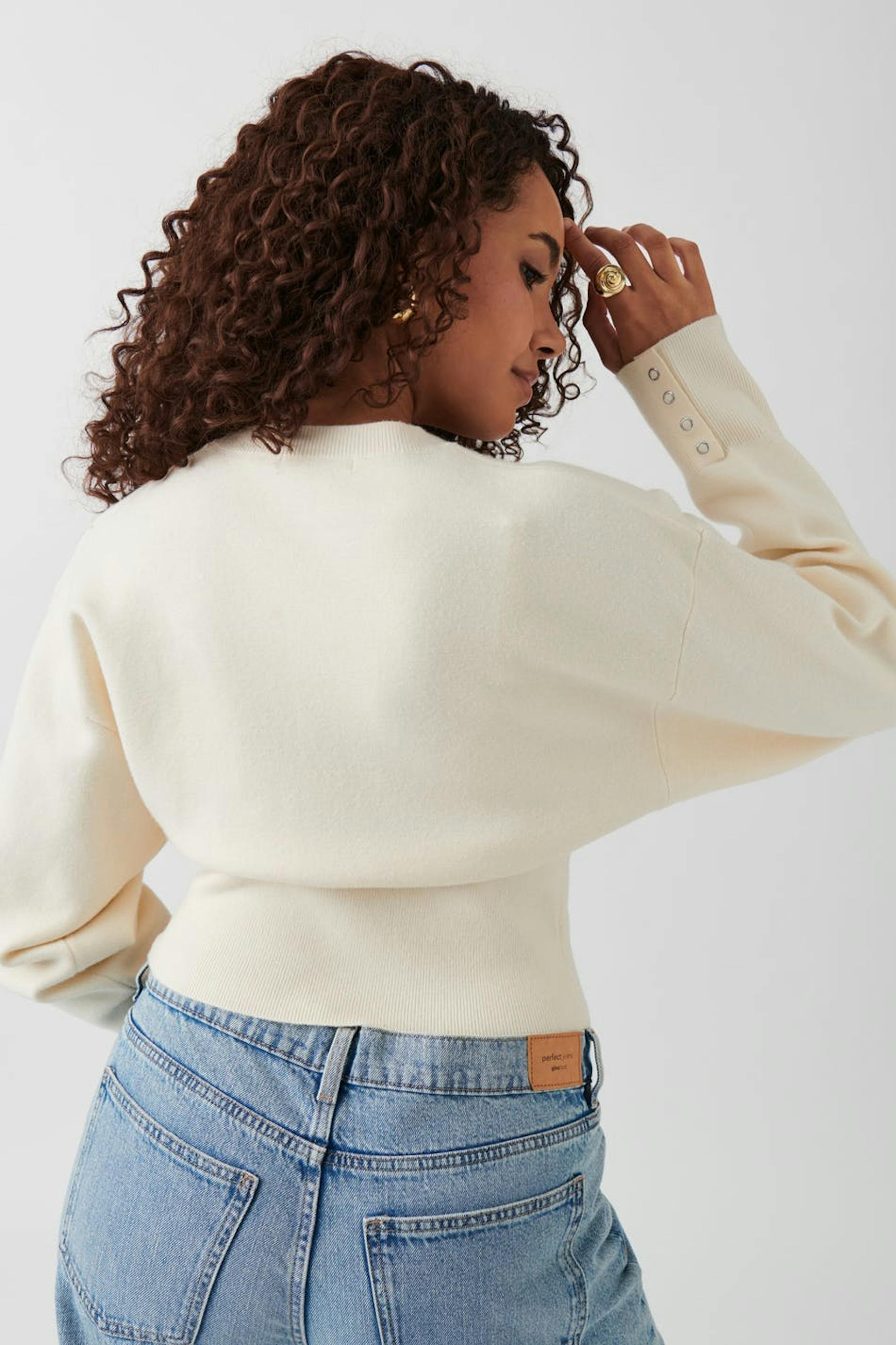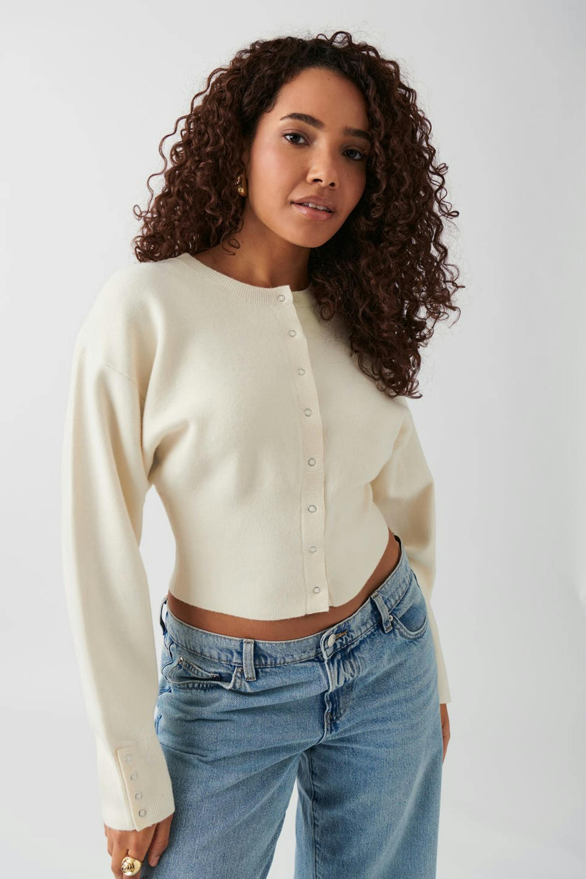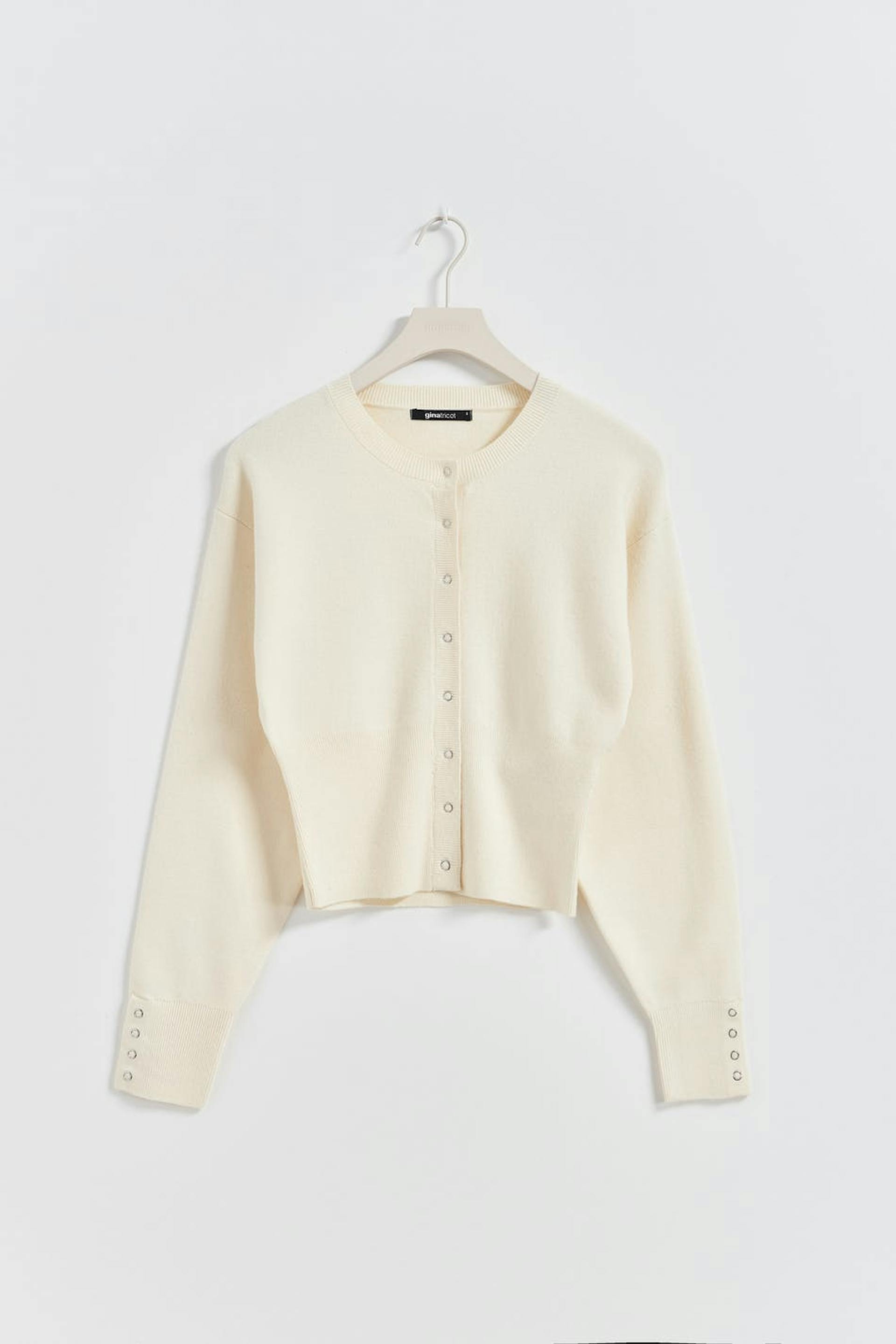 Knitted cardigan with fitted waist. The cardigan is beige and has snap buttons at the front and on the sleeve ends. It has regular fit, round neckline, dropped shoulder and ribbing at sleeve ends and at the bottom.