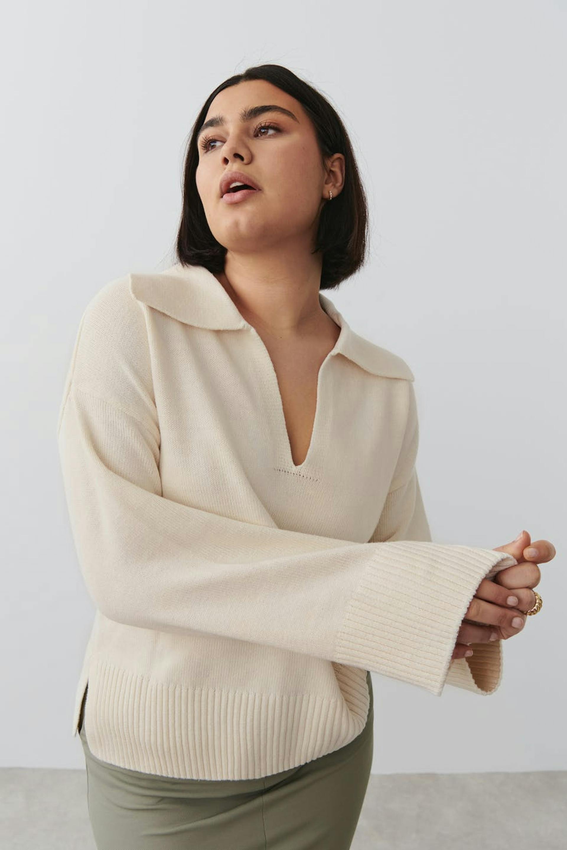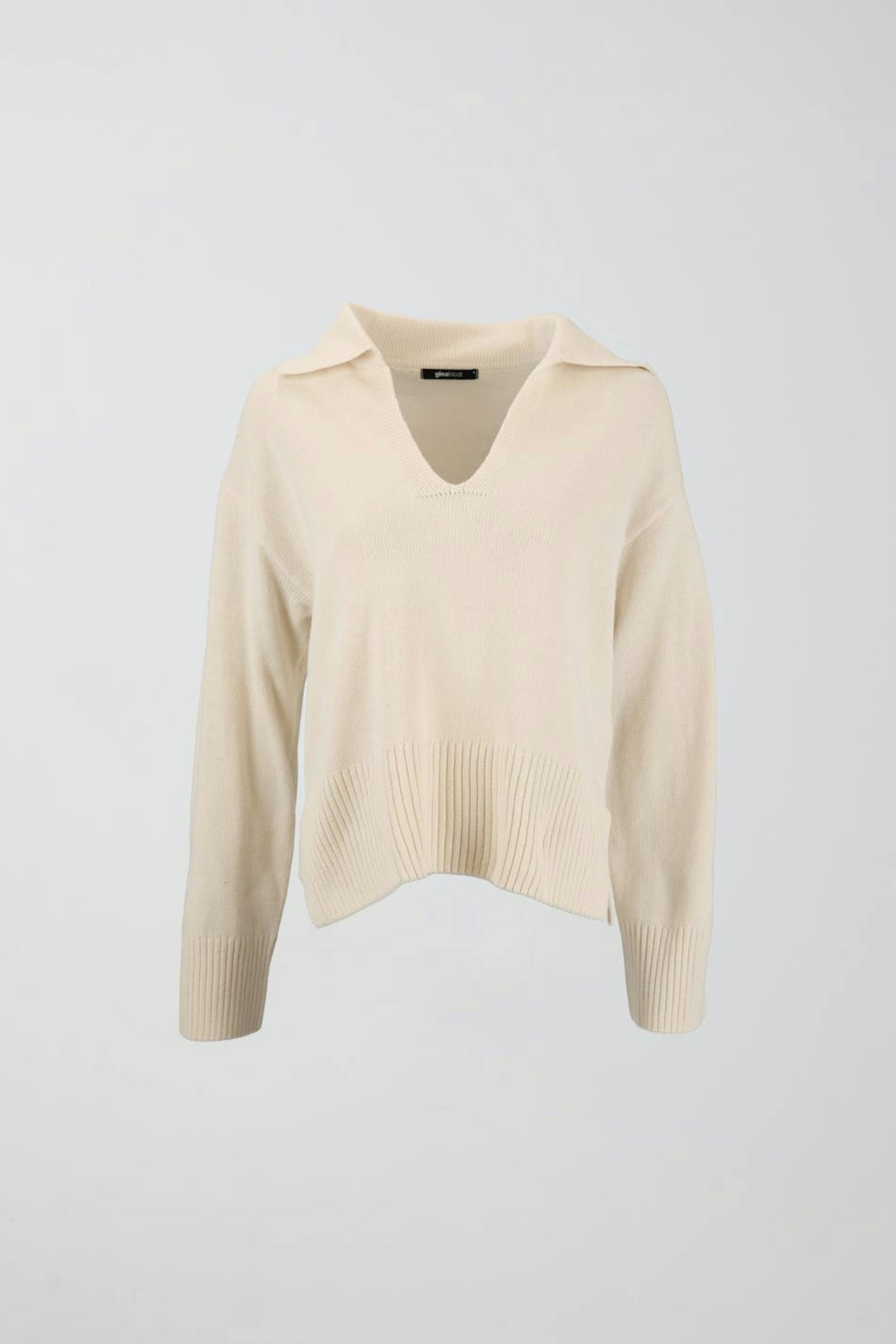 Knitted jumper with boxy fit. The jumper is white and has v-neck. It has large collar, slit in the sides and rib knit at the bottom.
