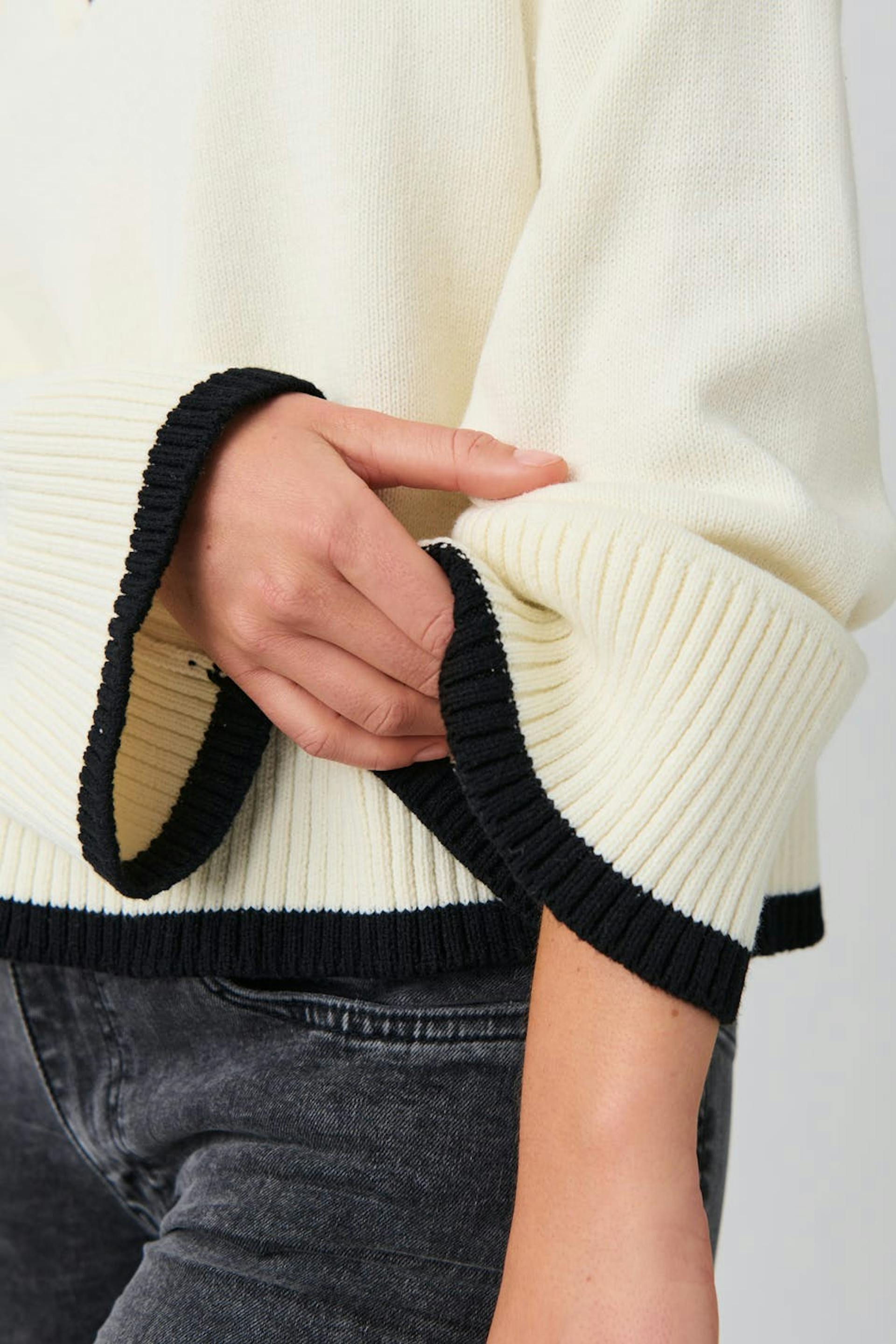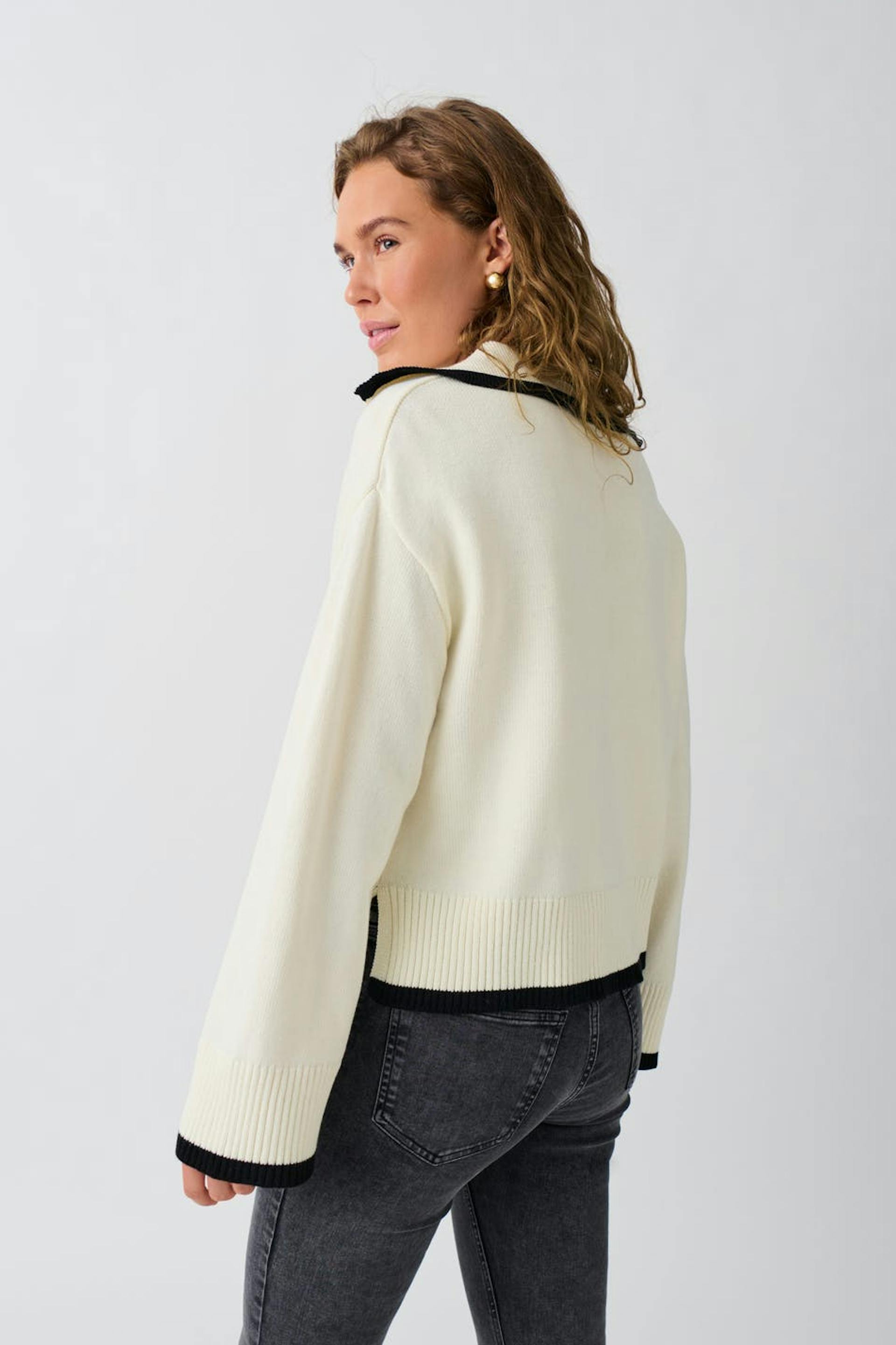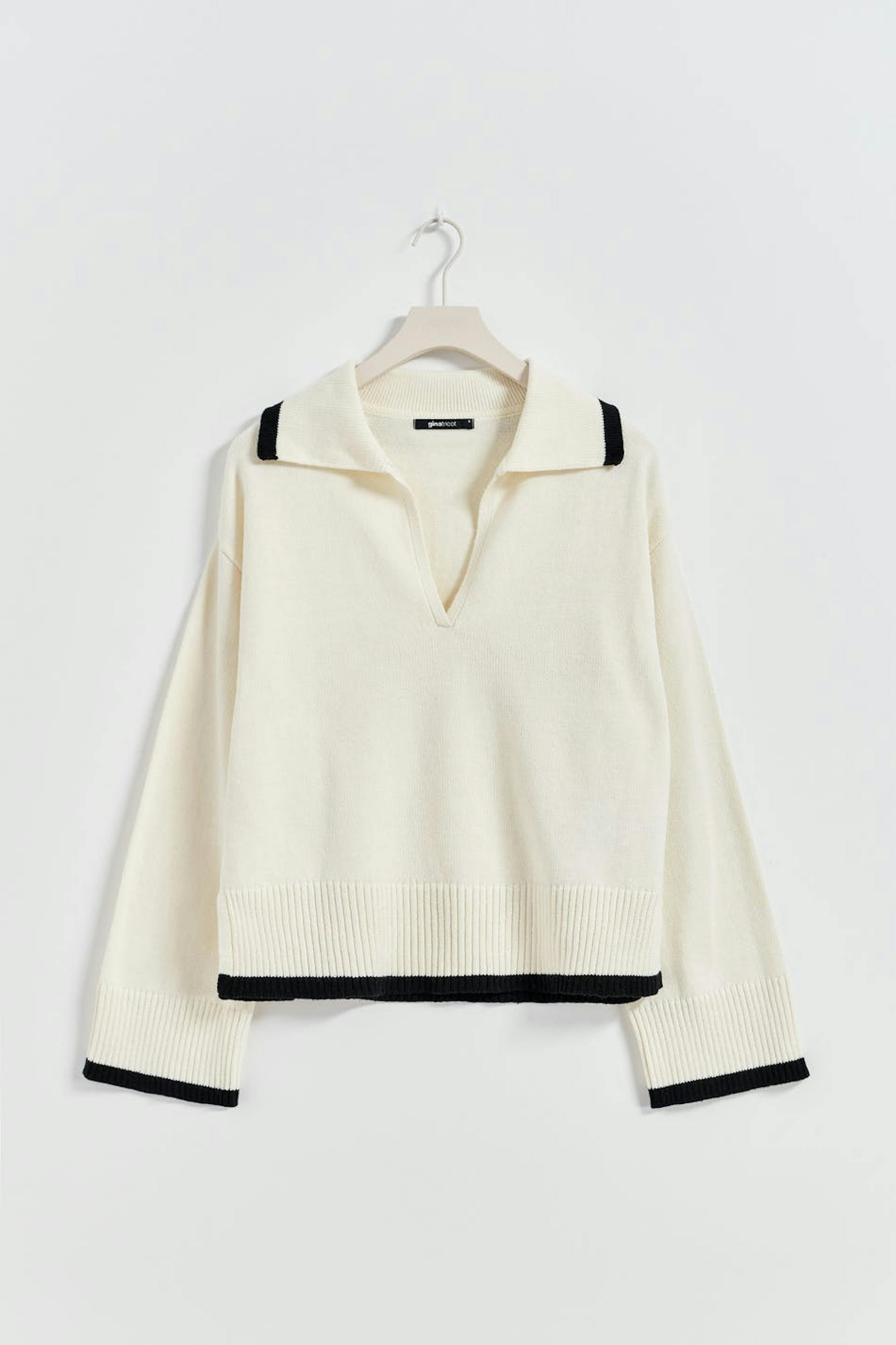 Knitted sweater with black, contrast-coloured details. The sweat is white and has boxy fit. It has v-neck, large collar, slit in the sides and rib knit at the bottom.
