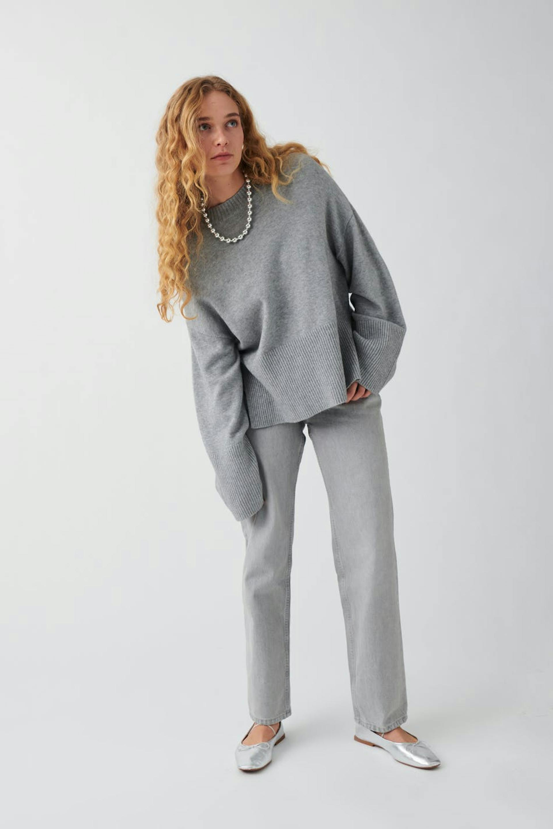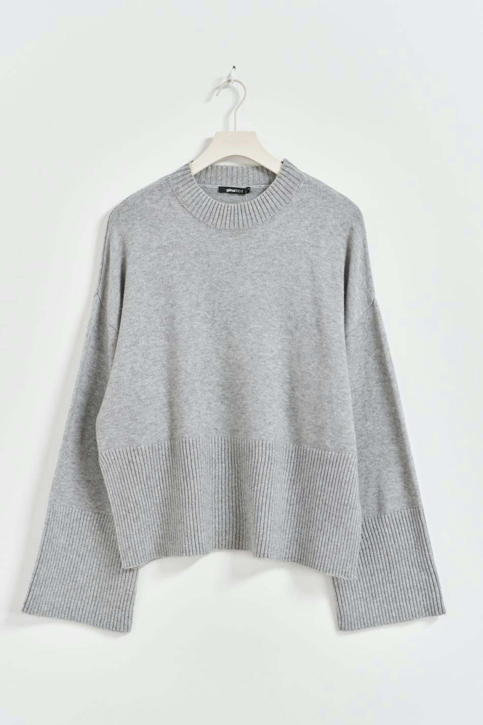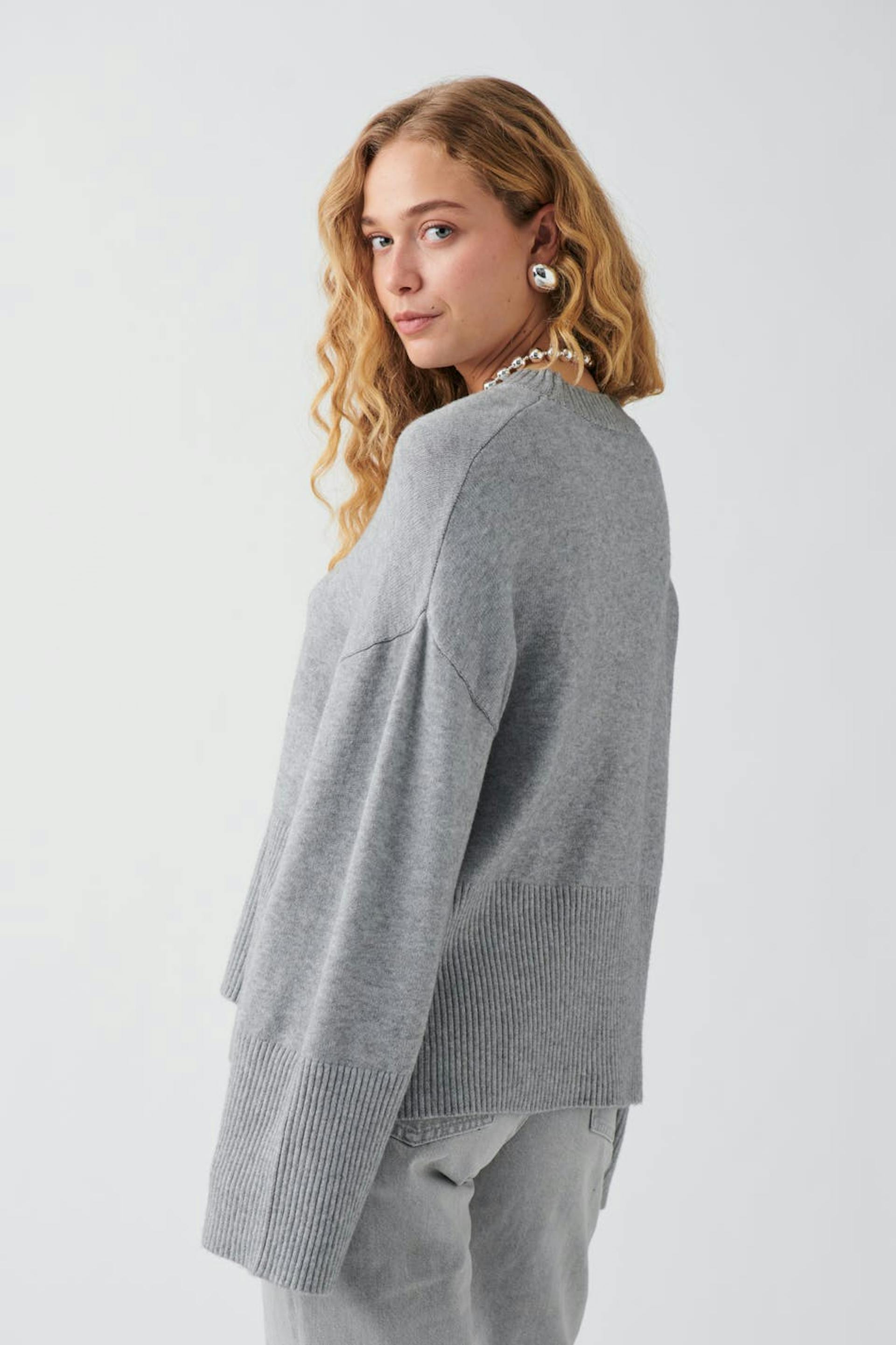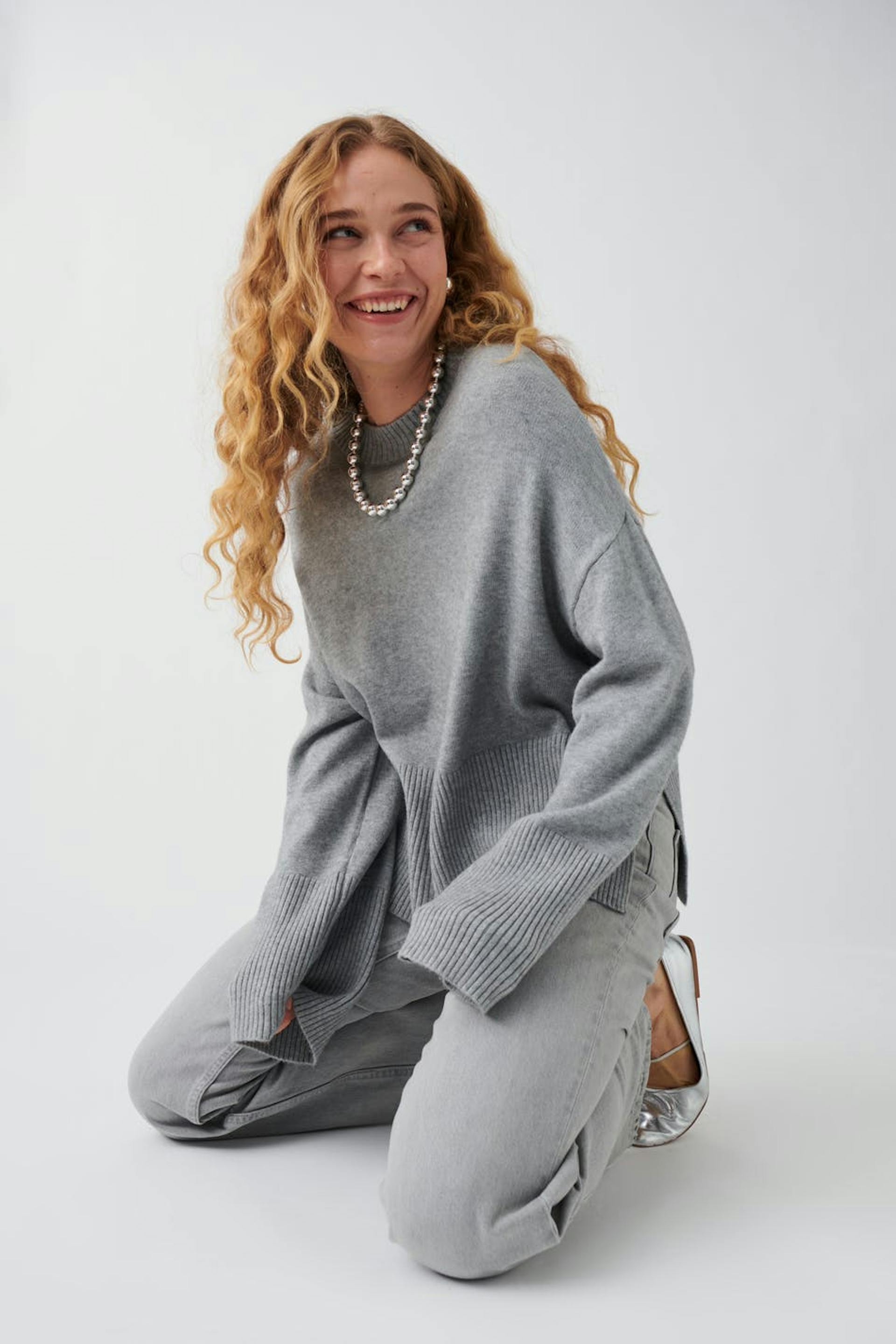Knitted sweater with boxy fit. The sweat is grey and has long sleeve. It has soft quality, crew neckline, slit in the sides and wide ribbing at sleeve ends and at the bottom.