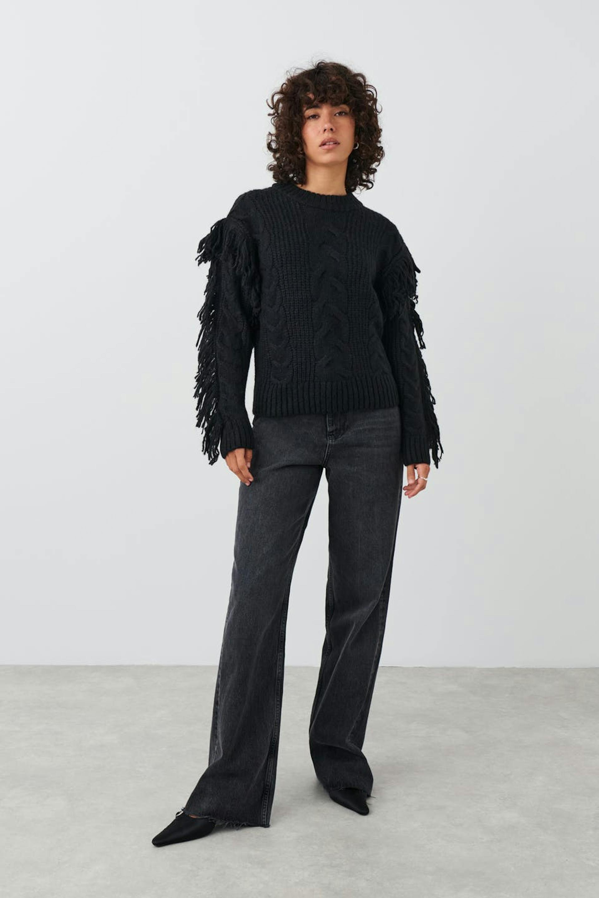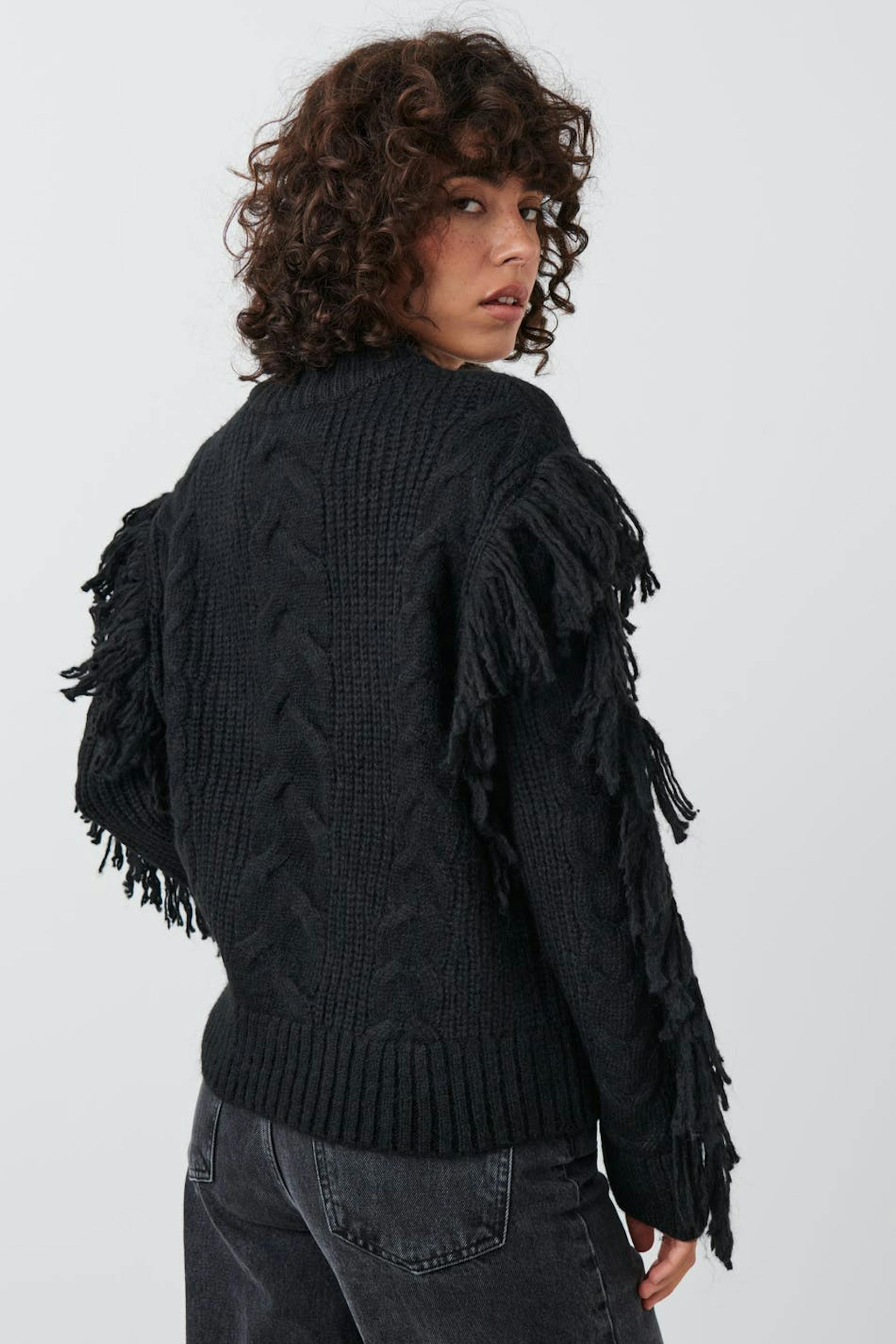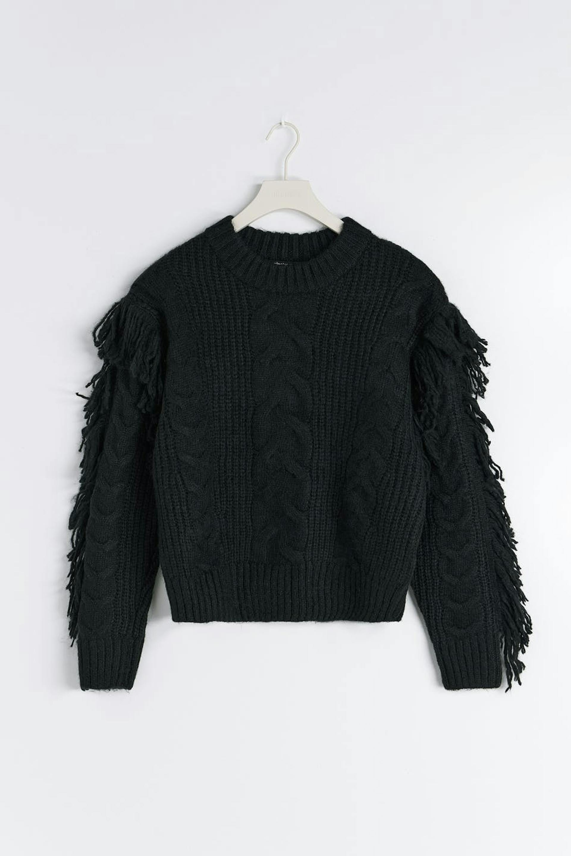 Cable-knit jumper with fringes on the sleeves. The jumper is black and has boxy fit. It has round neckline and rib knit at the bottom.