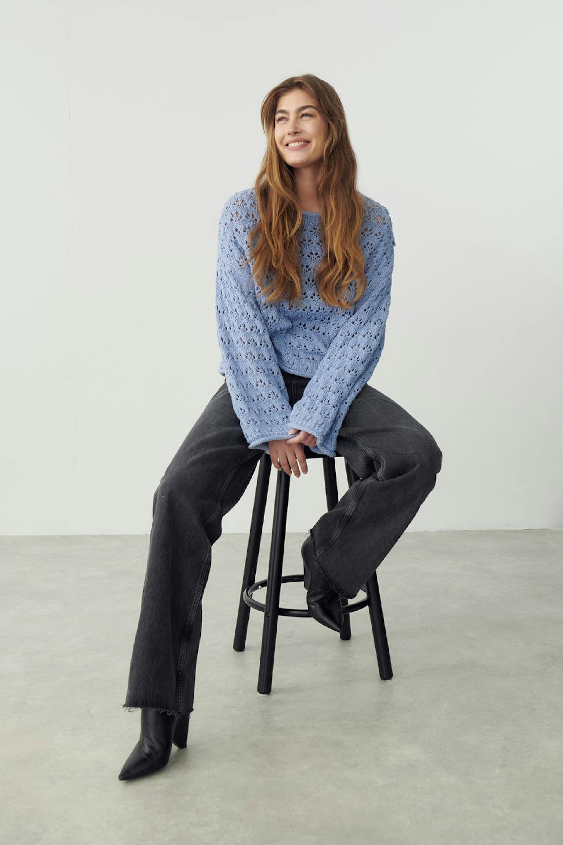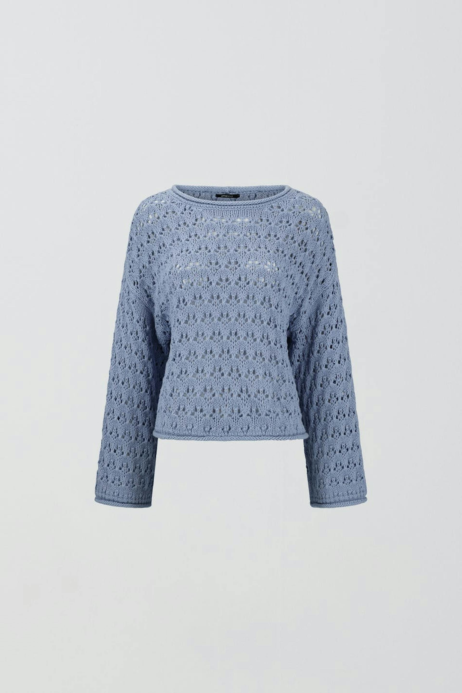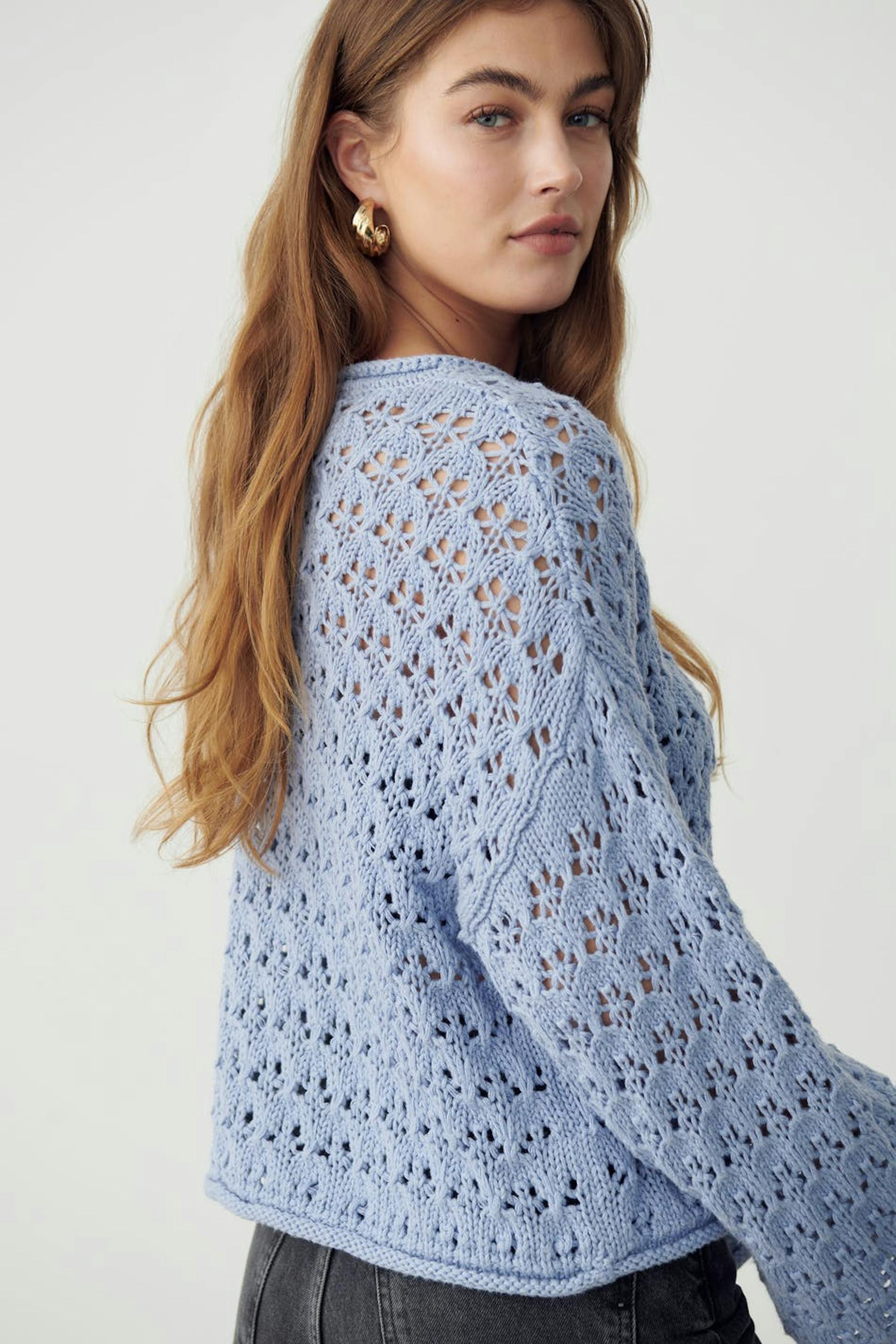 Knitted jumper with boxy fit. The jumper is blue and has hole details. It has round neckline and long, wide sleeves.