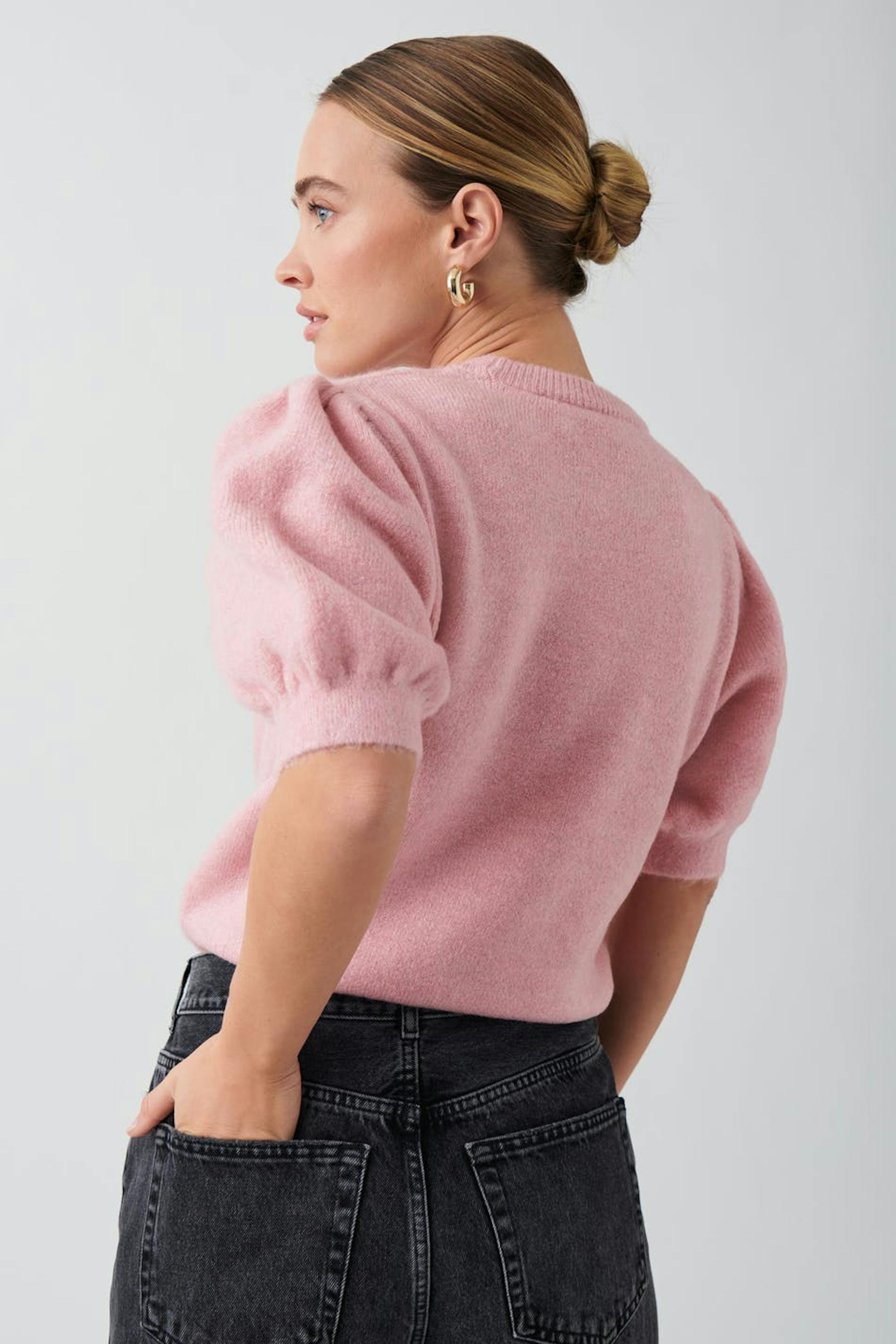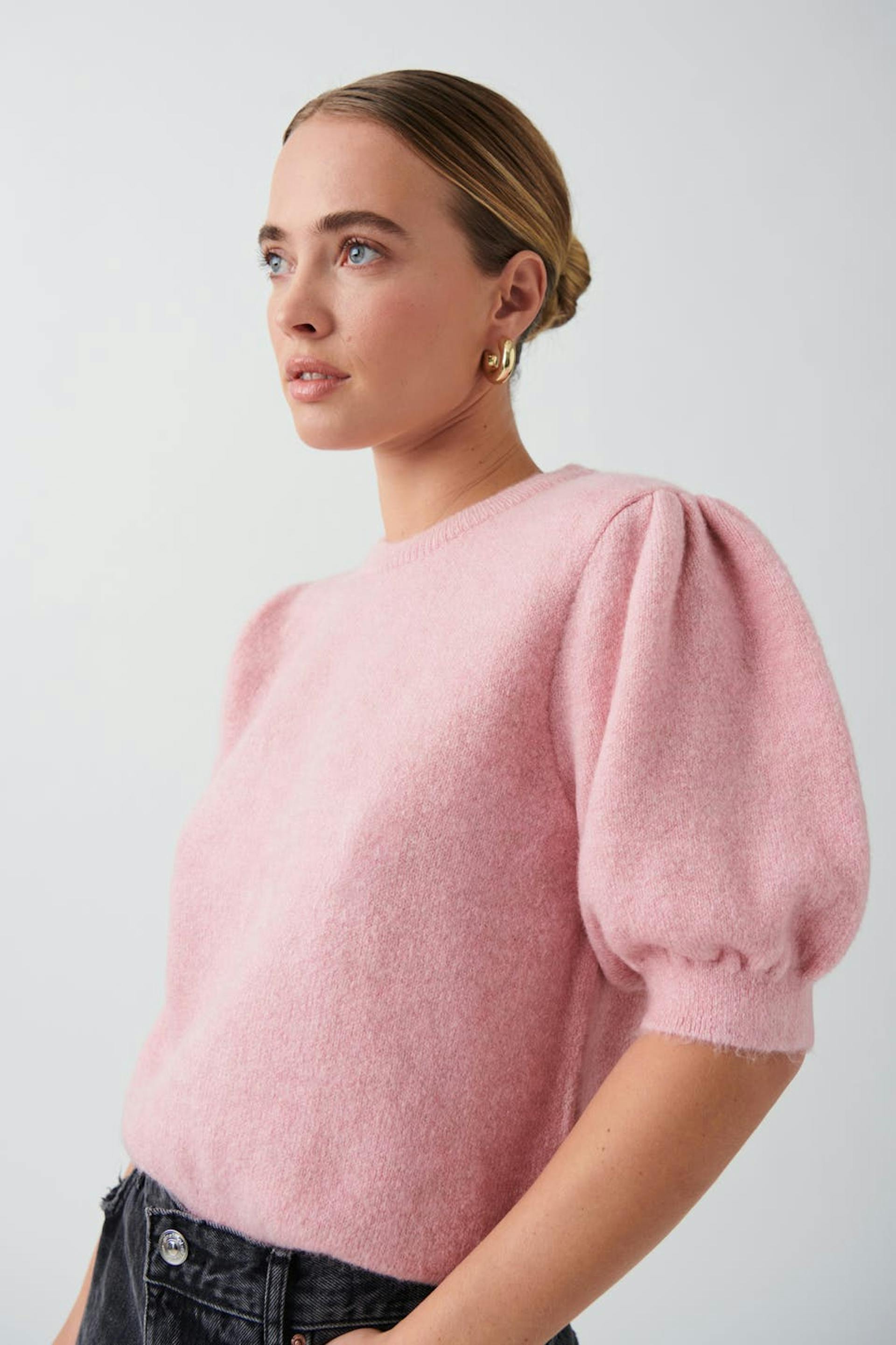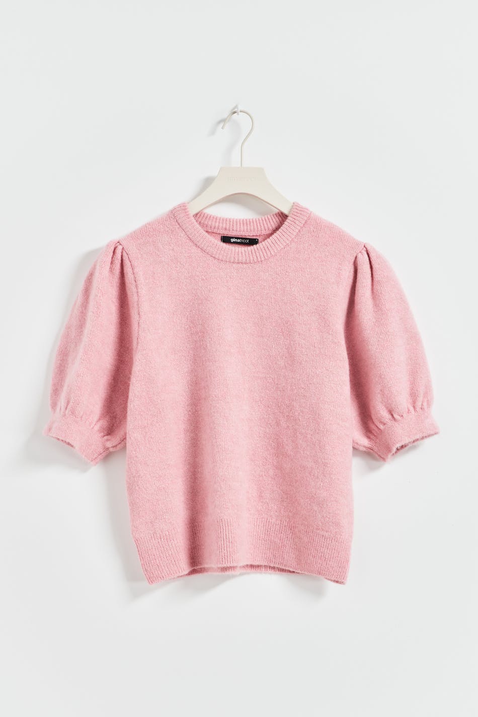 Knitted top with short puff sleeve. The top is pink and has round neckline. It has gathering around the shoulders and rib knit at sleeve ends and at the bottom.