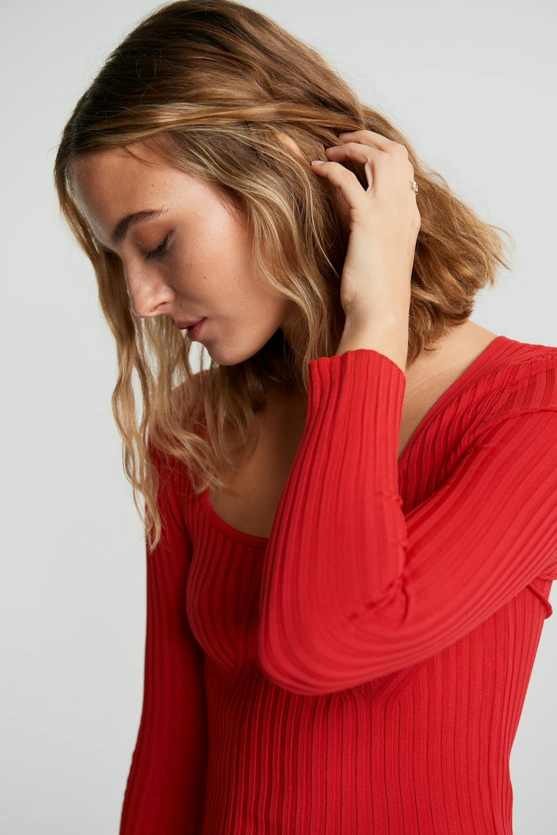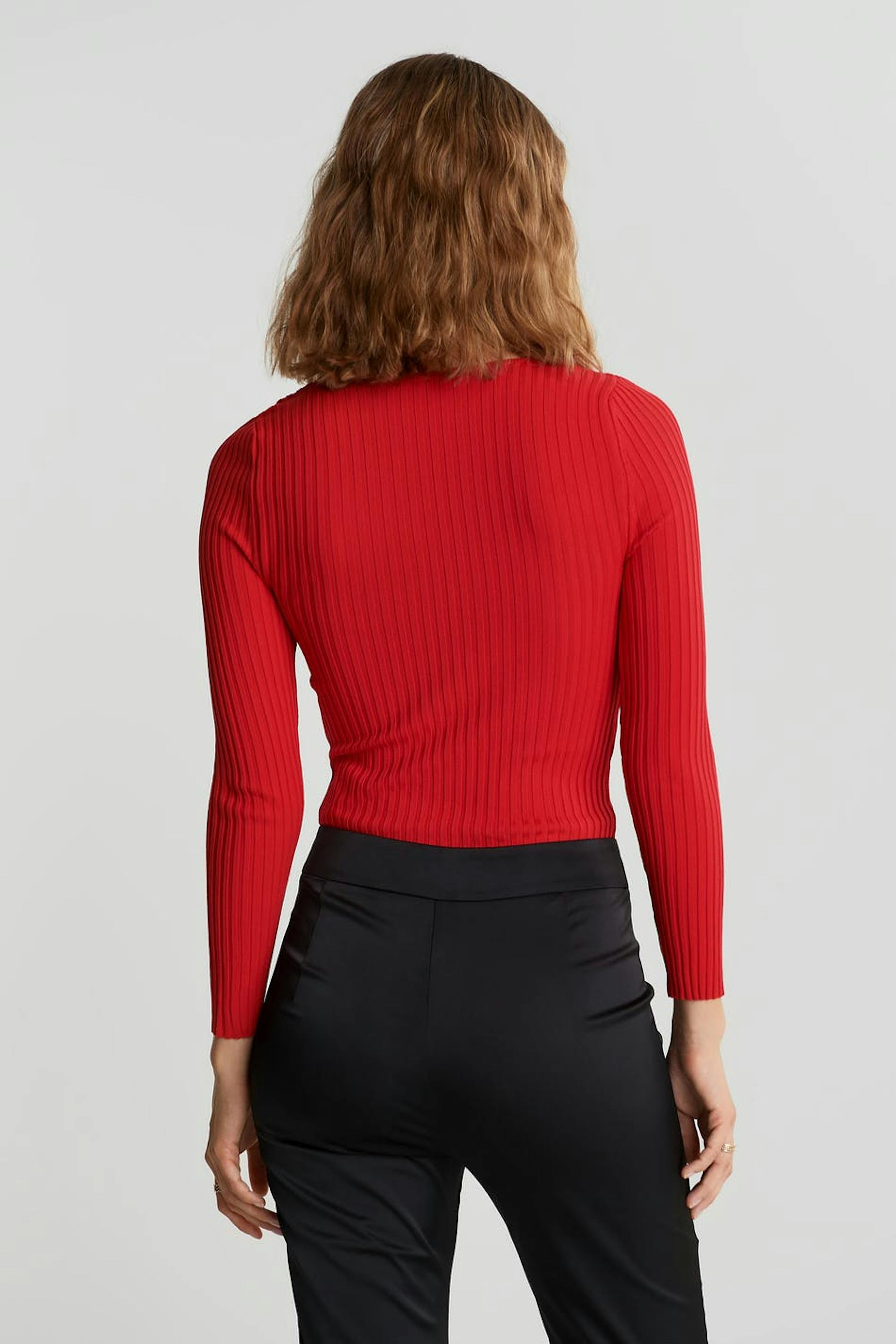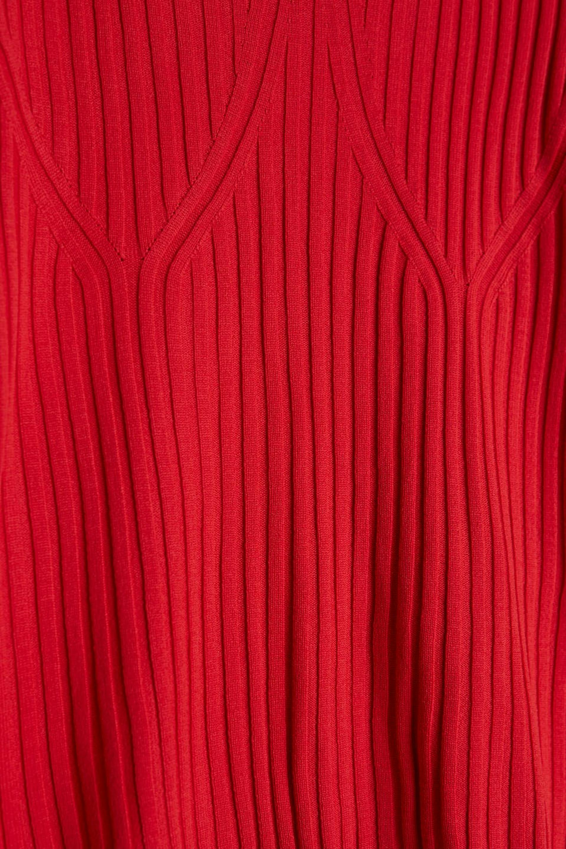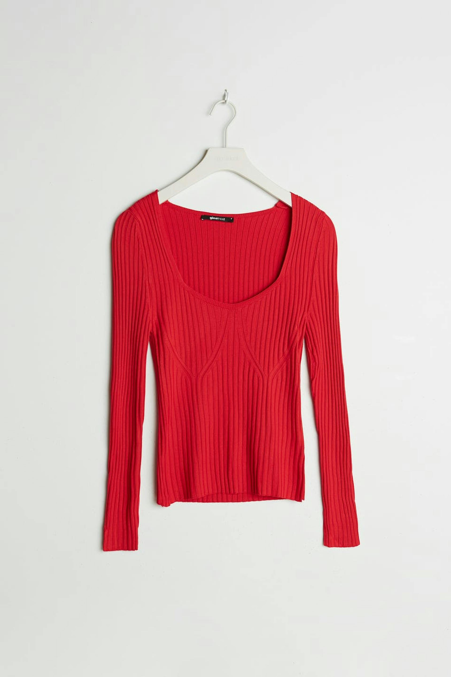 Rib-knit jumper with a heart-shaped neckline. The jumper is red and long-sleeved and has a fitted fit. It has ribbed details on the front.