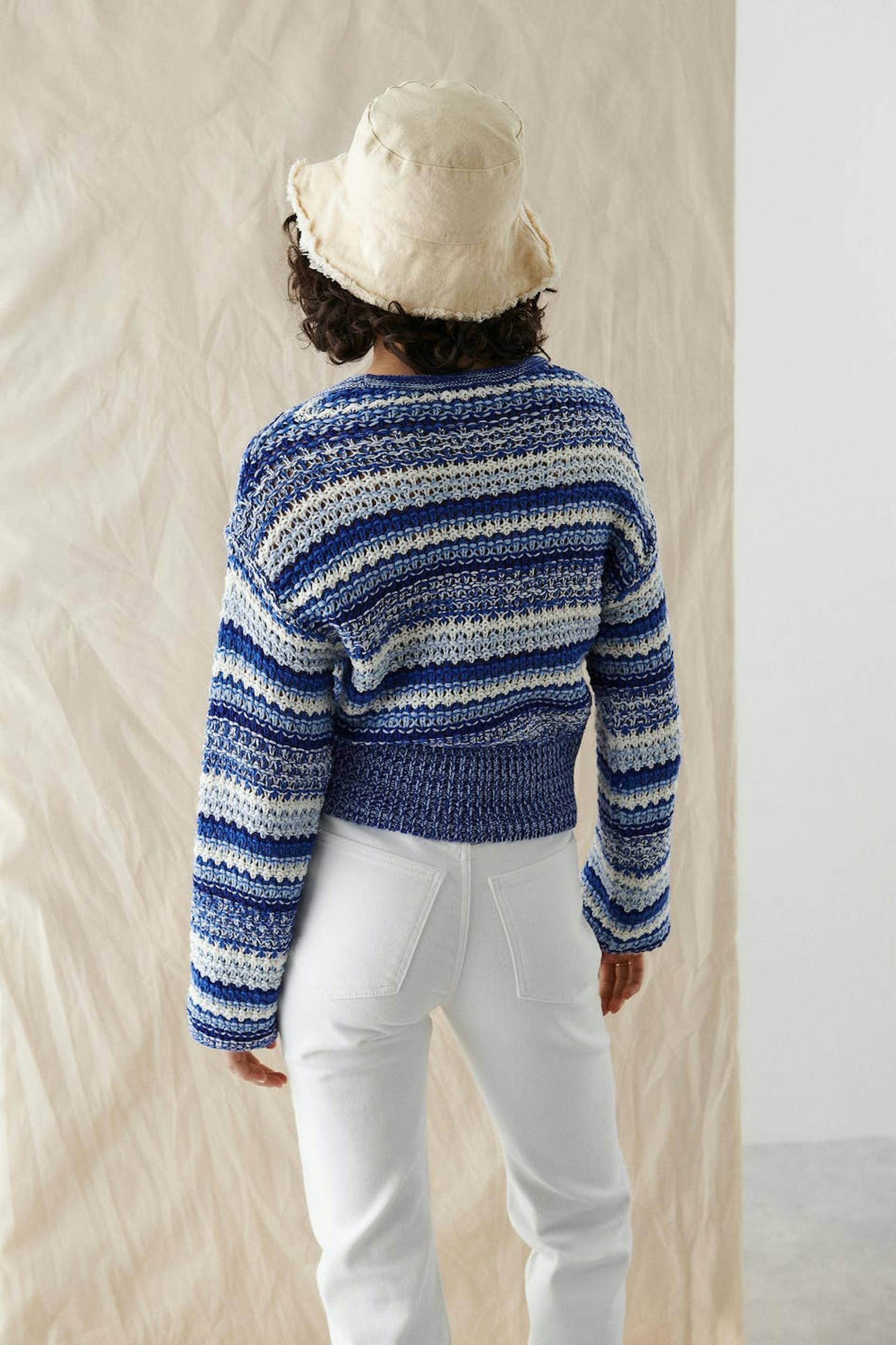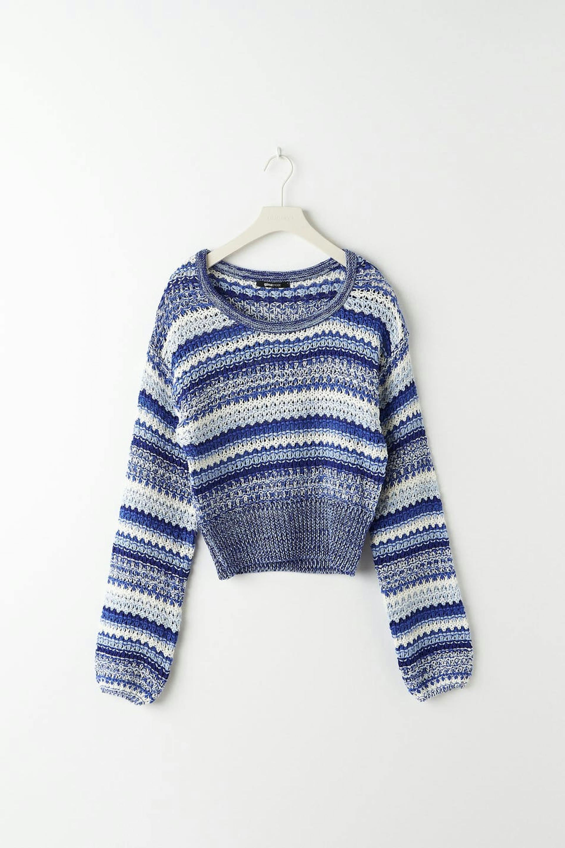 Striped knitted sweater with a rounded neckline. The sweat is blue and has a cropped length. It has a ribbed hem and dropped shoulders.