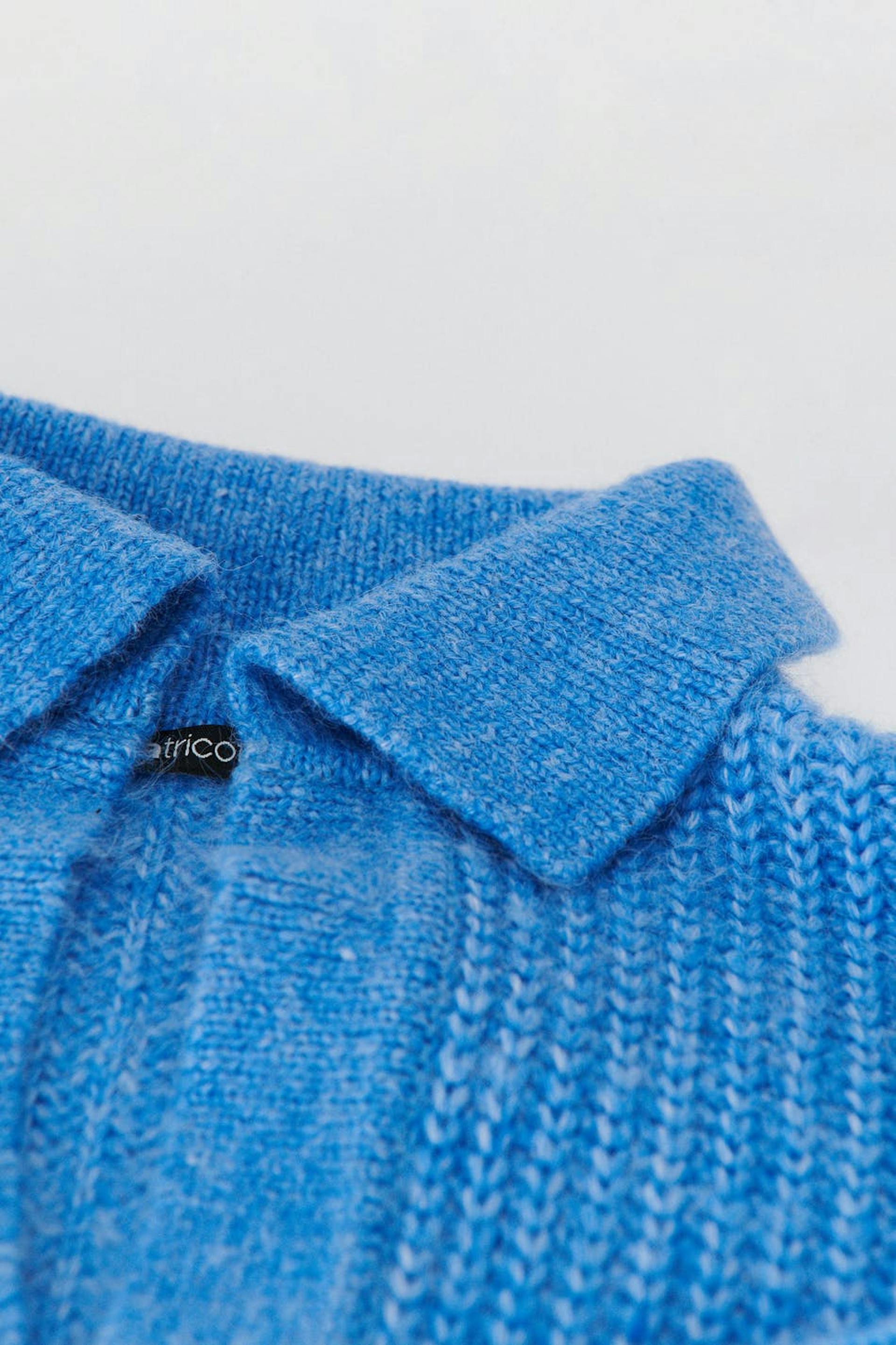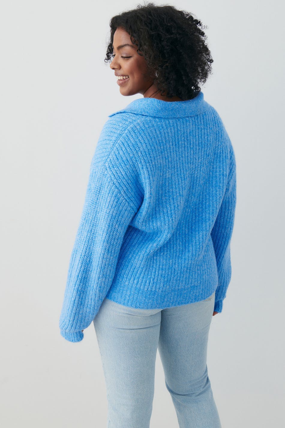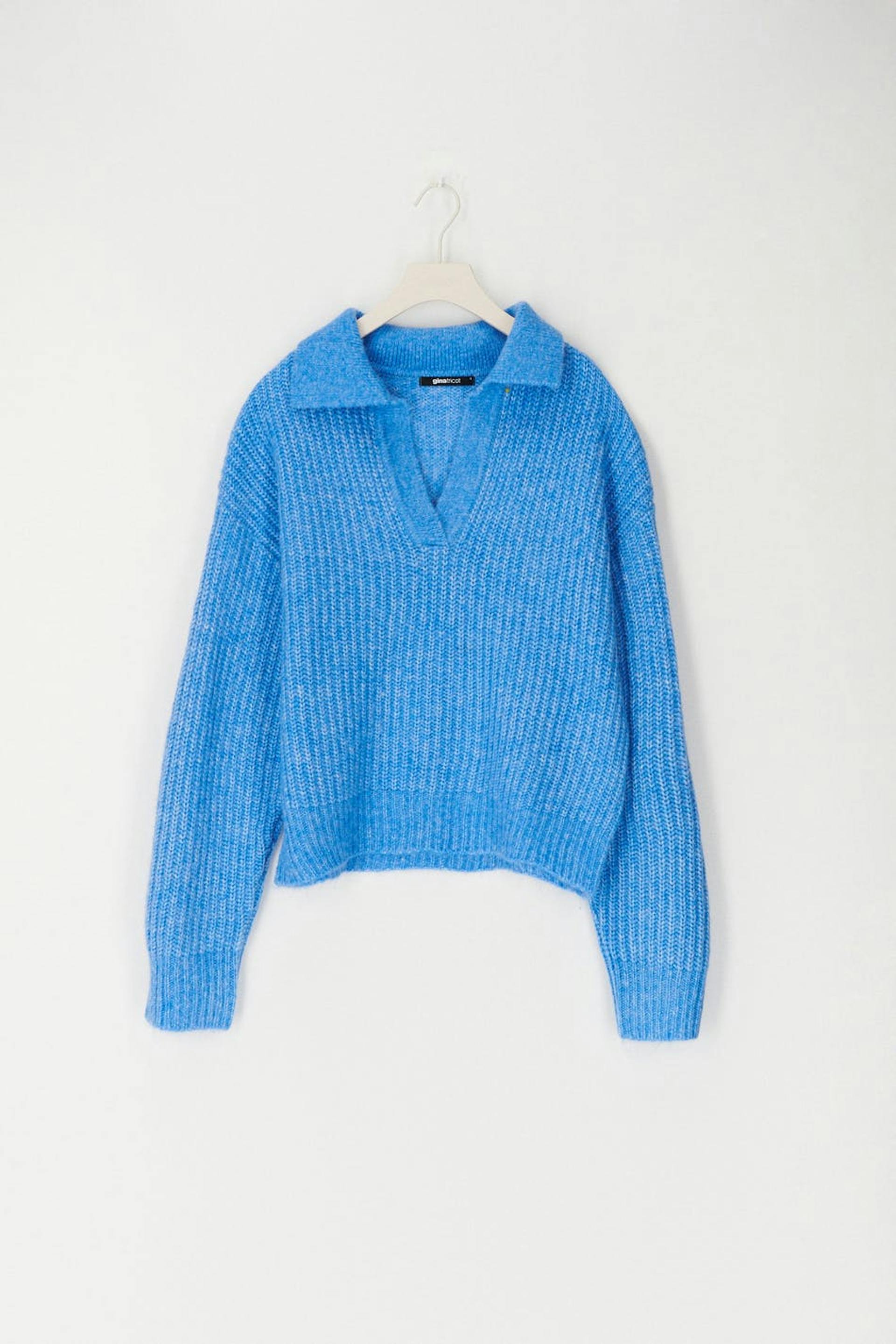 Knitted sweater with boxy fit. The sweat is blue and has collar with wrapover V-neck.