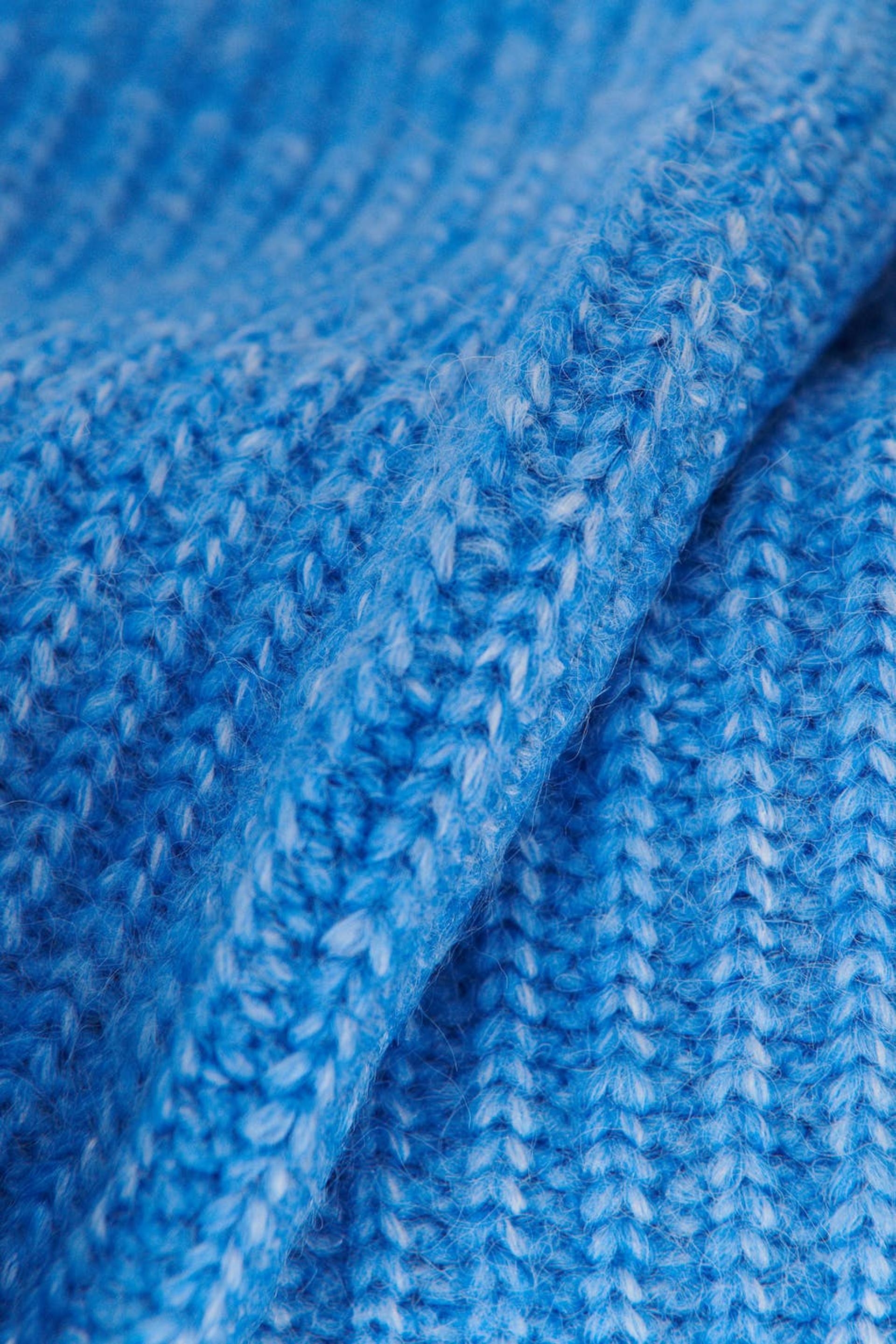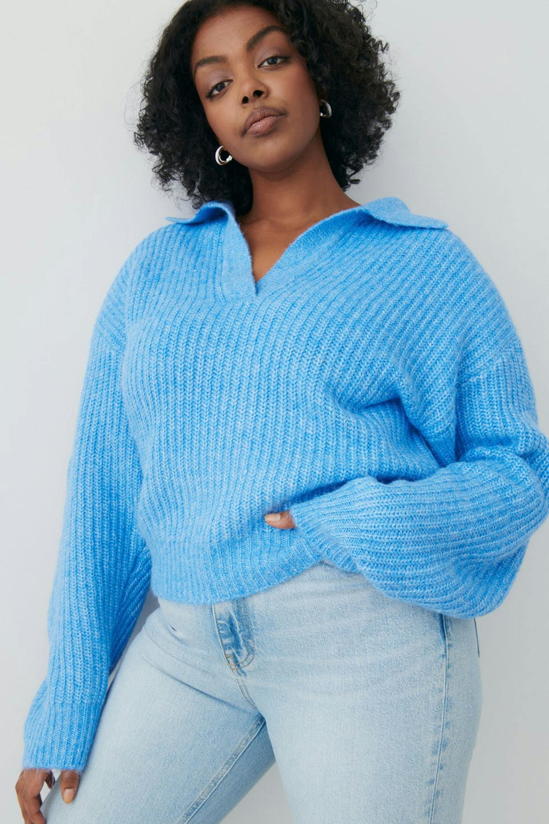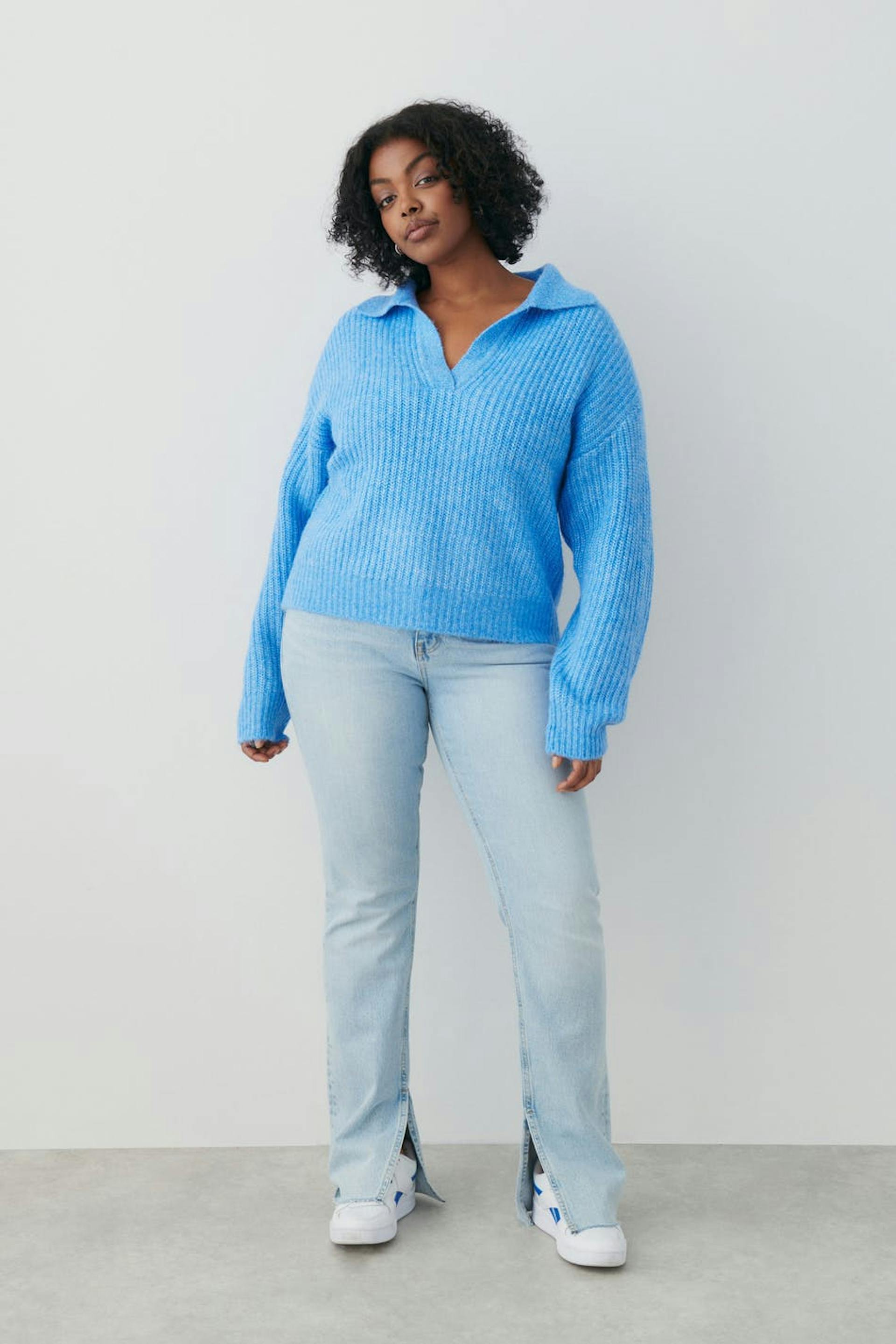 Knitted sweater with boxy fit. The sweat is blue and has collar with wrapover V-neck.