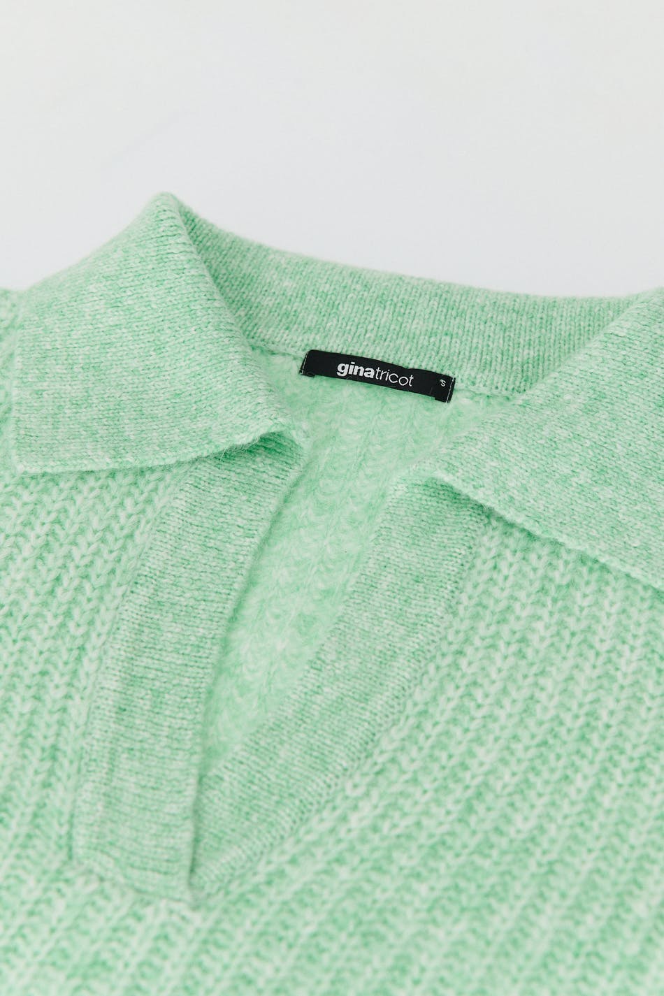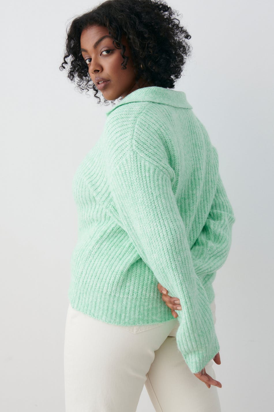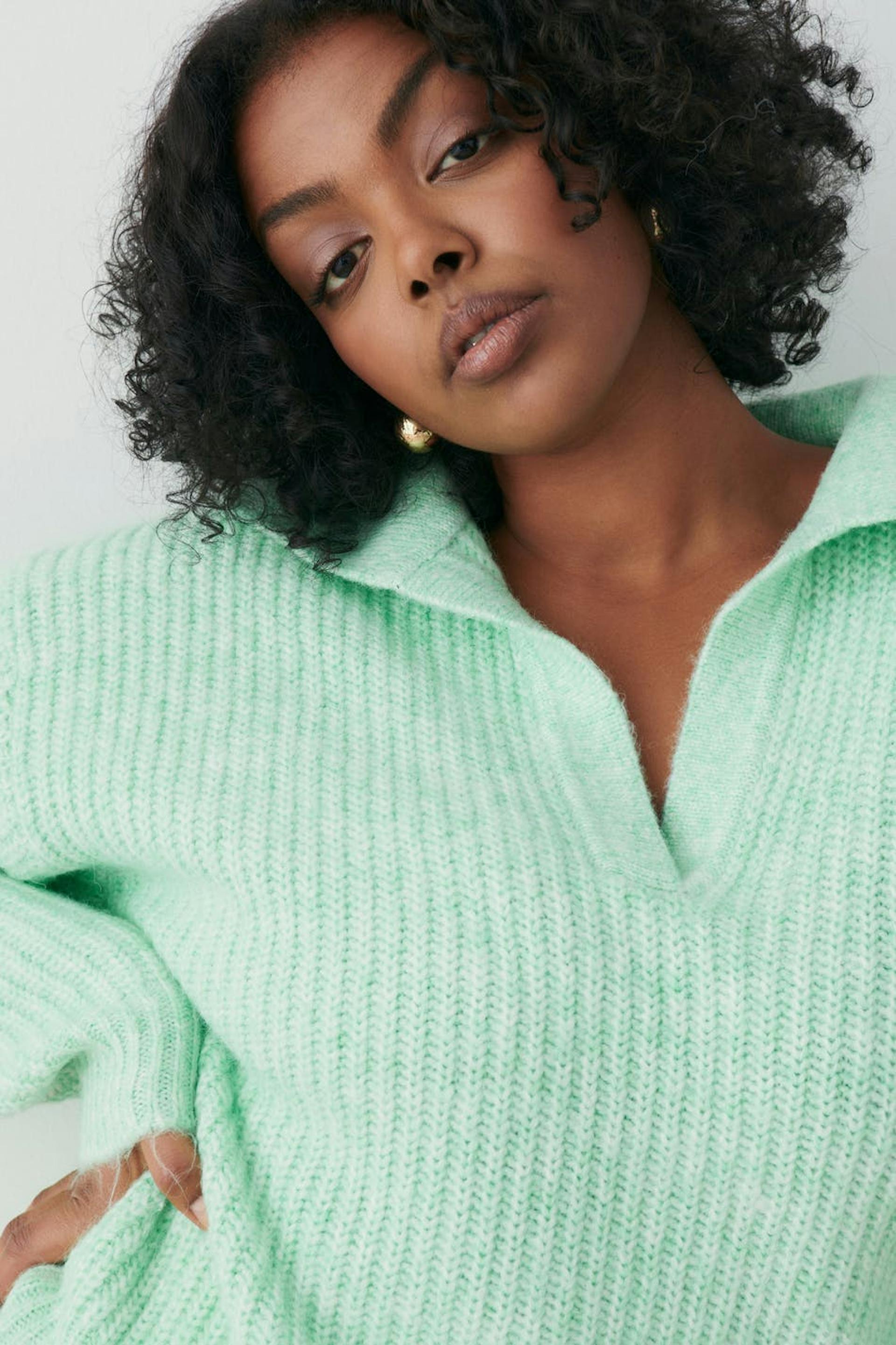 Knitted sweater with boxy fit. The sweat is green and has collar with wrapover V-neck.