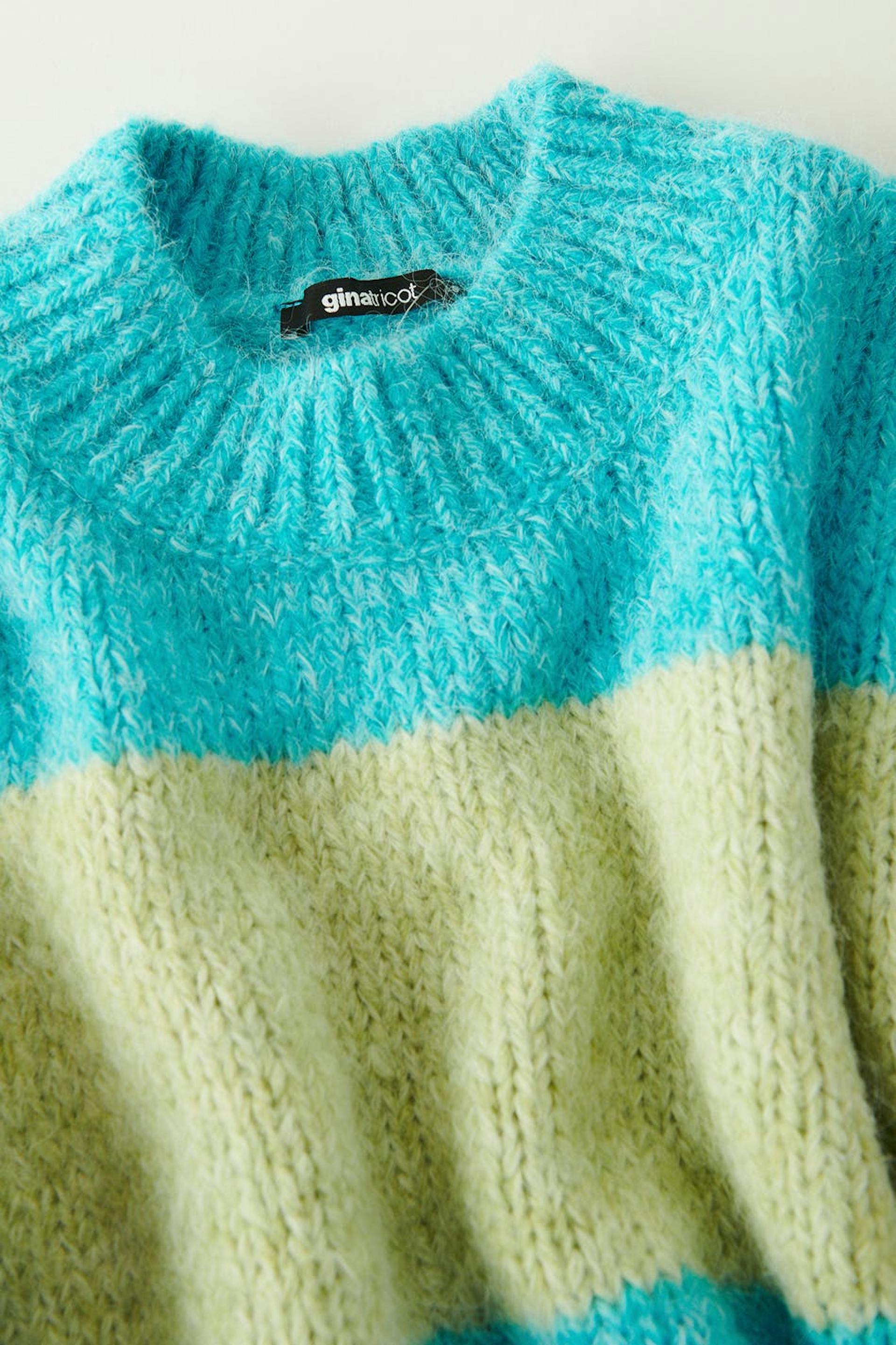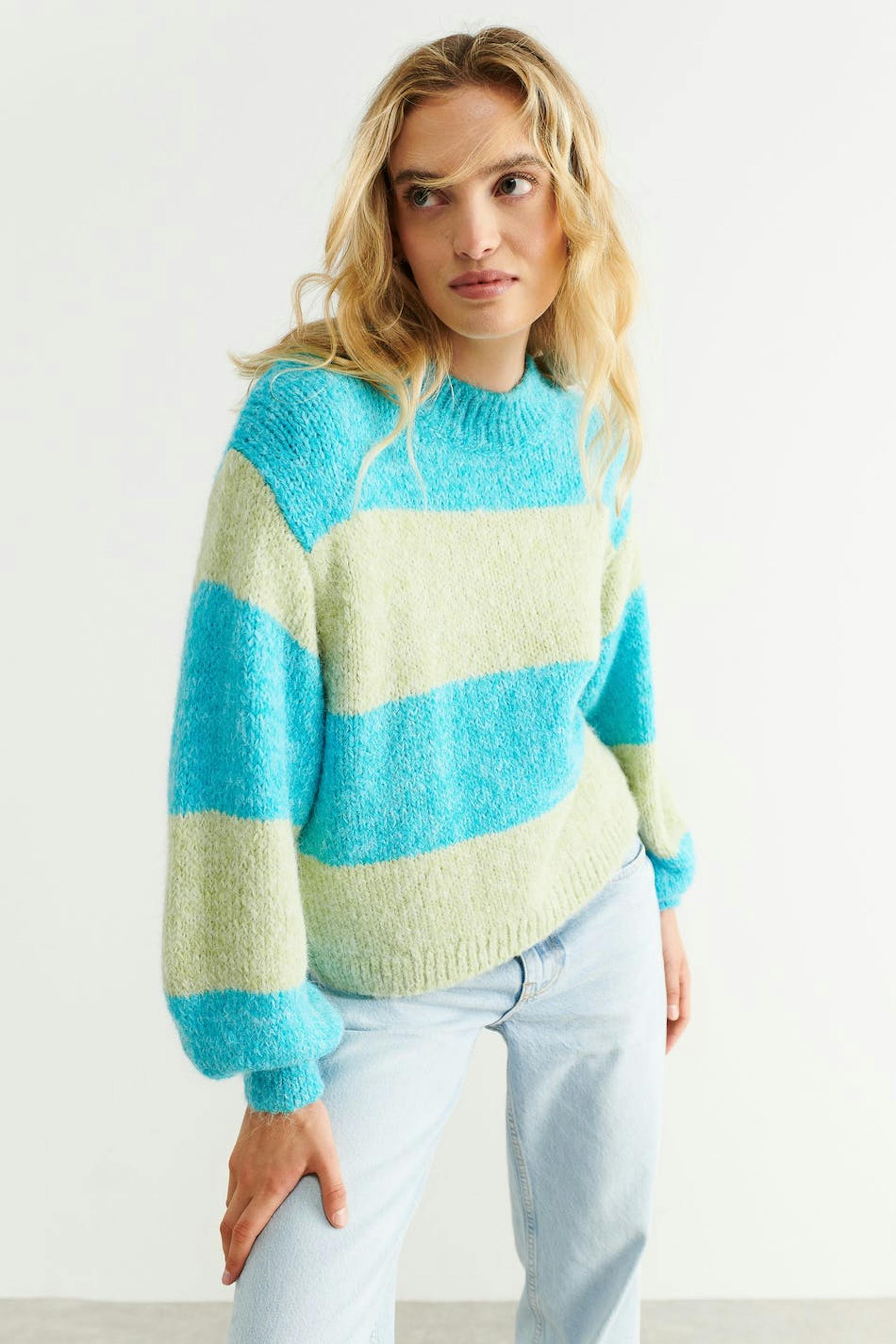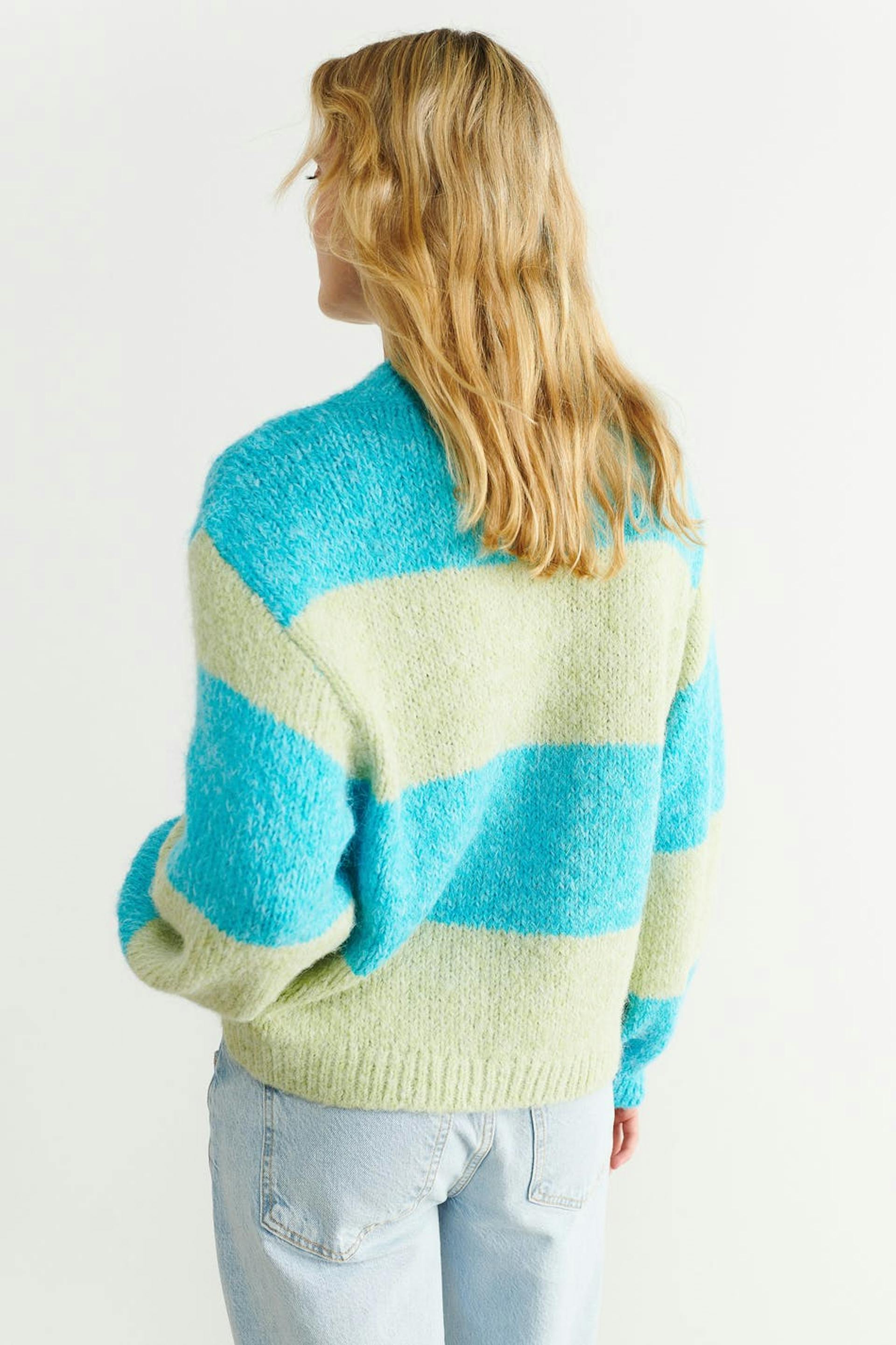 Striped knitted sweater with a loose-fitting style. The sweat is blue and has a rounded neckline.