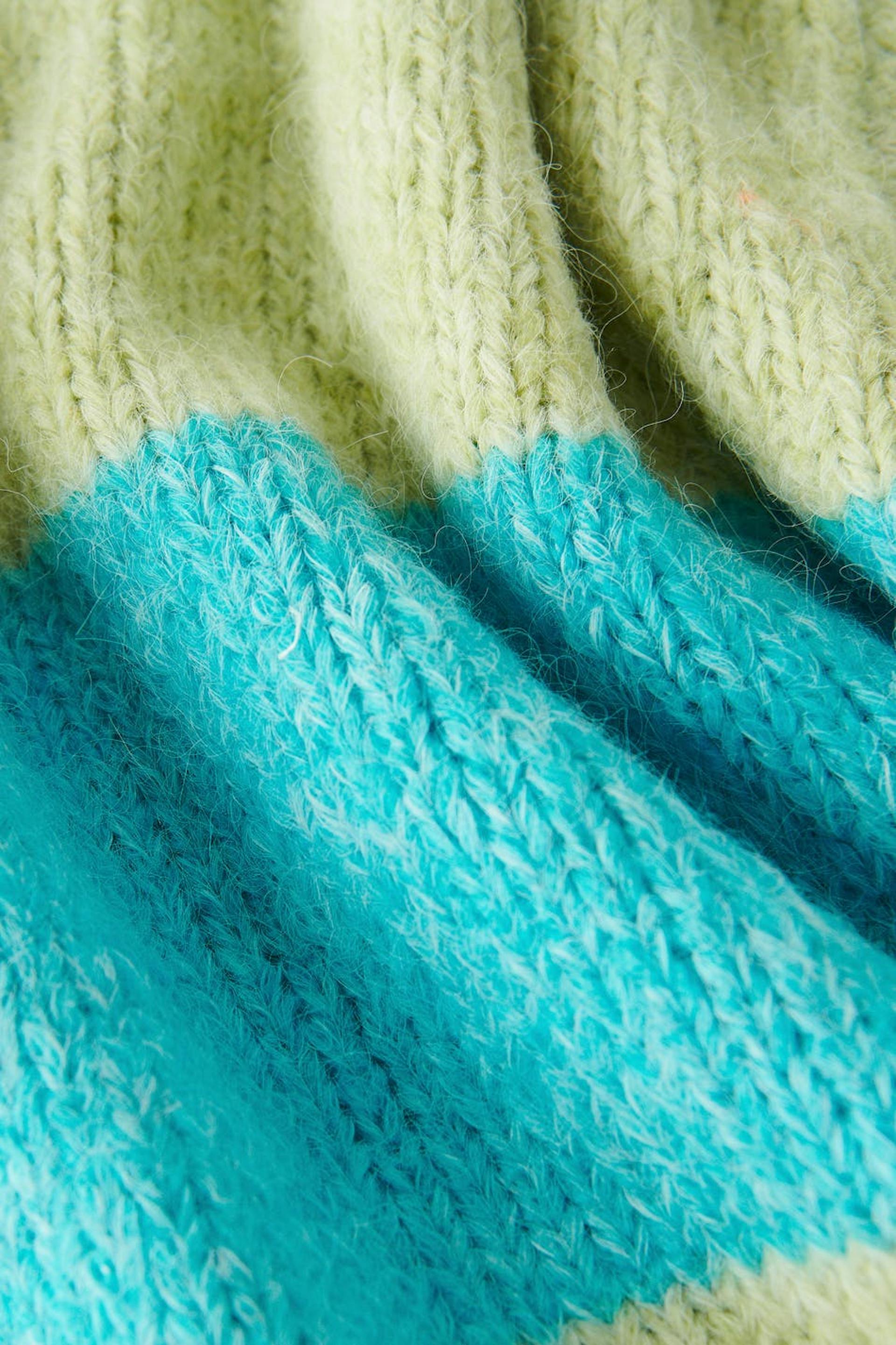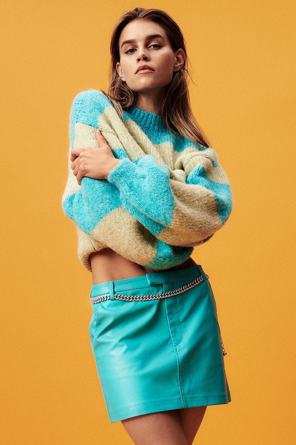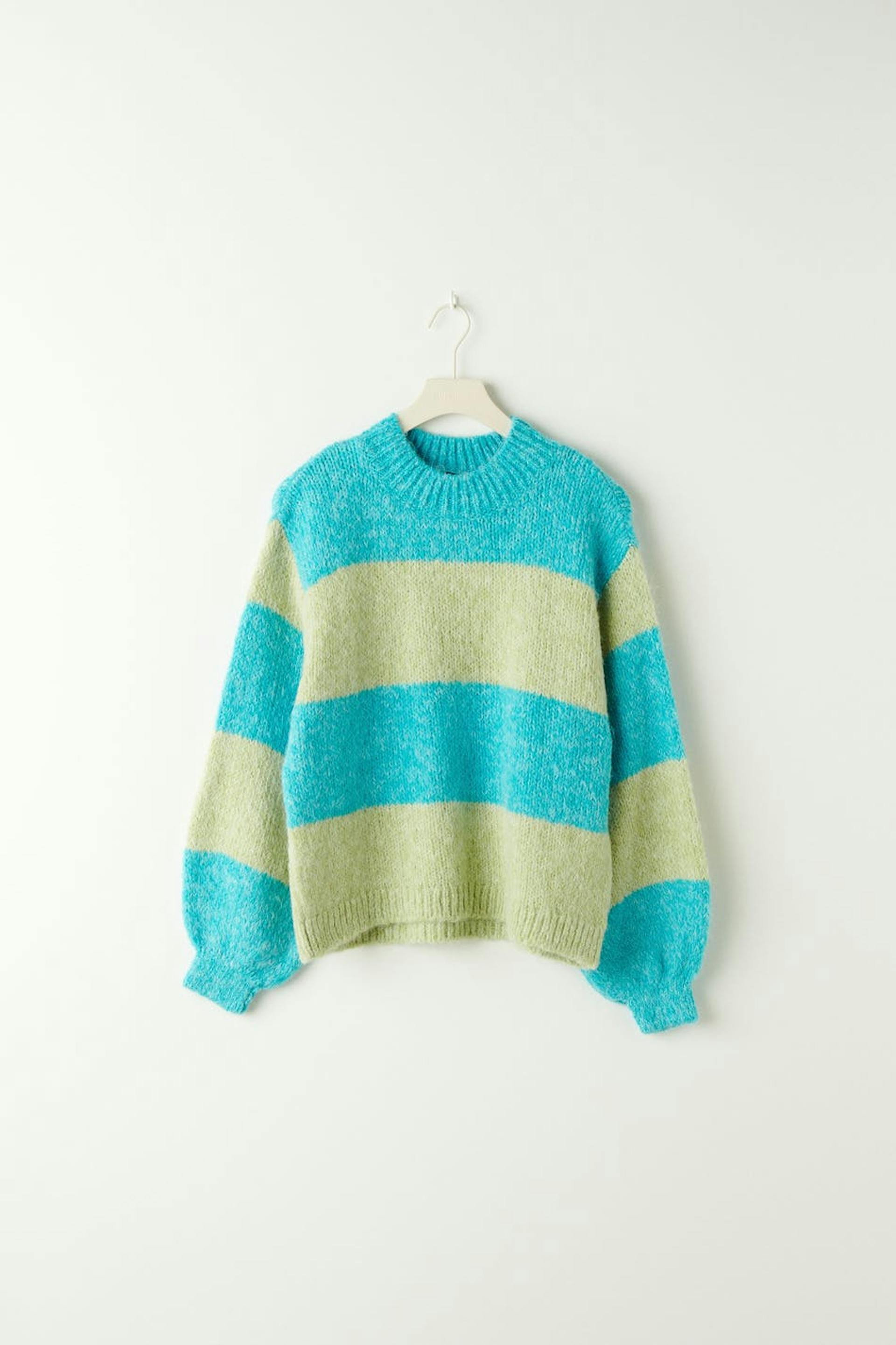 Striped knitted sweater with a loose-fitting style. The sweat is blue and has a rounded neckline.