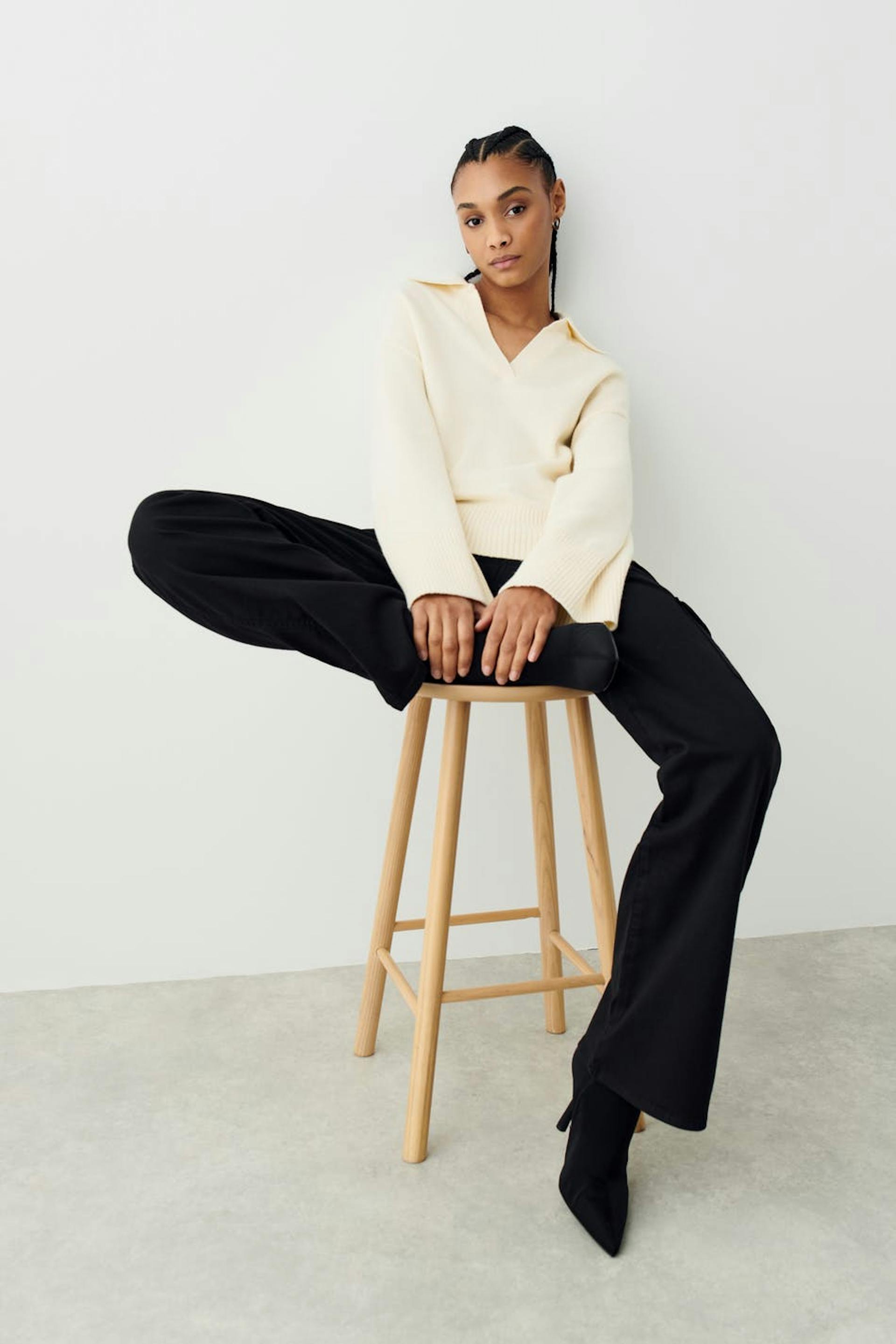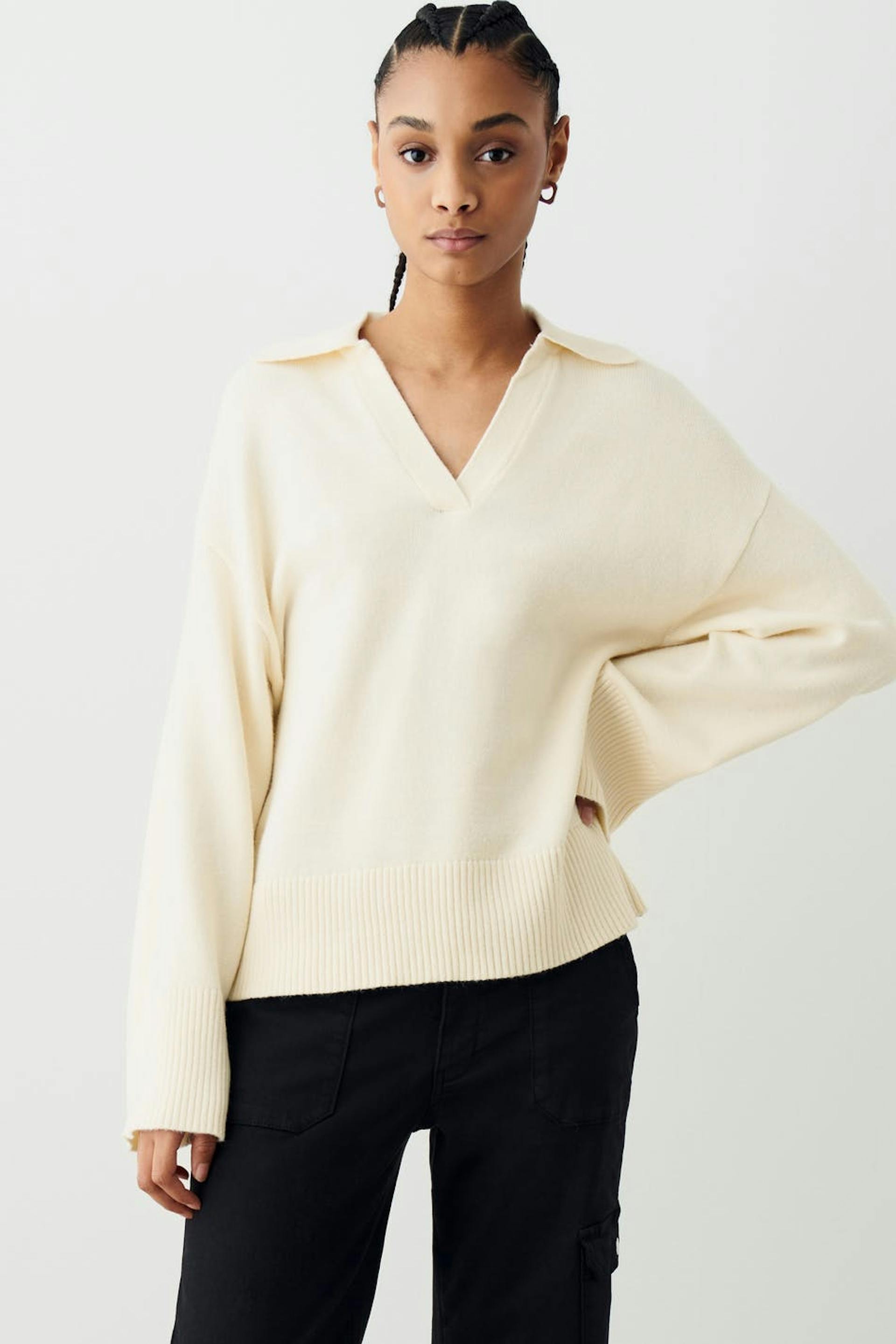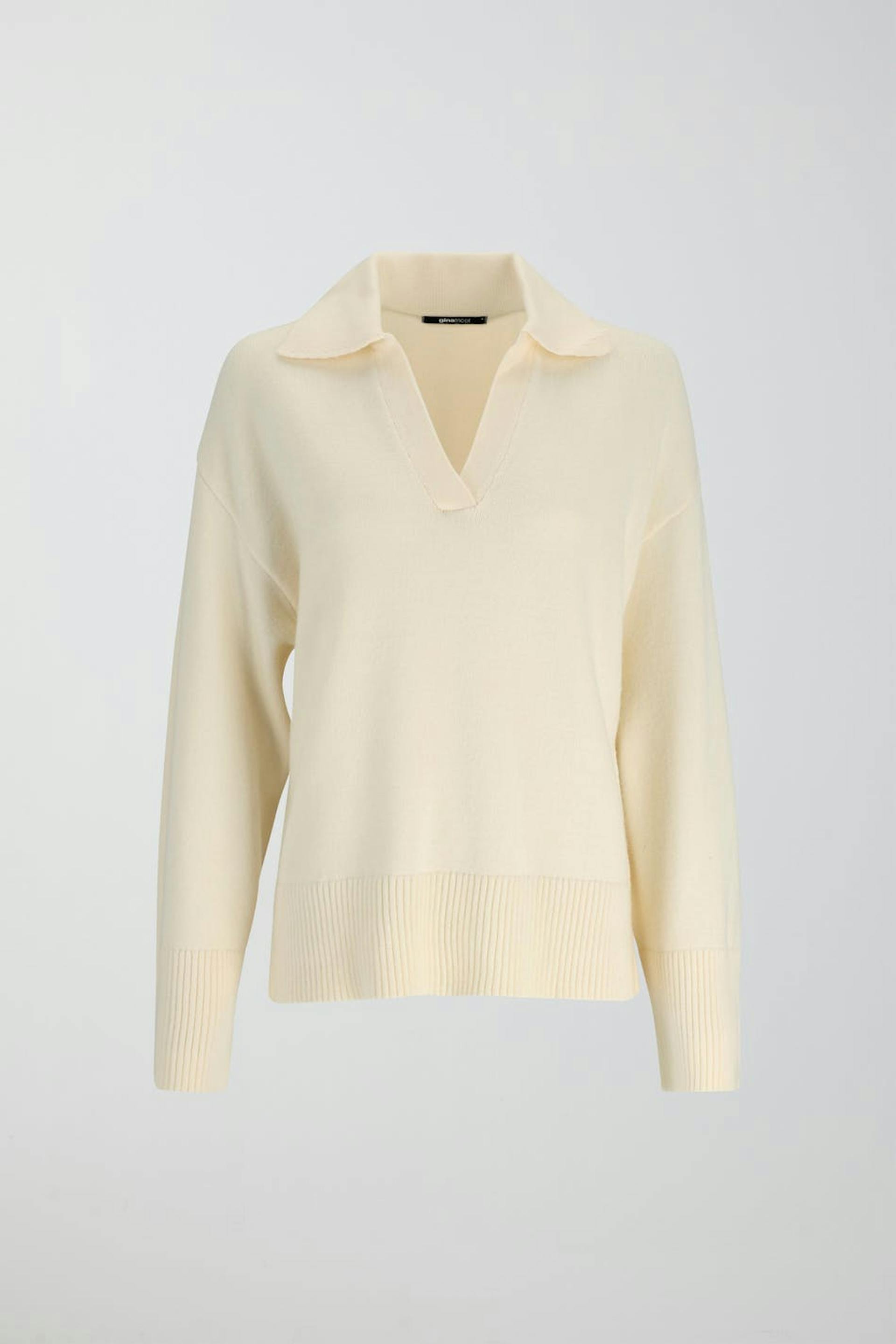 Knitted sweater with collar. The sweat is white and has wrapover V-neck. It has boxy fit and rib knit at sleeve ends and at the bottom.