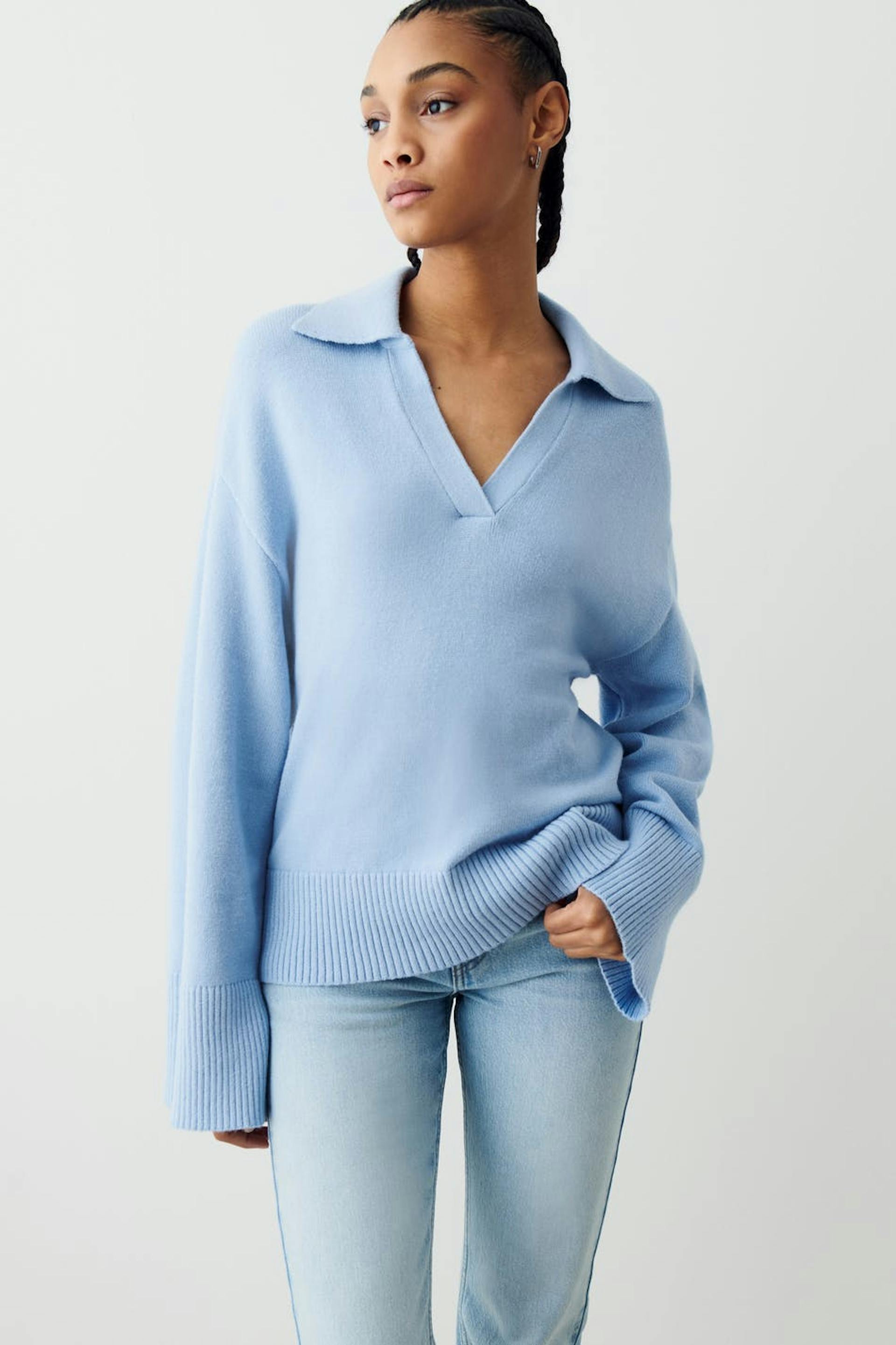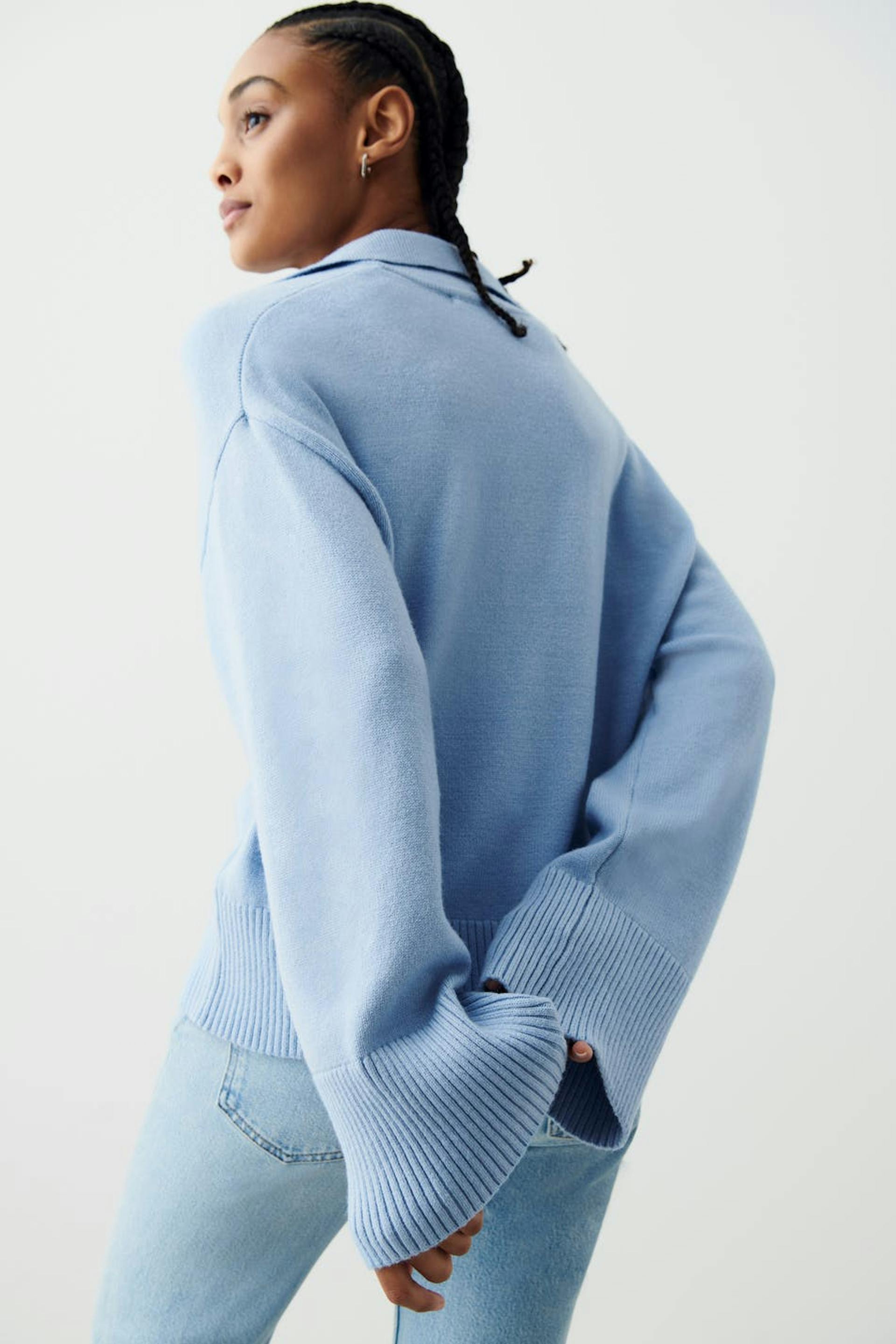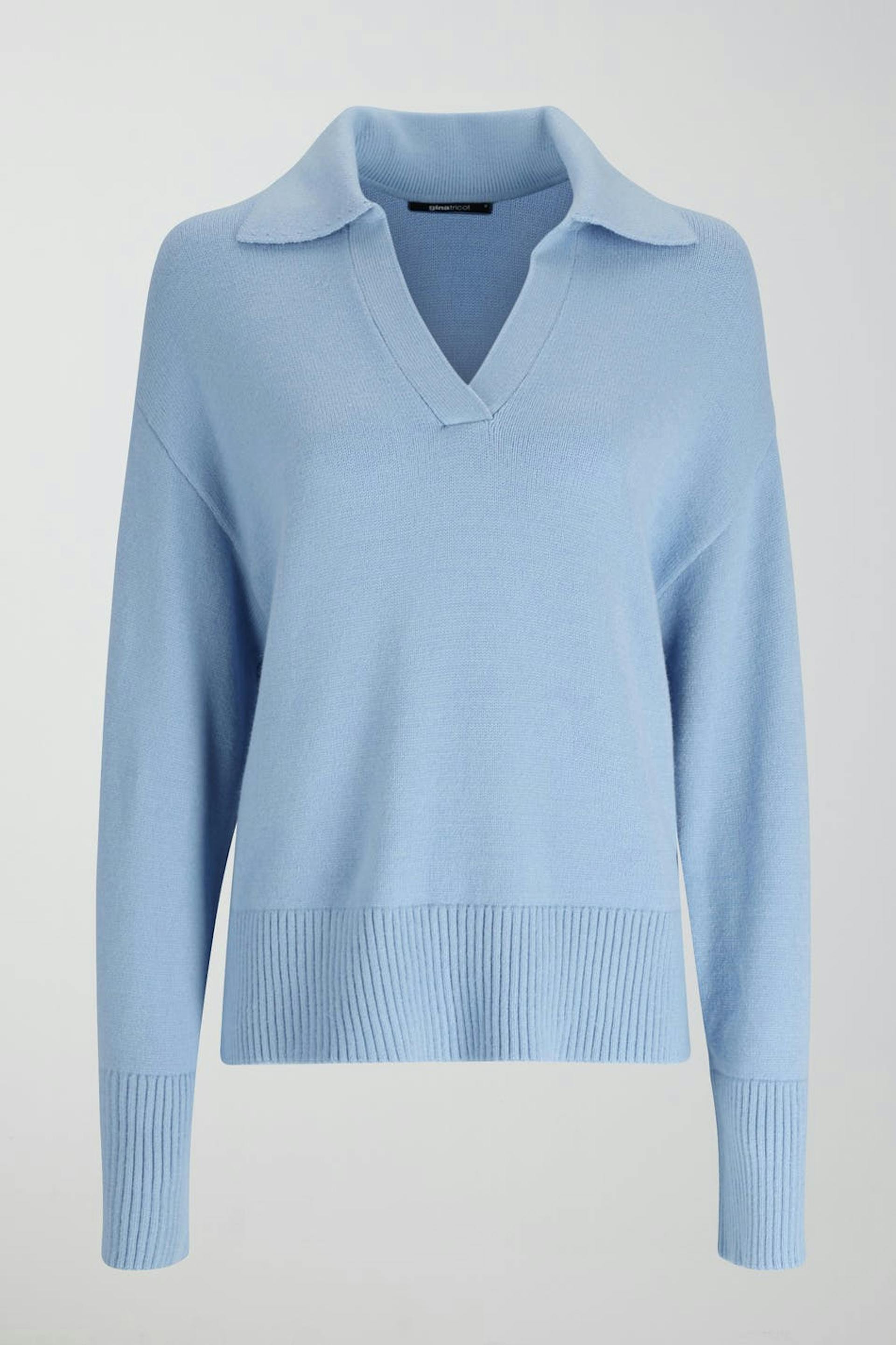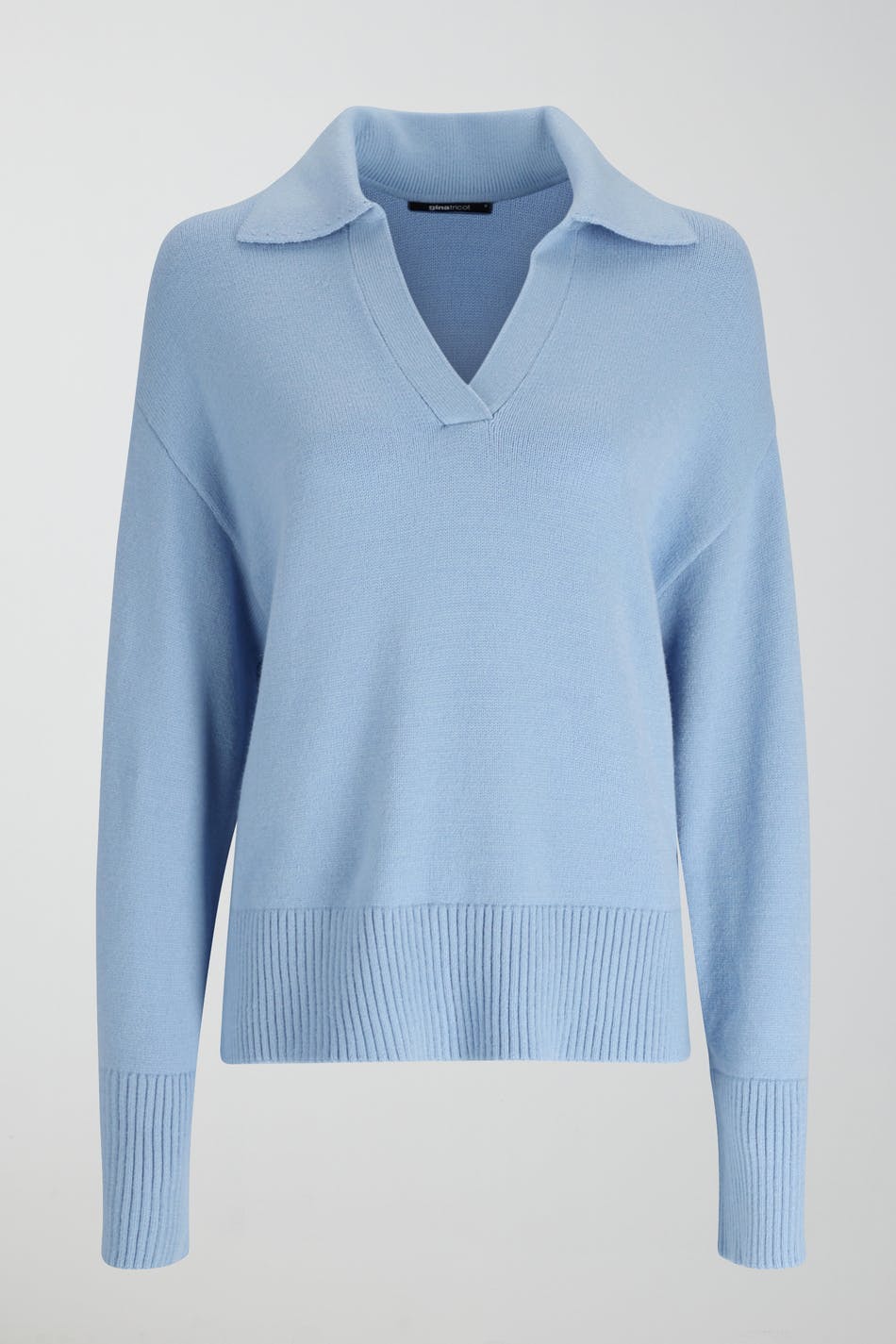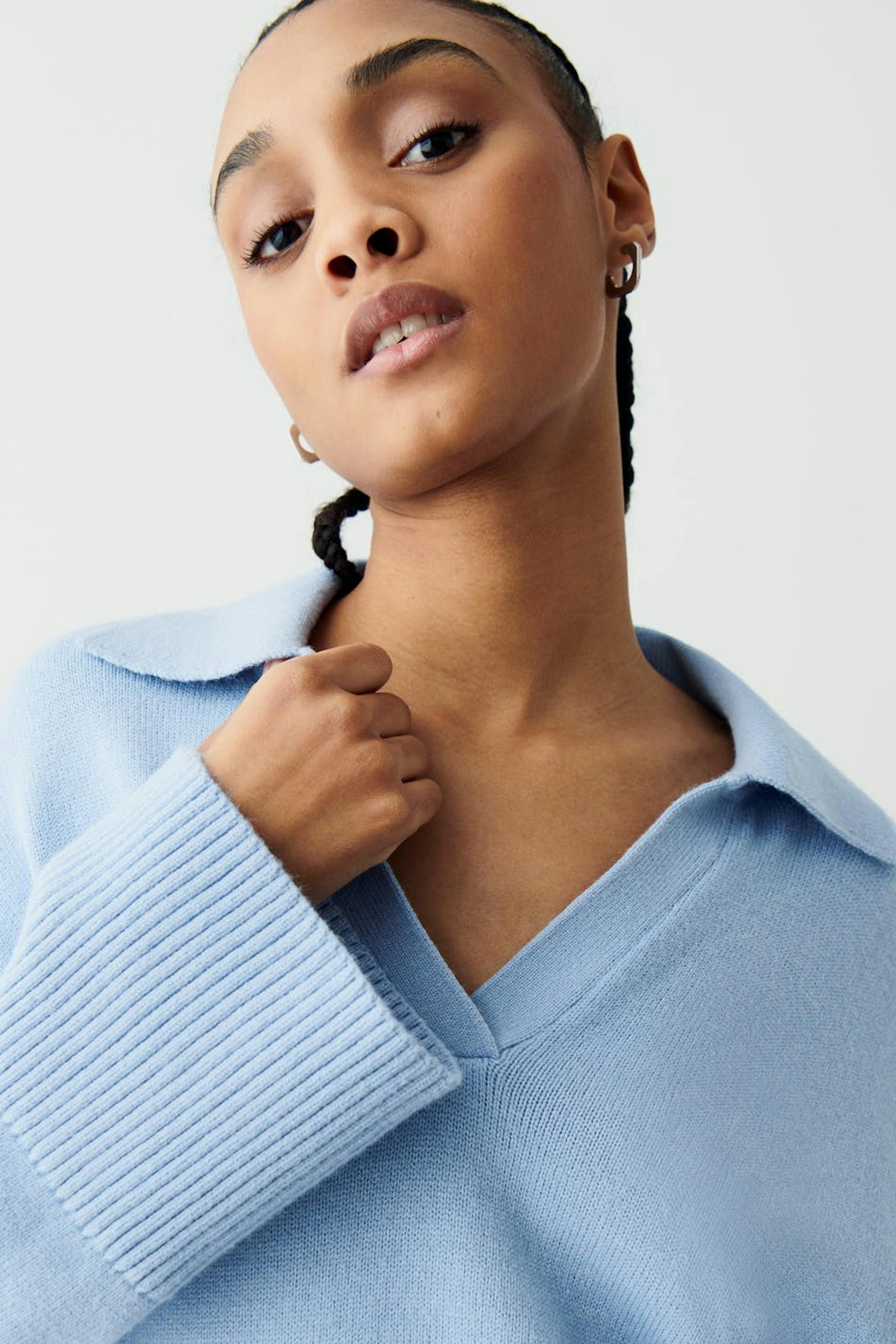 Knitted sweater with collar. The sweat is blue and has wrapover V-neck. It has boxy fit and rib knit at sleeve ends and at the bottom.