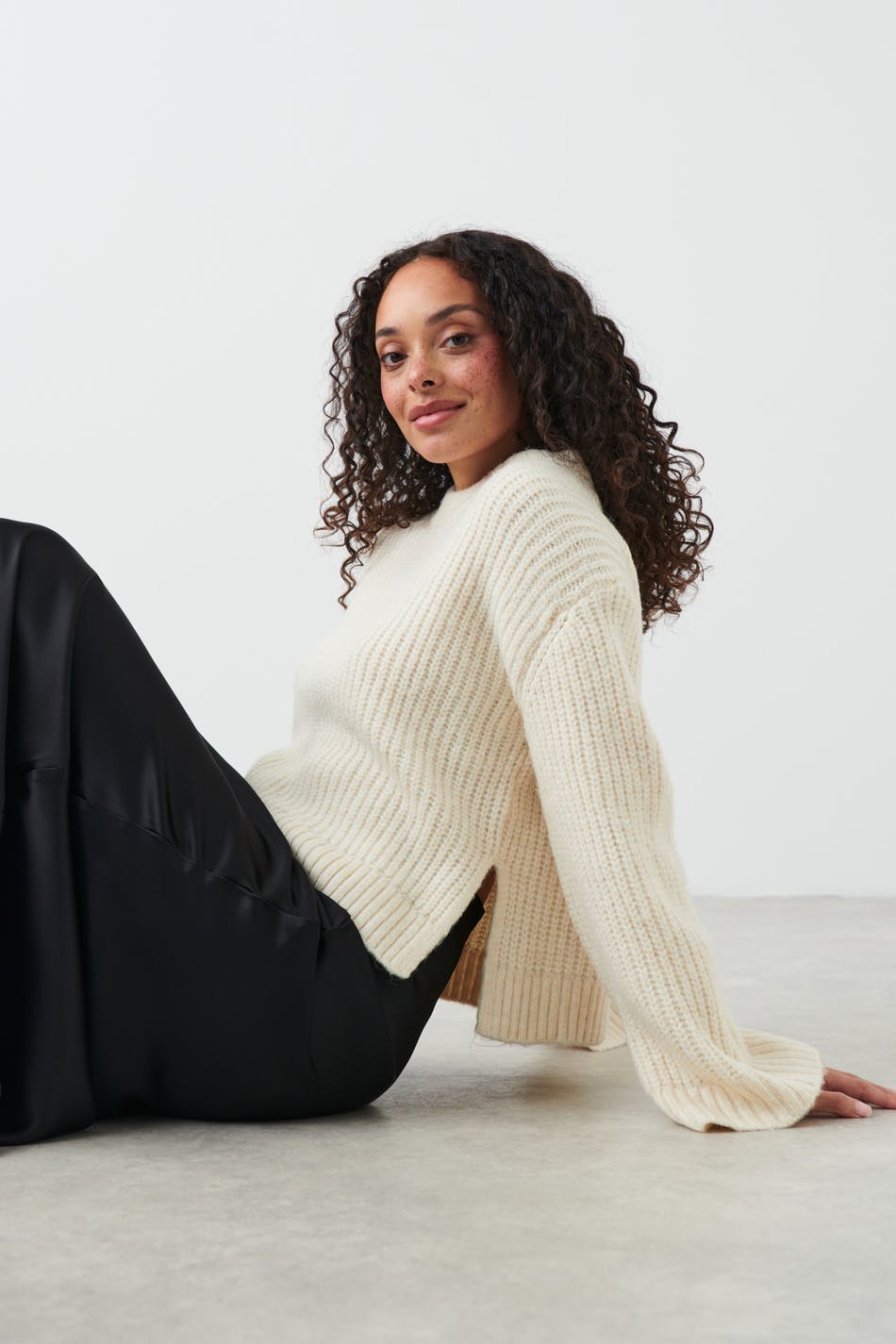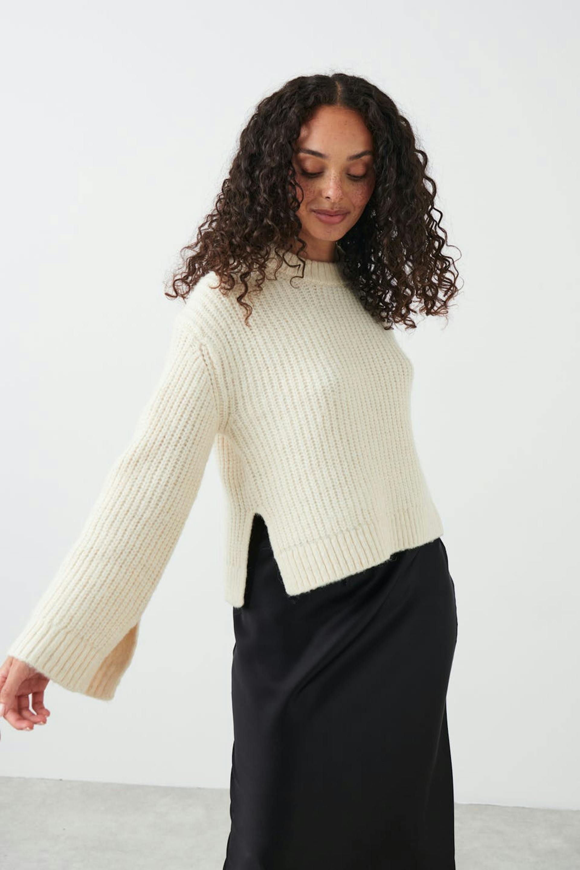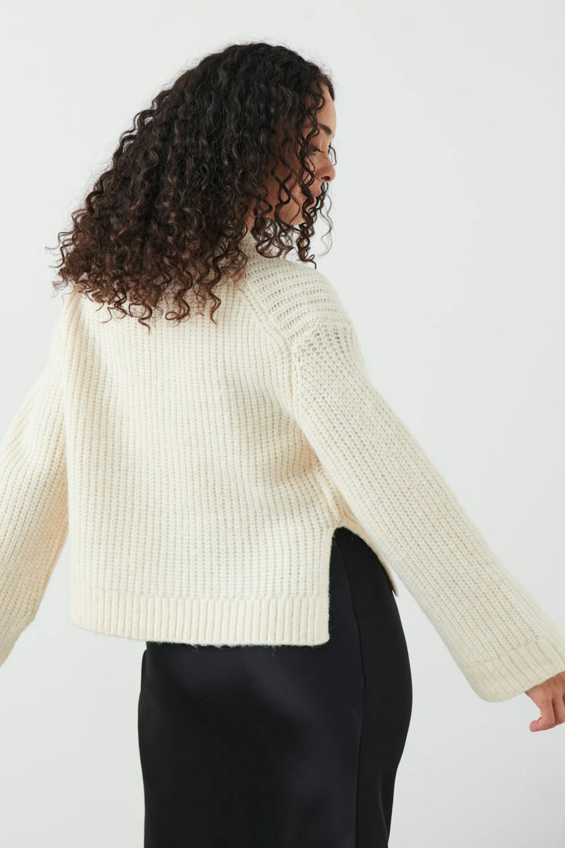 Knitted sweater with round neckline. The sweat is white and has boxy fit. It has straight sleeve, slit in the sides and rib knit at sleeve ends and at the bottom.