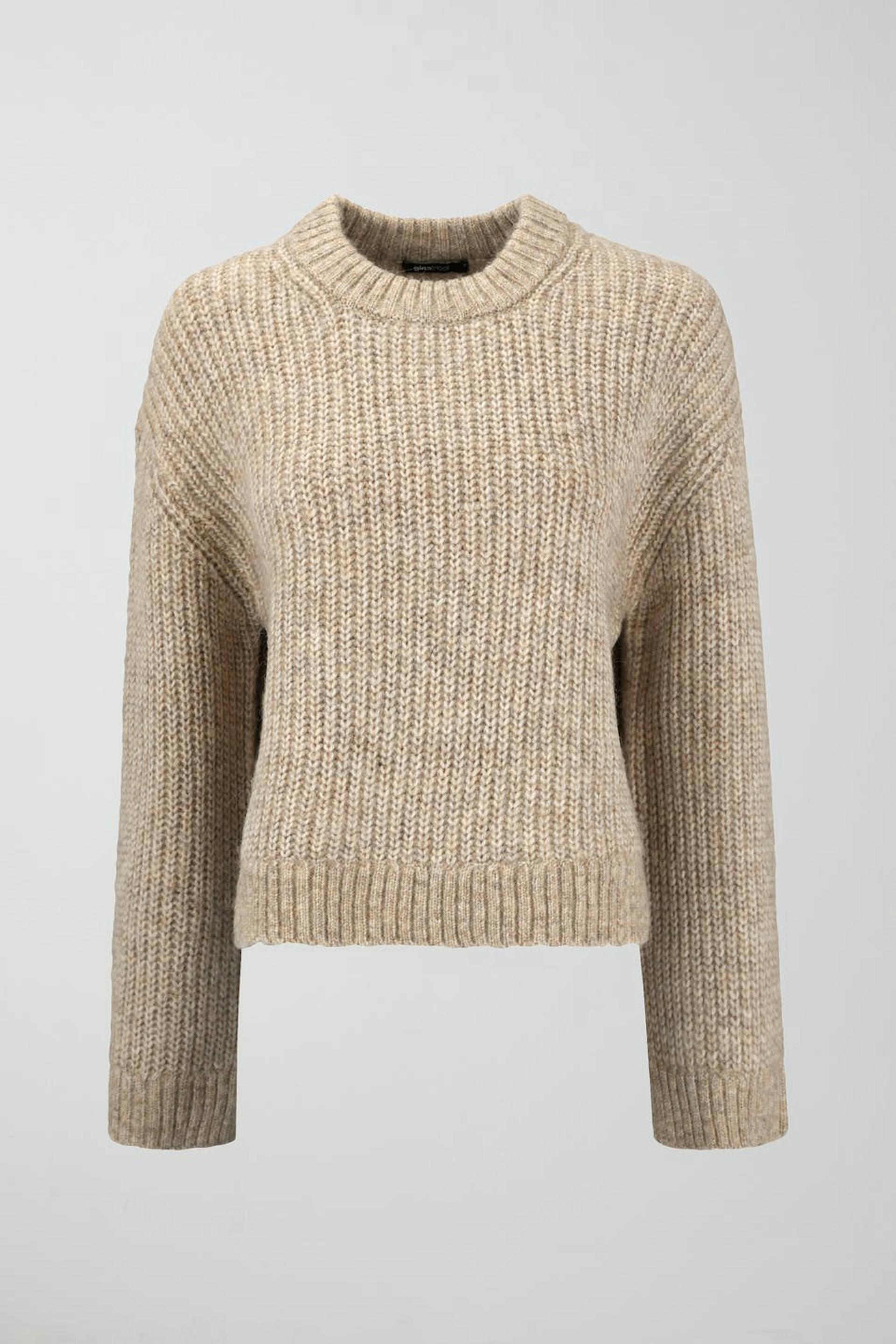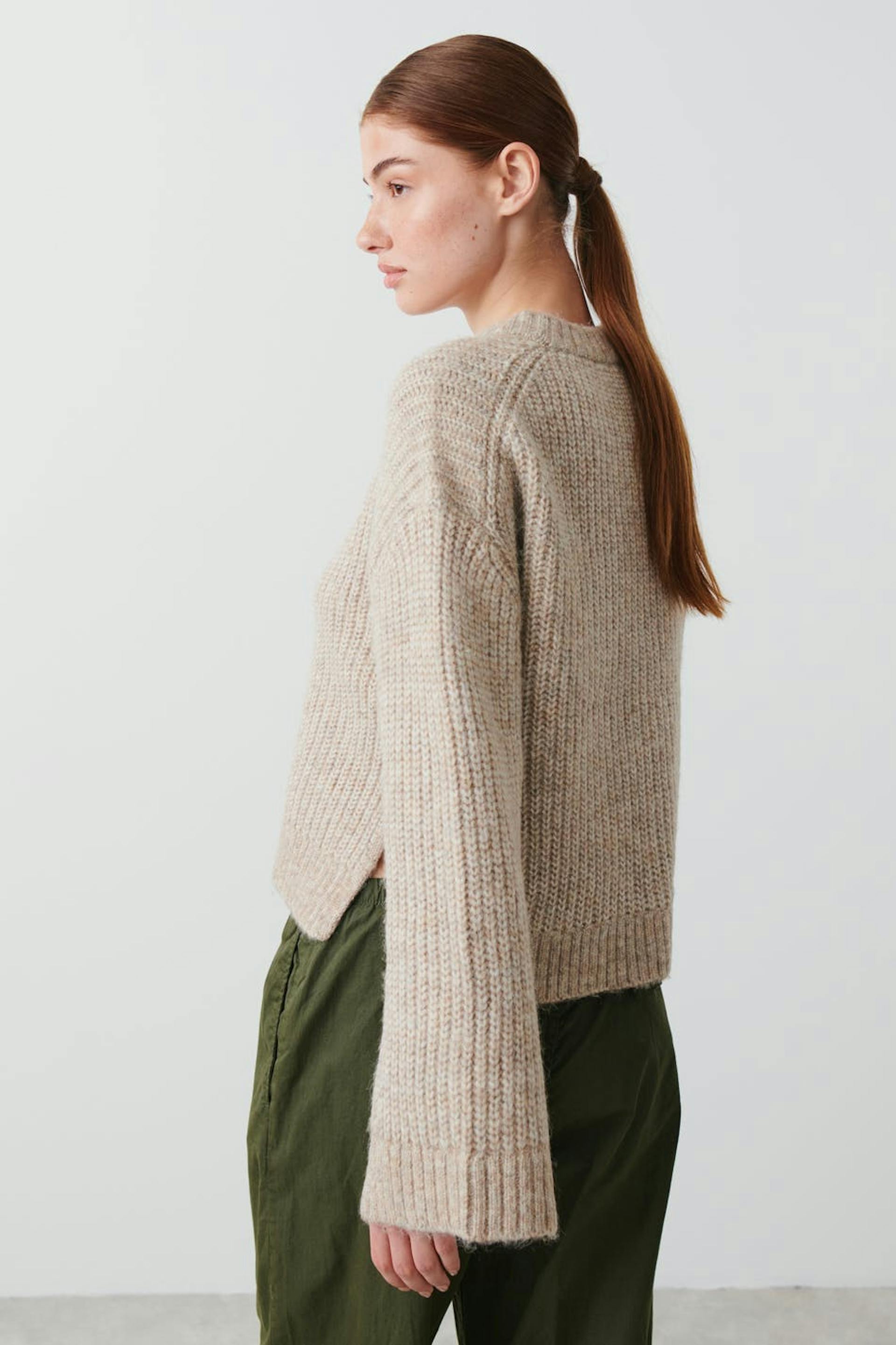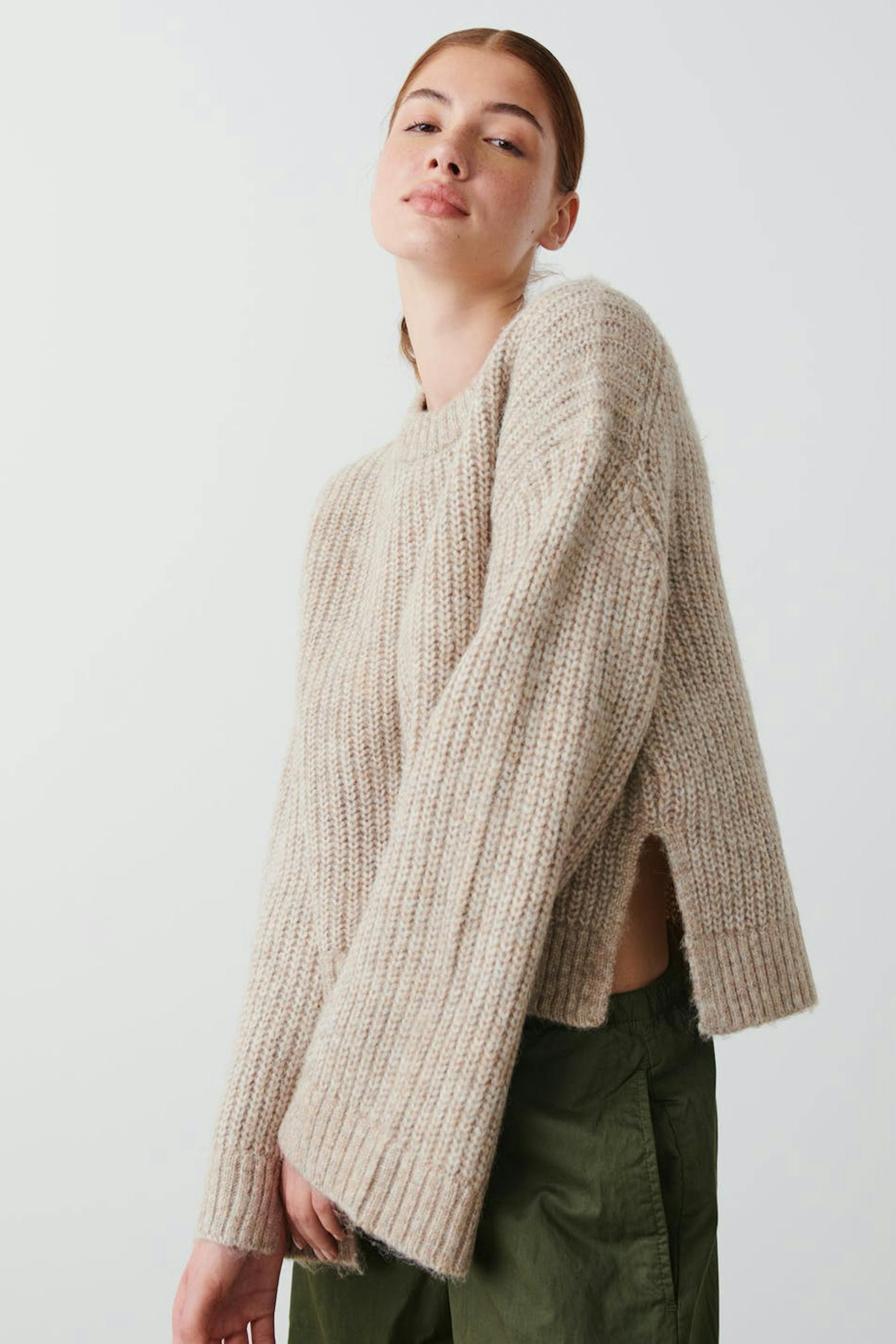 Knitted sweater with round neckline. The sweat is beige and has boxy fit. It has straight sleeve, slit in the sides and rib knit at sleeve ends and at the bottom.