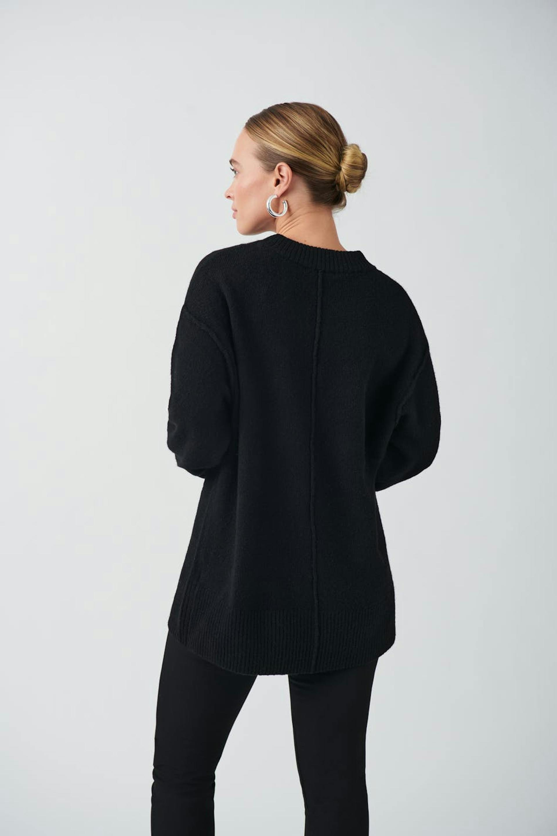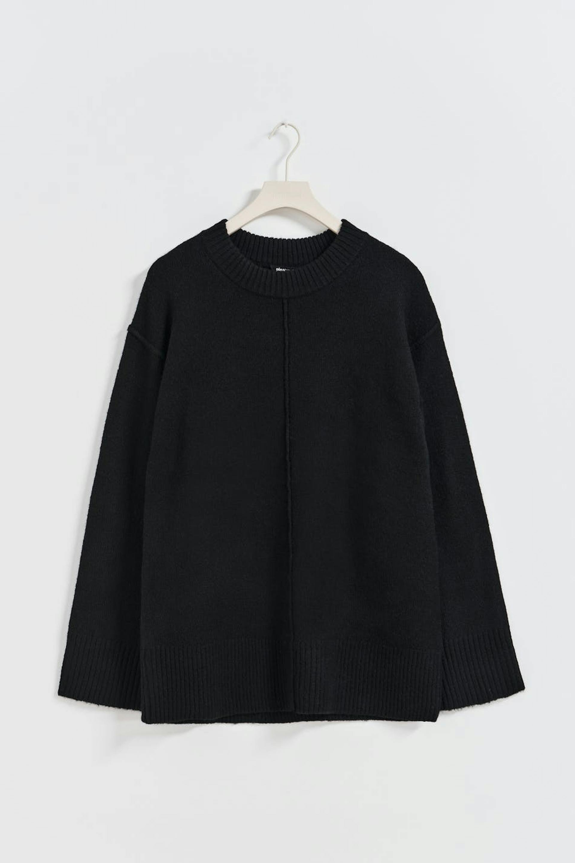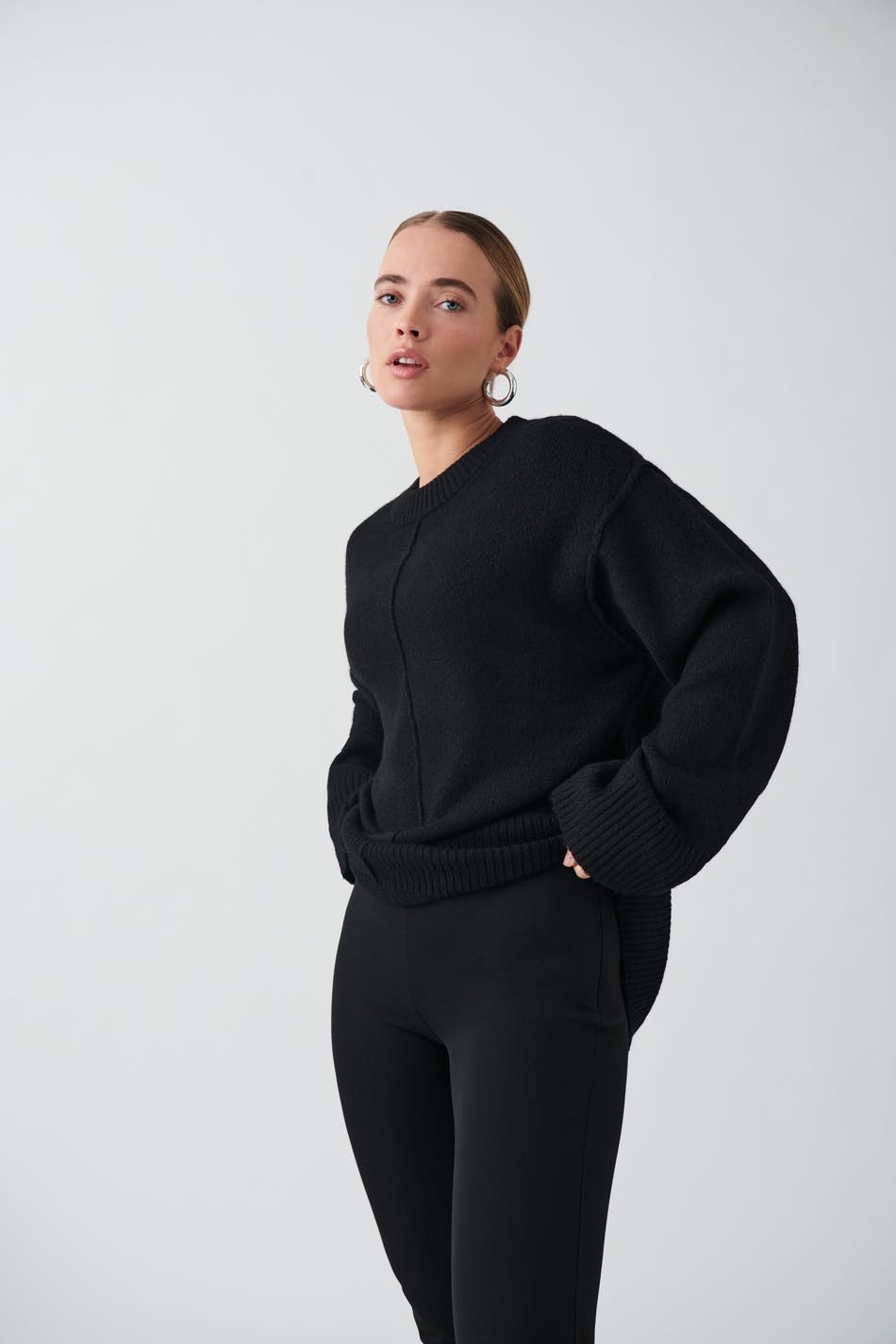 Knitted sweater with decorative seam at the front and back. The sweat is black and has boxy fit. It has soft quality, round neckline and rib knit at sleeve ends and at the bottom.