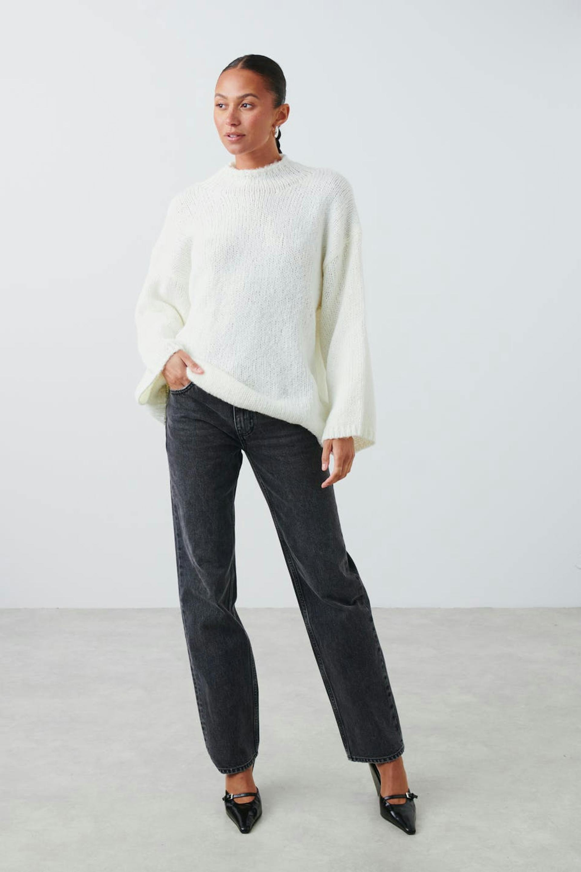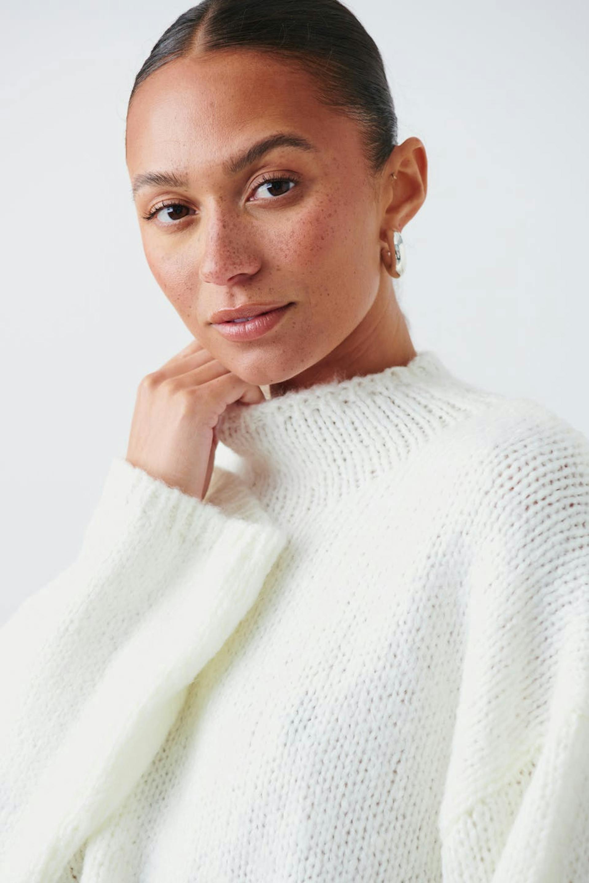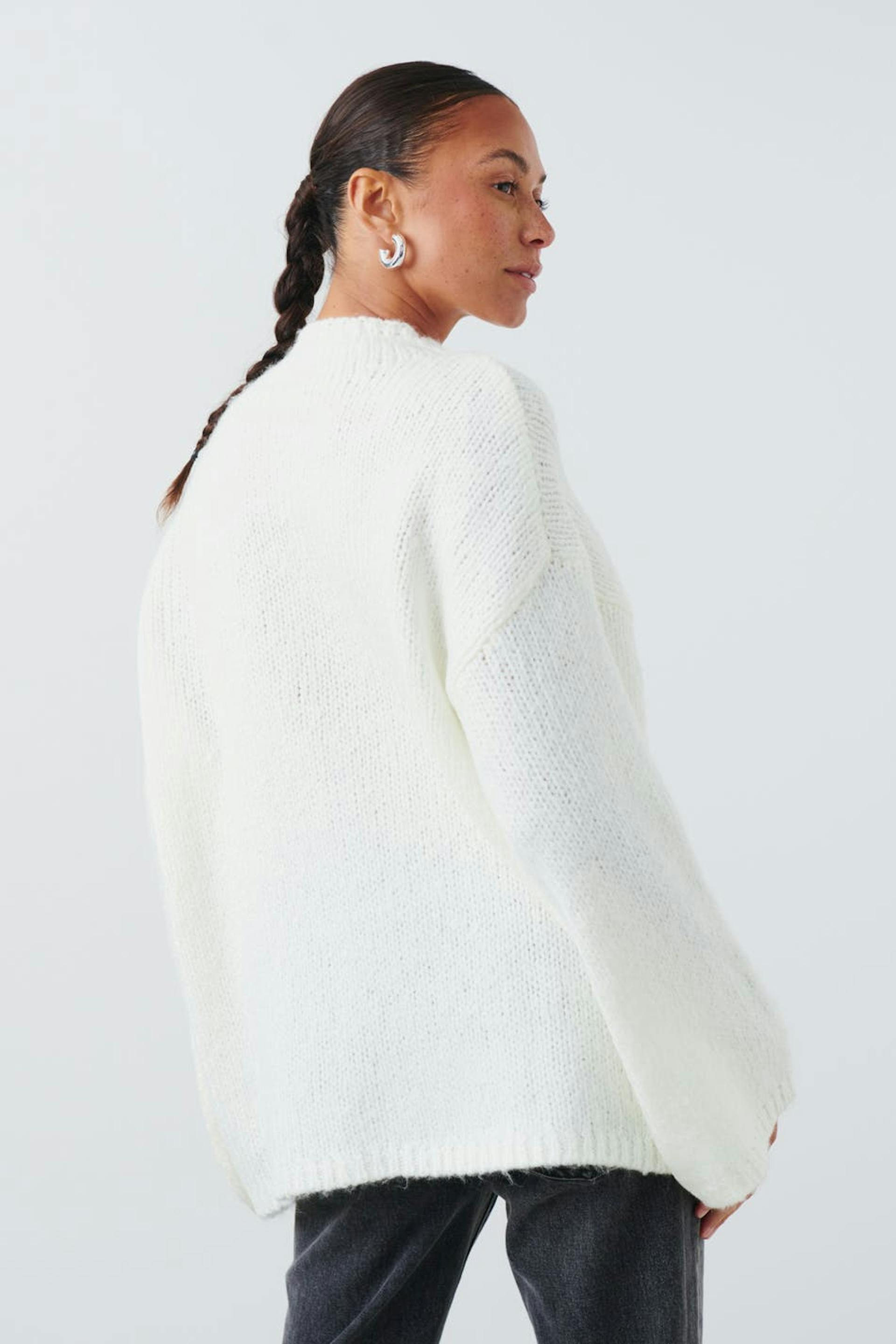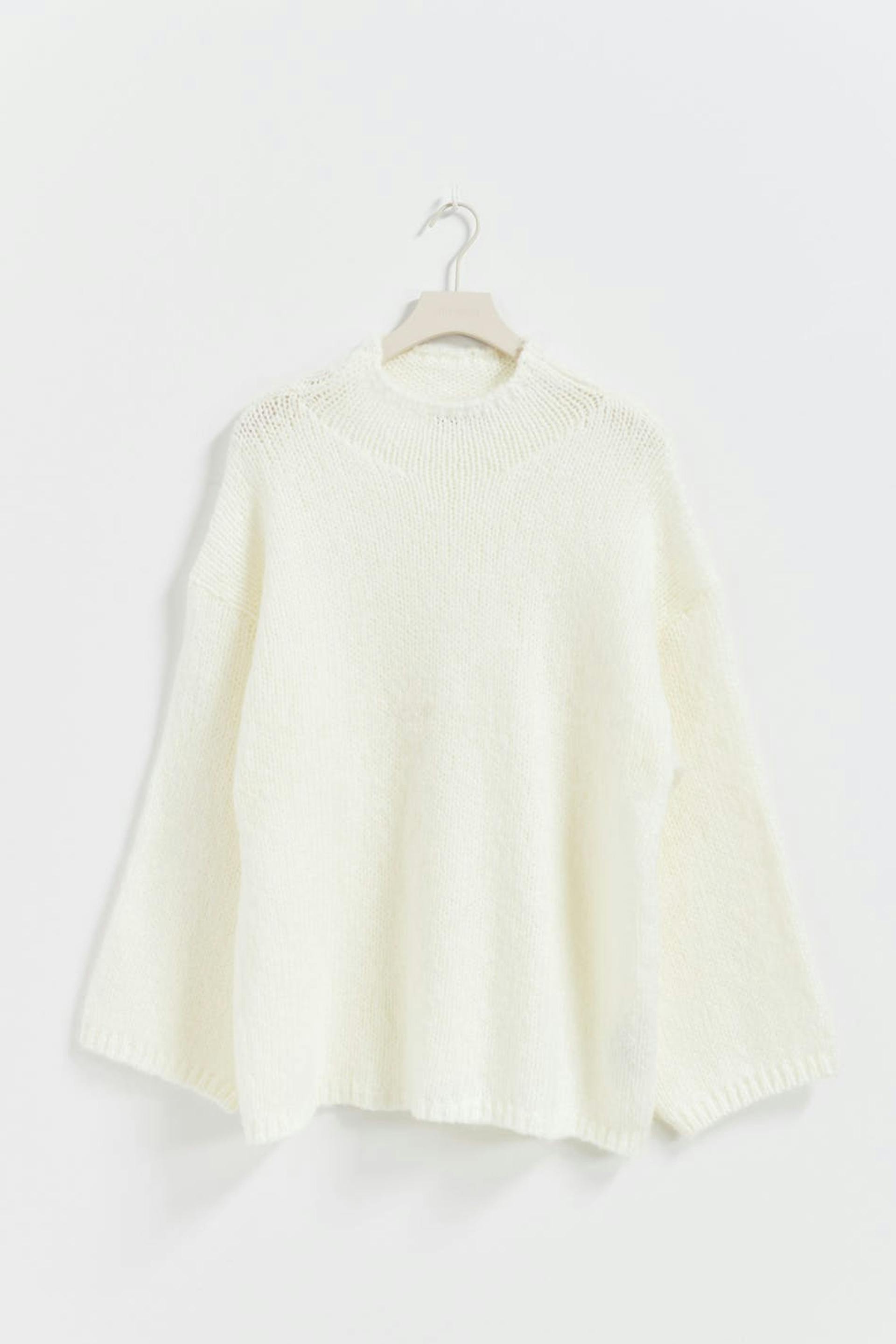 Knitted sweater with turtleneck. The sweat is white and has boxy fit. It has soft quality, long, wide sleeve and rib knit at sleeve ends and at the bottom.
