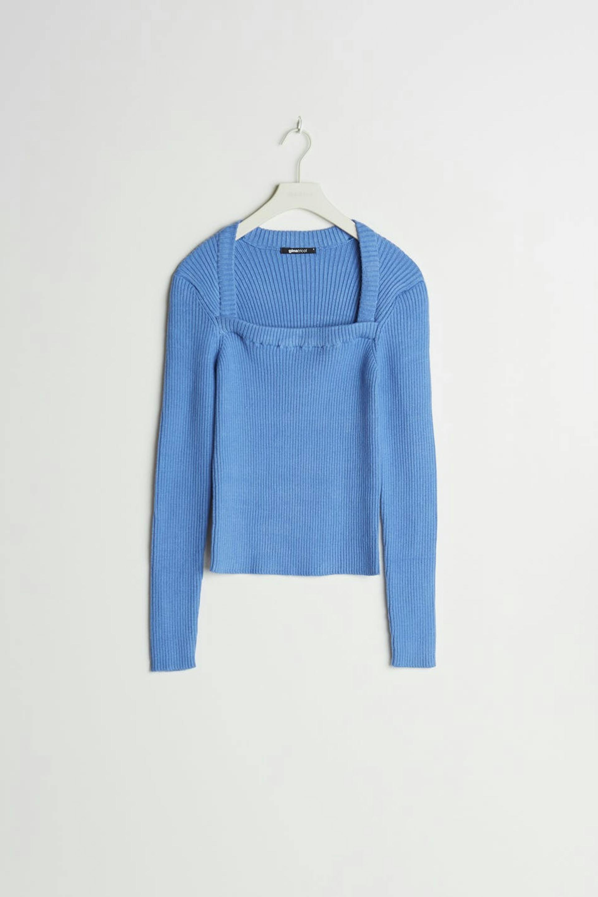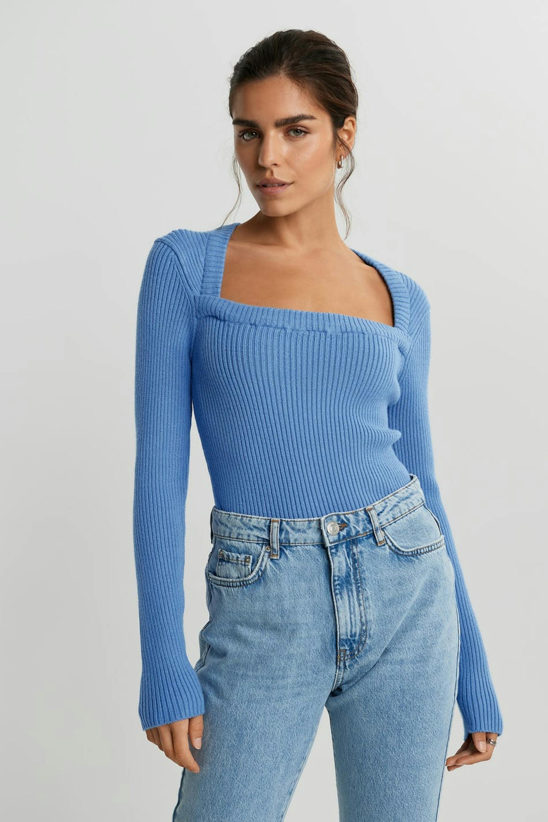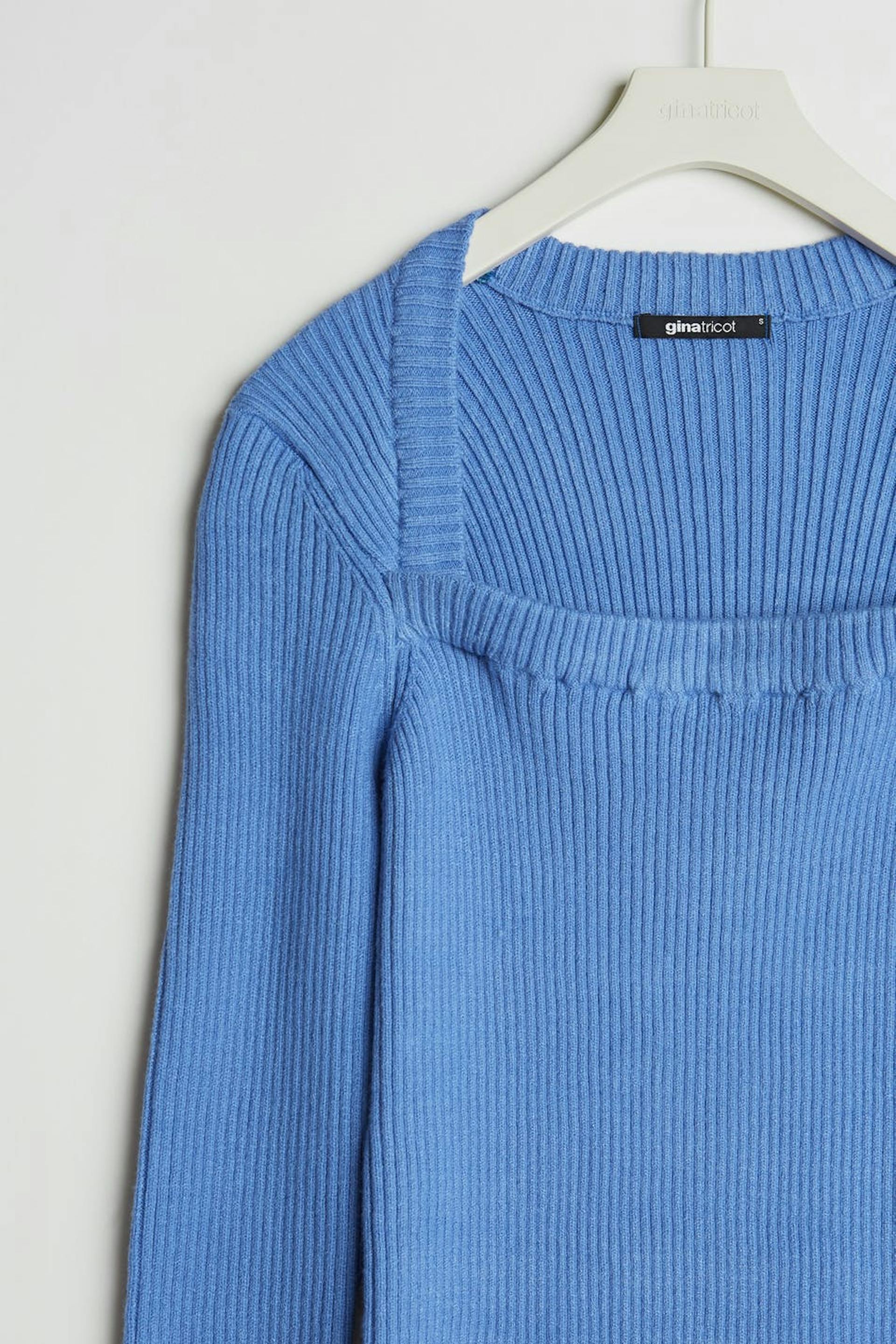 Rib-knit jumper with a square neckline. The jumper is blue and long-sleeved.