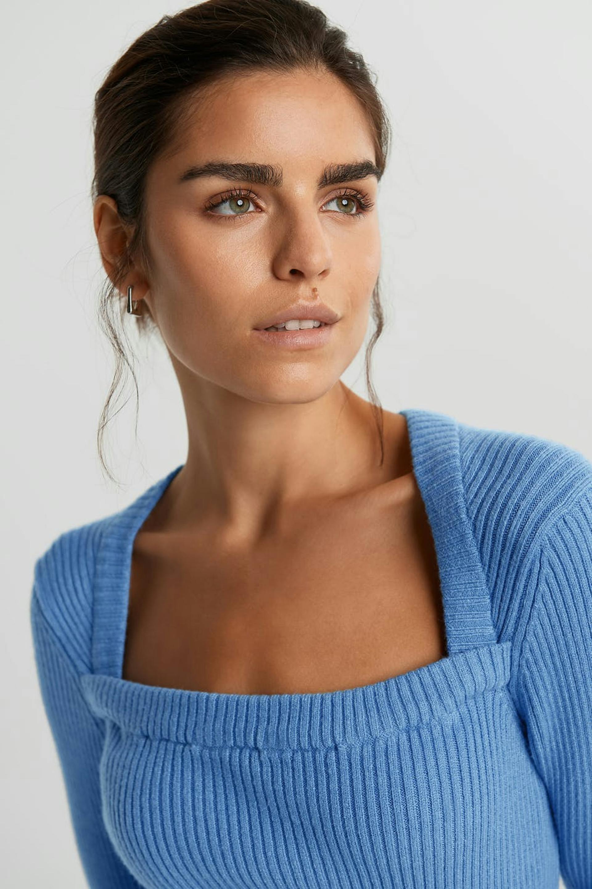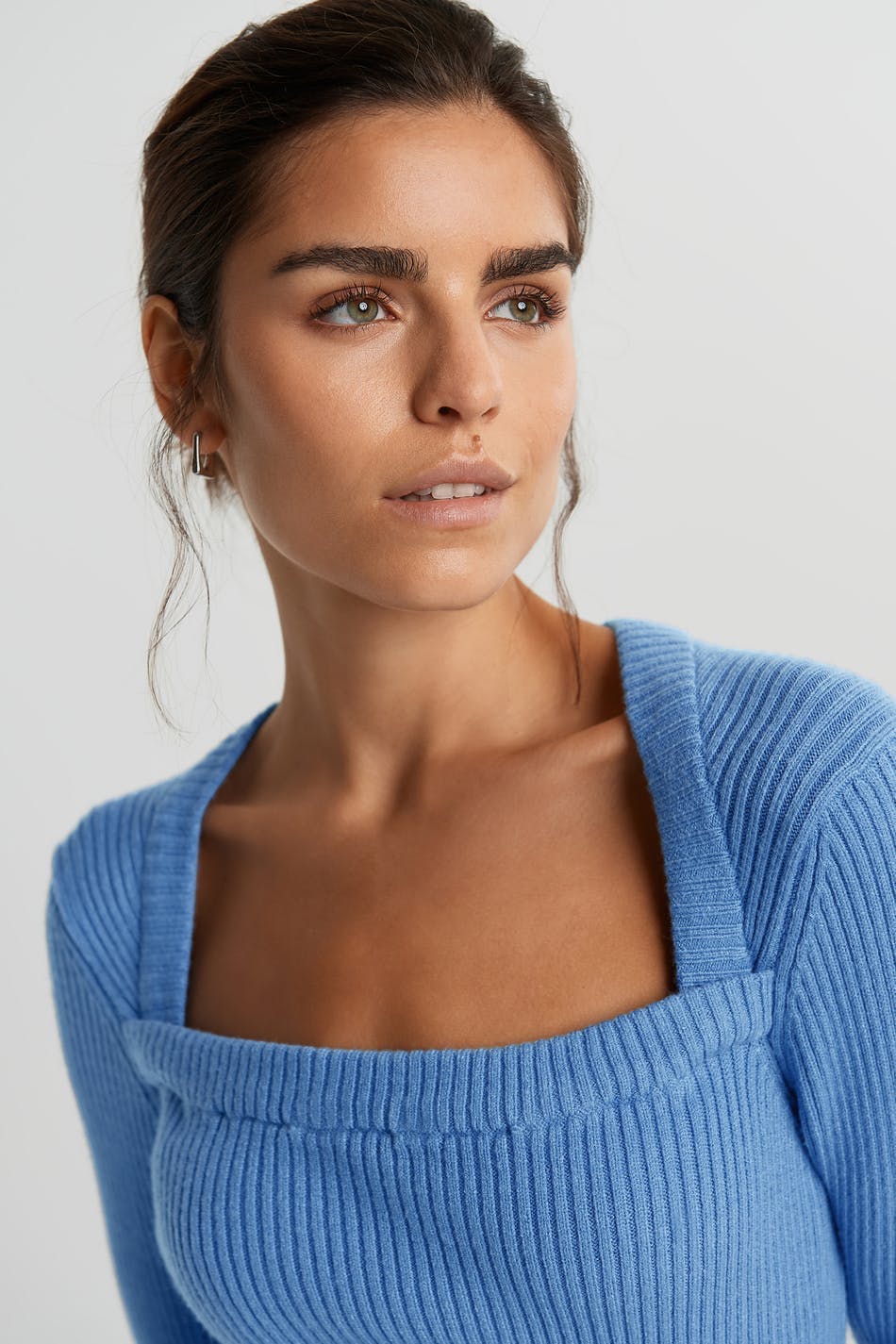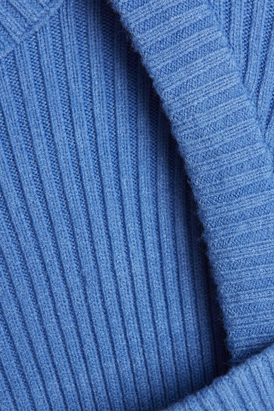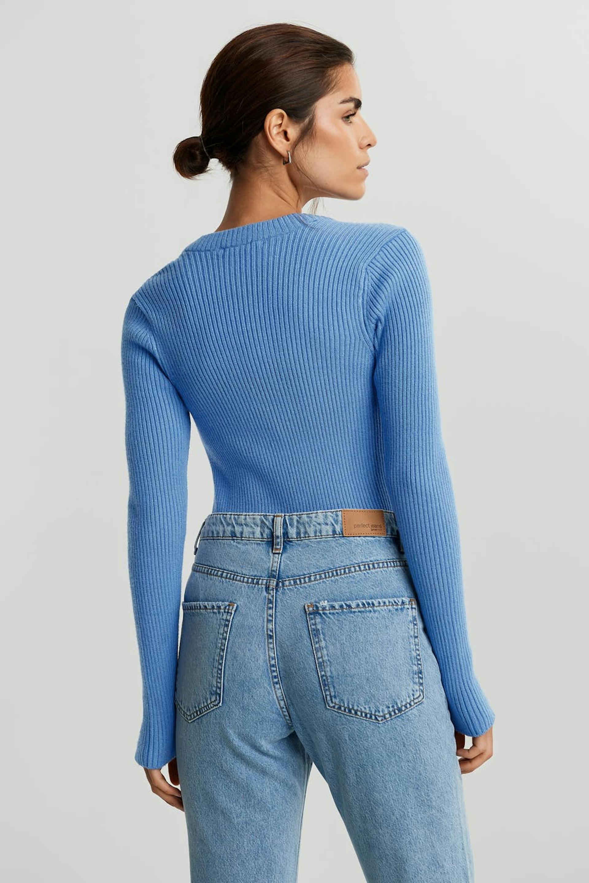 Rib-knit jumper with a square neckline. The jumper is blue and long-sleeved.