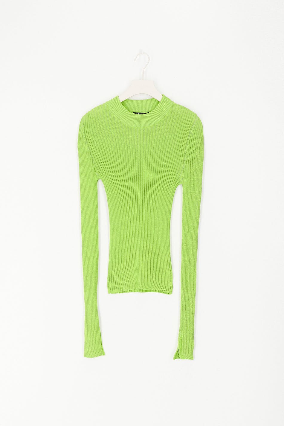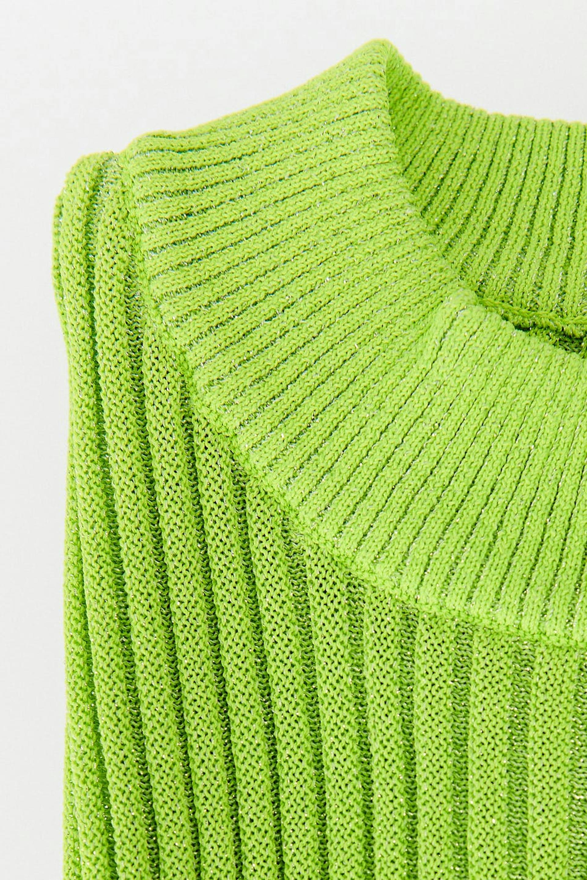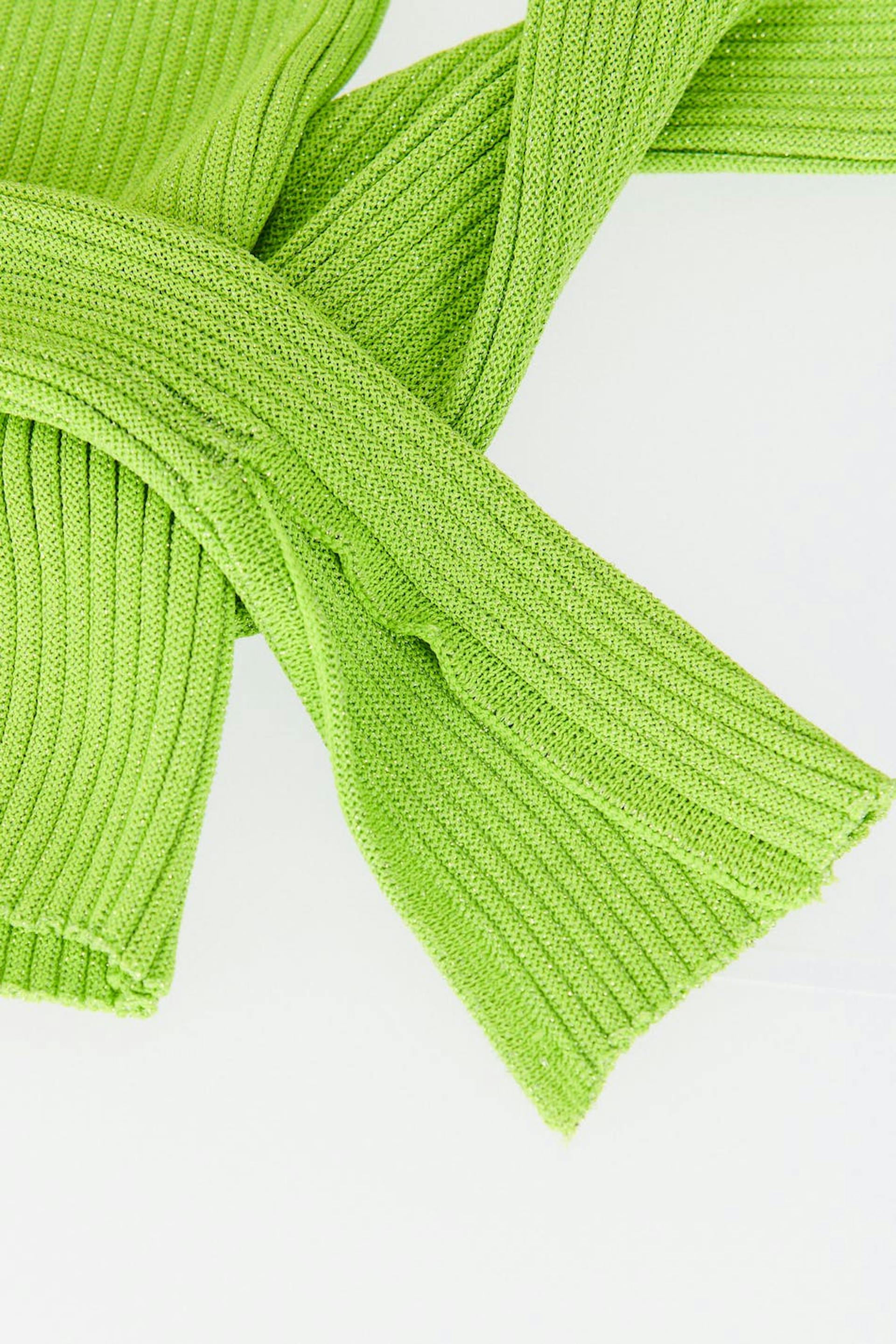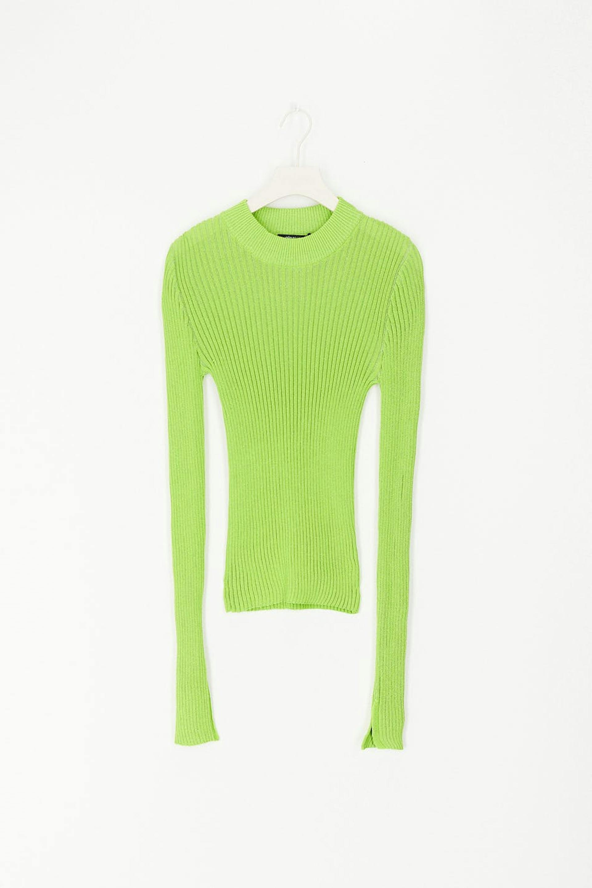 Sparkly top in lurex with crew neckline. The top is green, knitted and fitted. It has long sleeves and slit on the sleeve ends.