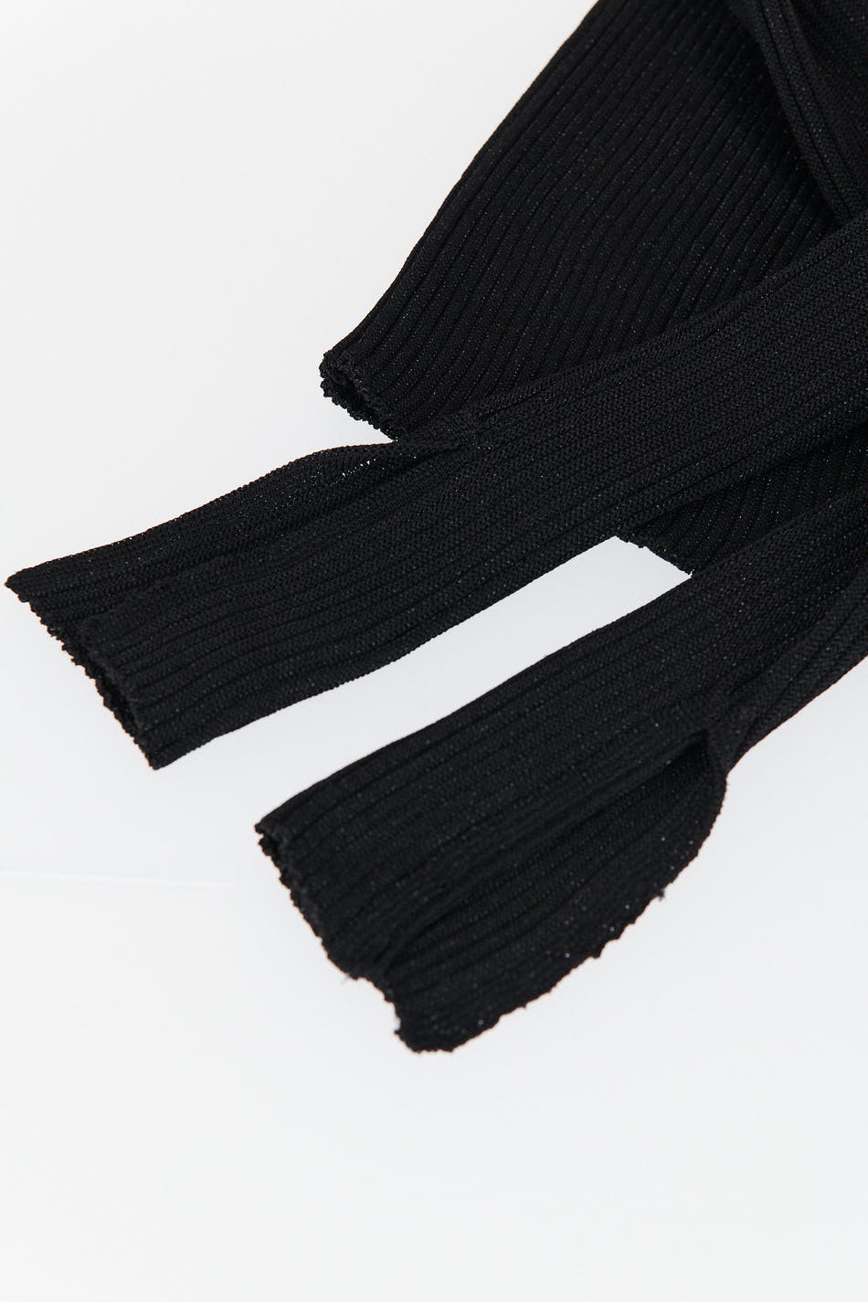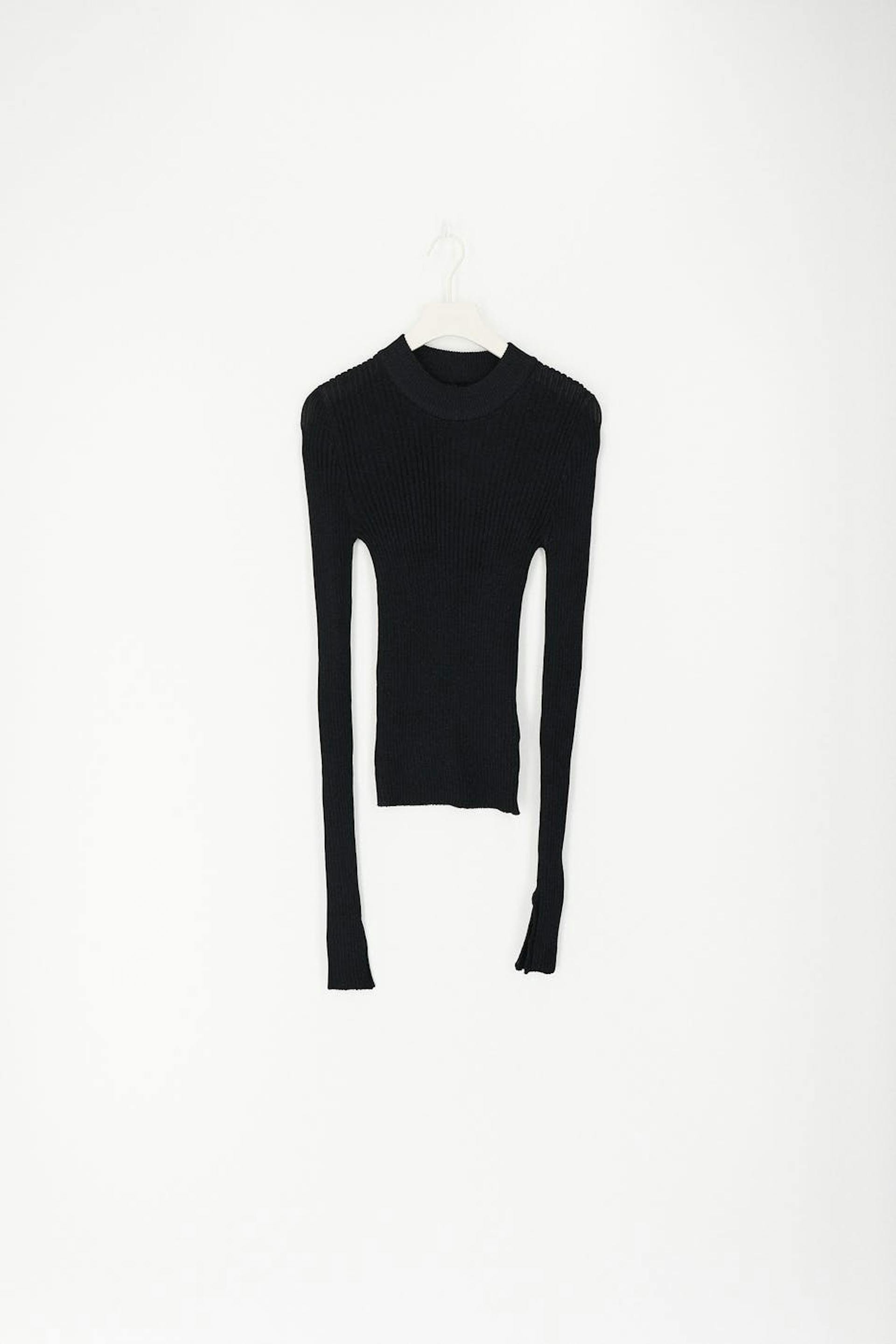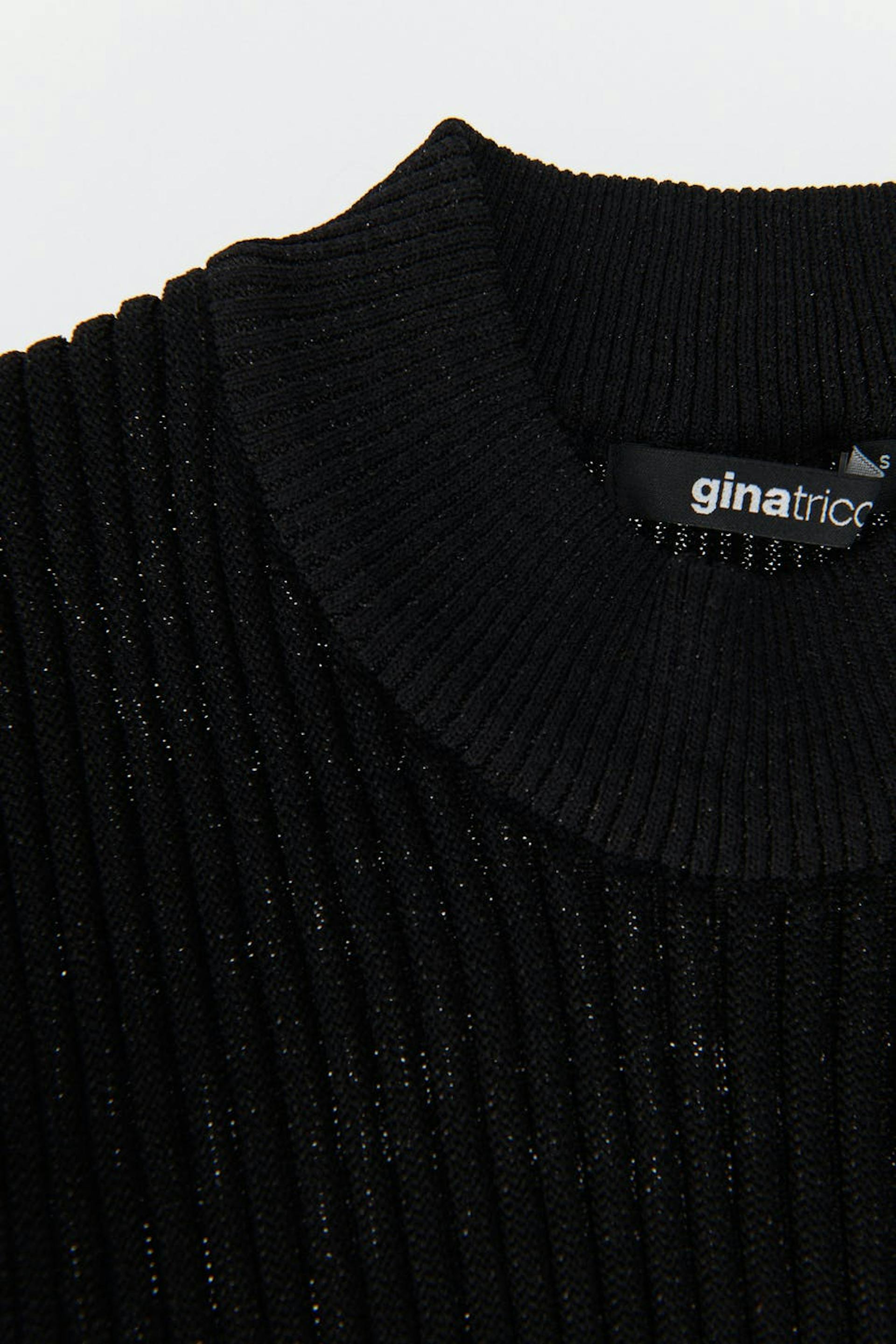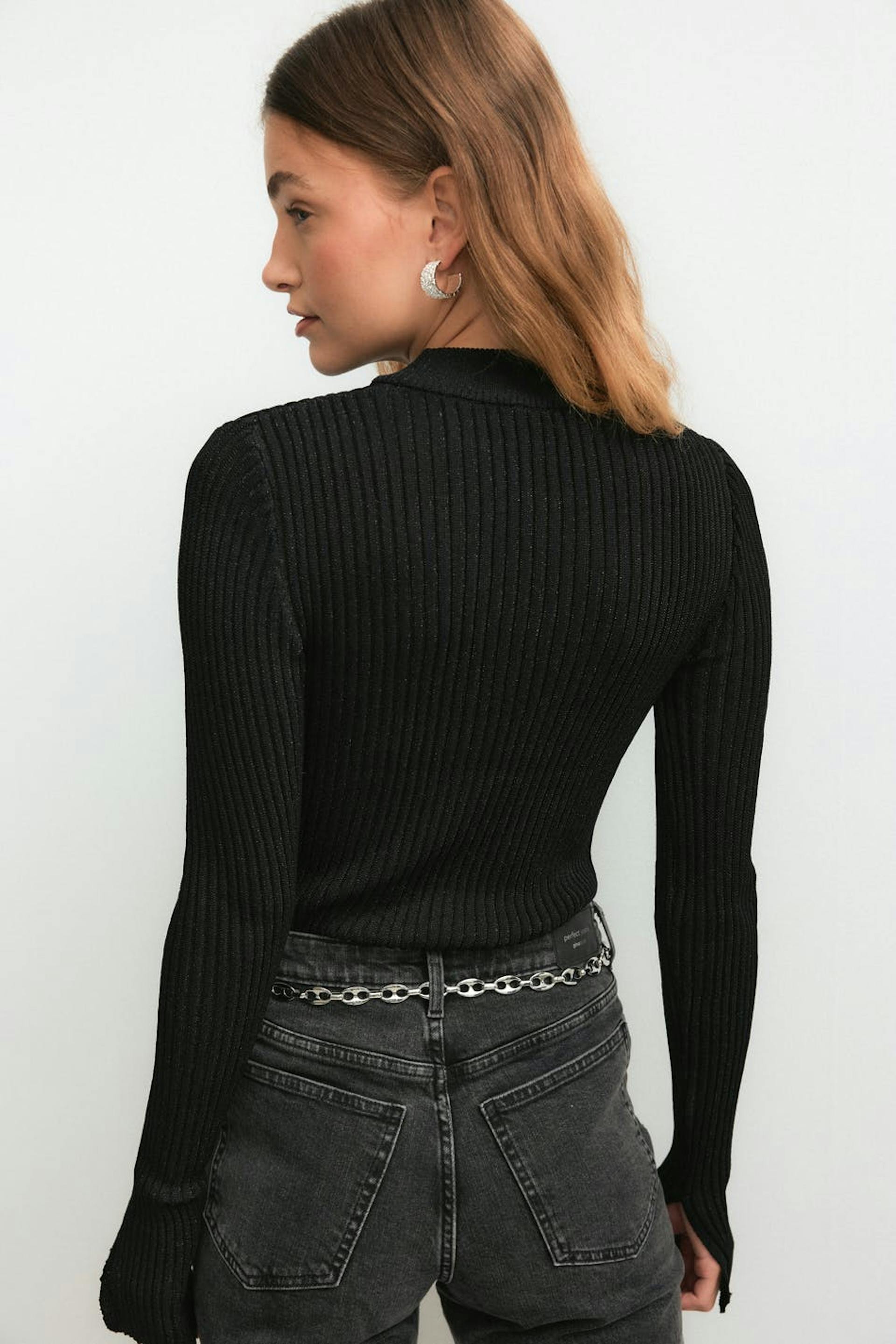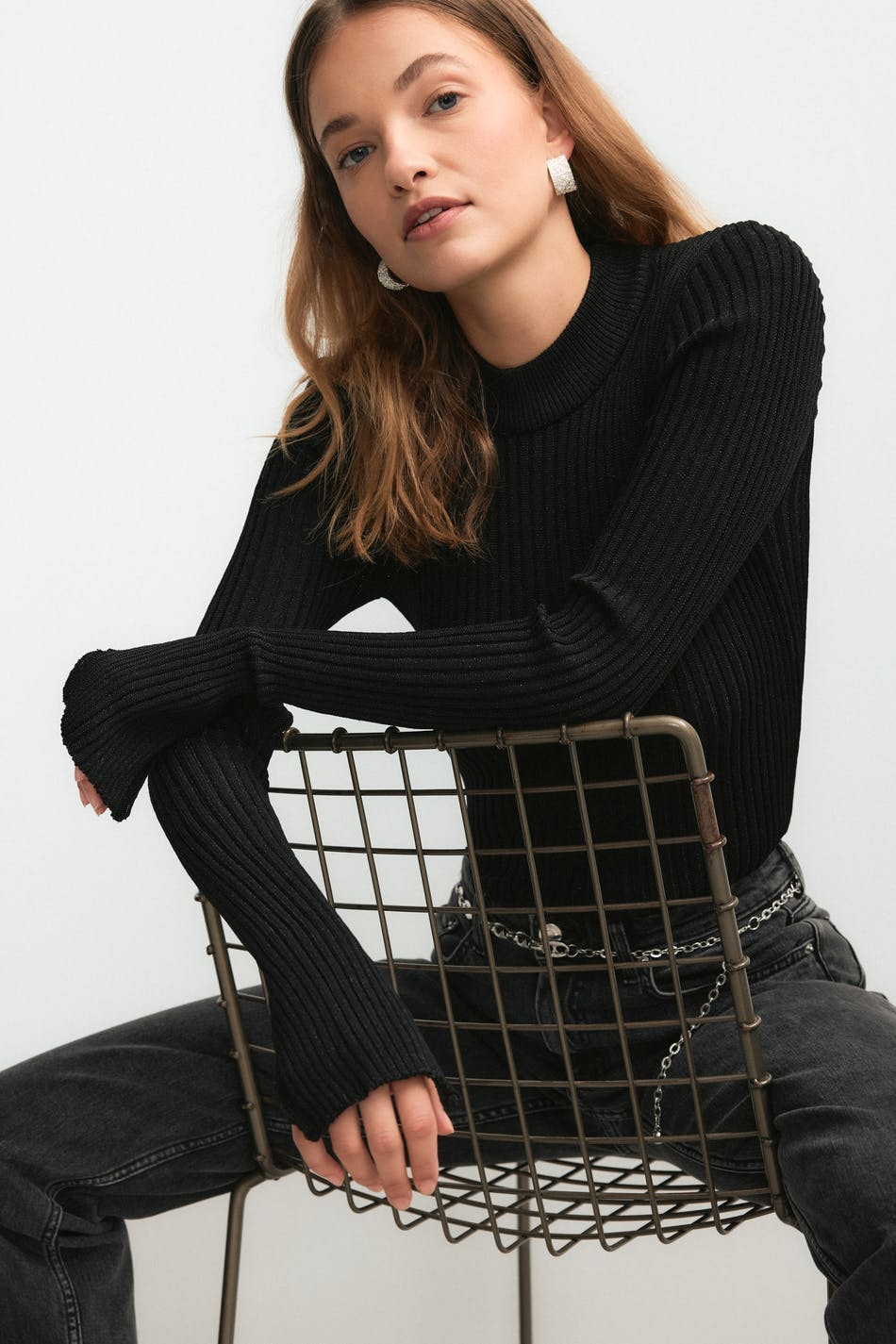 Sparkly top in lurex with crew neckline. The top is black, knitted and fitted. It has long sleeves and slit on the sleeve ends.