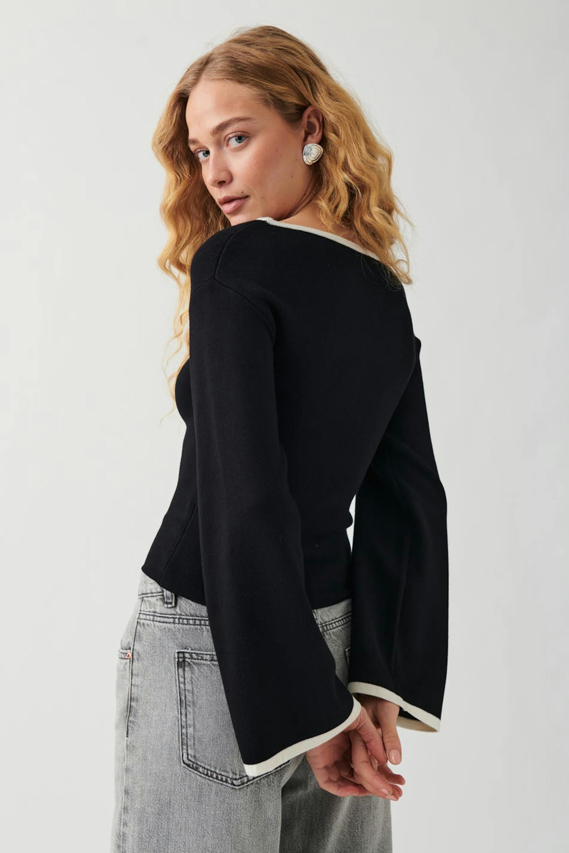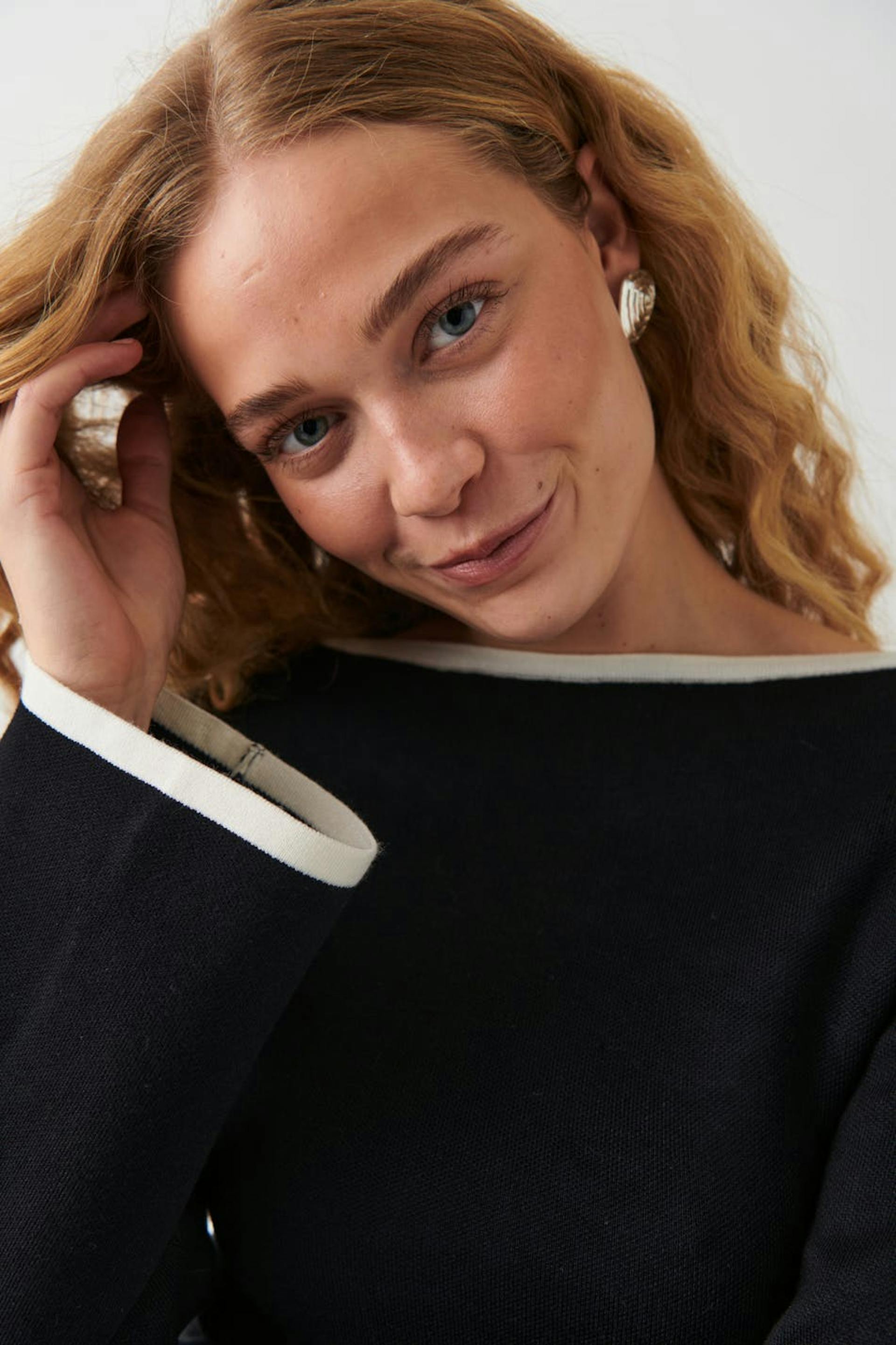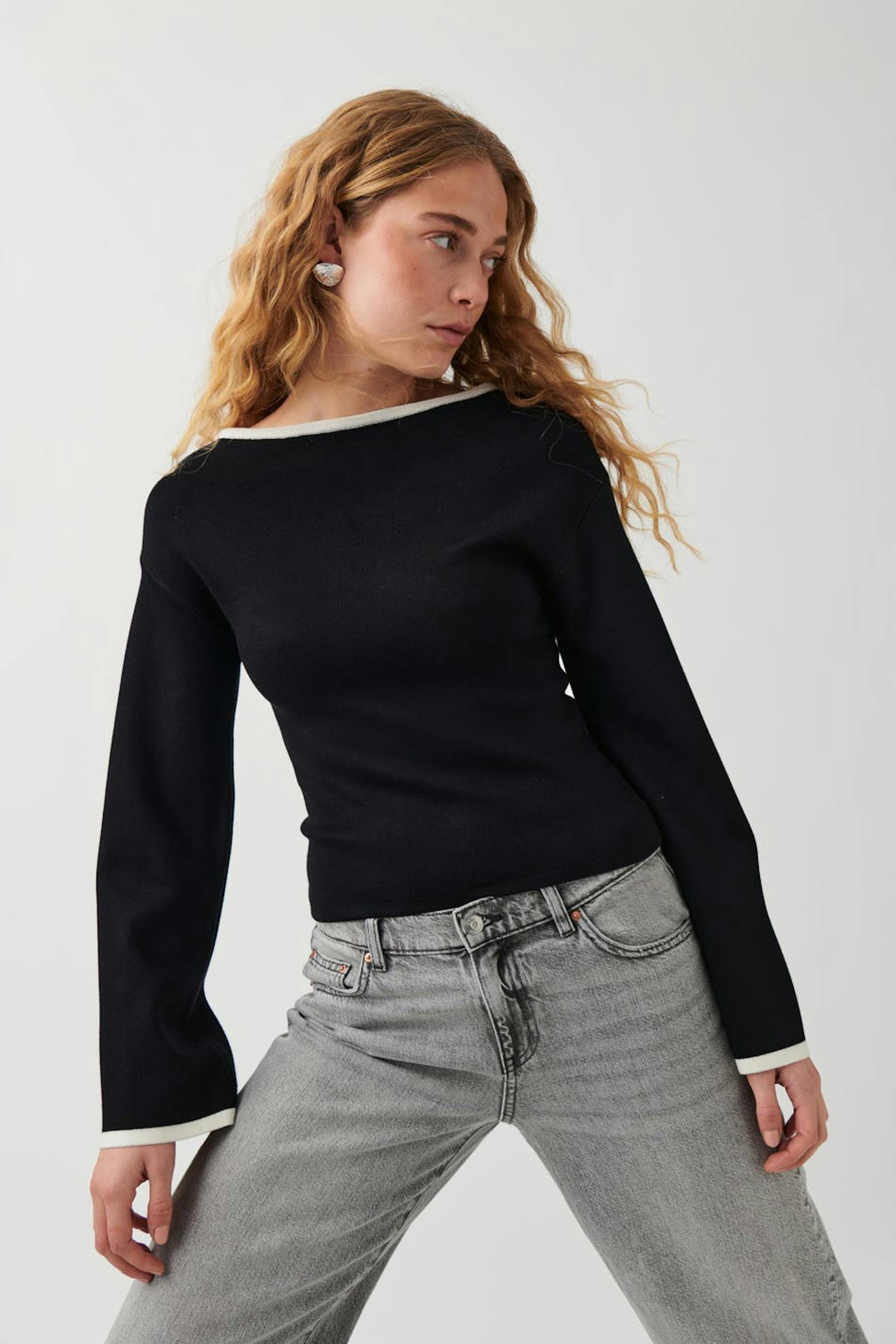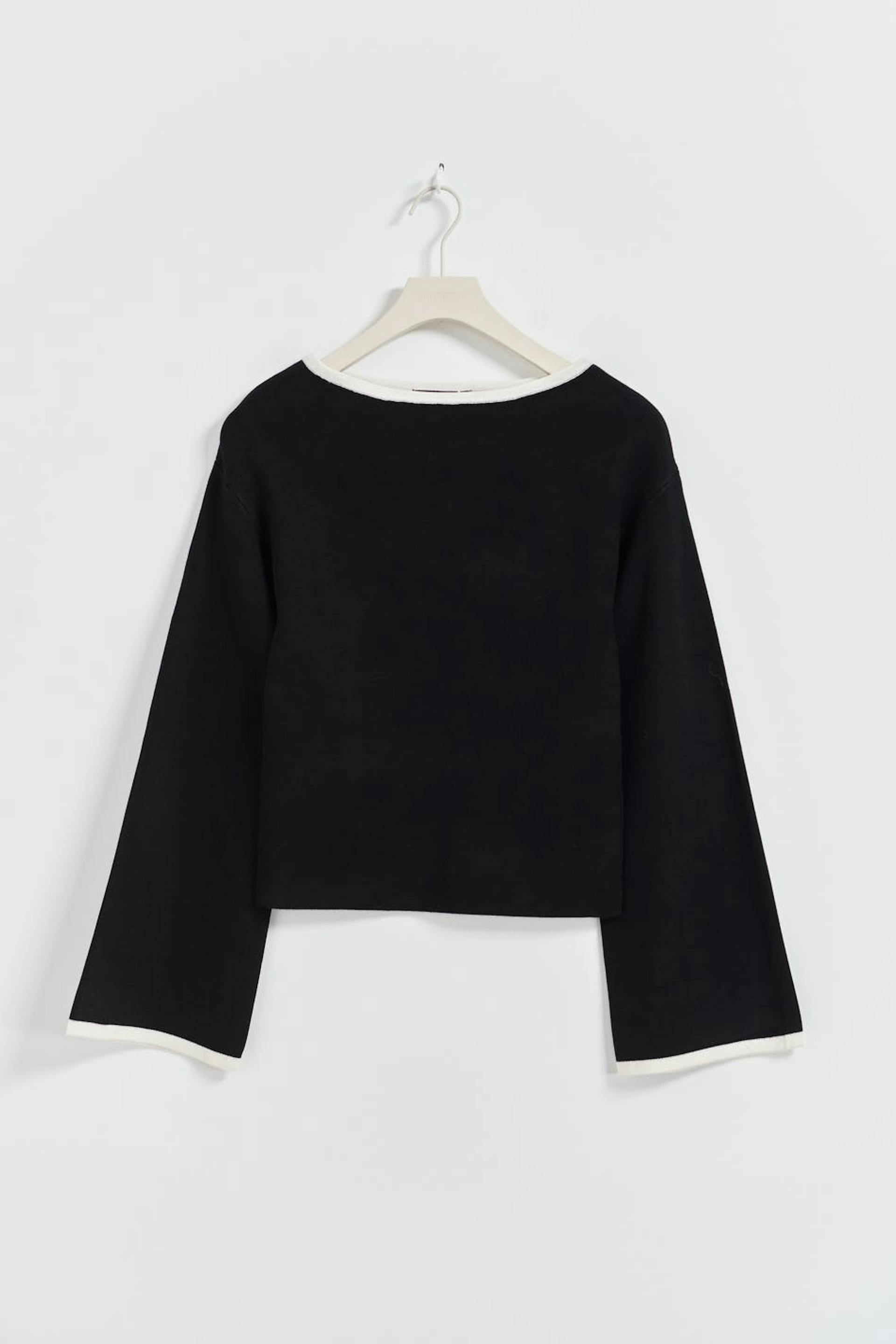 Knitted top with wide neckline. The top is black and has vertical stripes. It has long, wide sleeve and contrast-coloured details at sleeve ends and on the neckline.