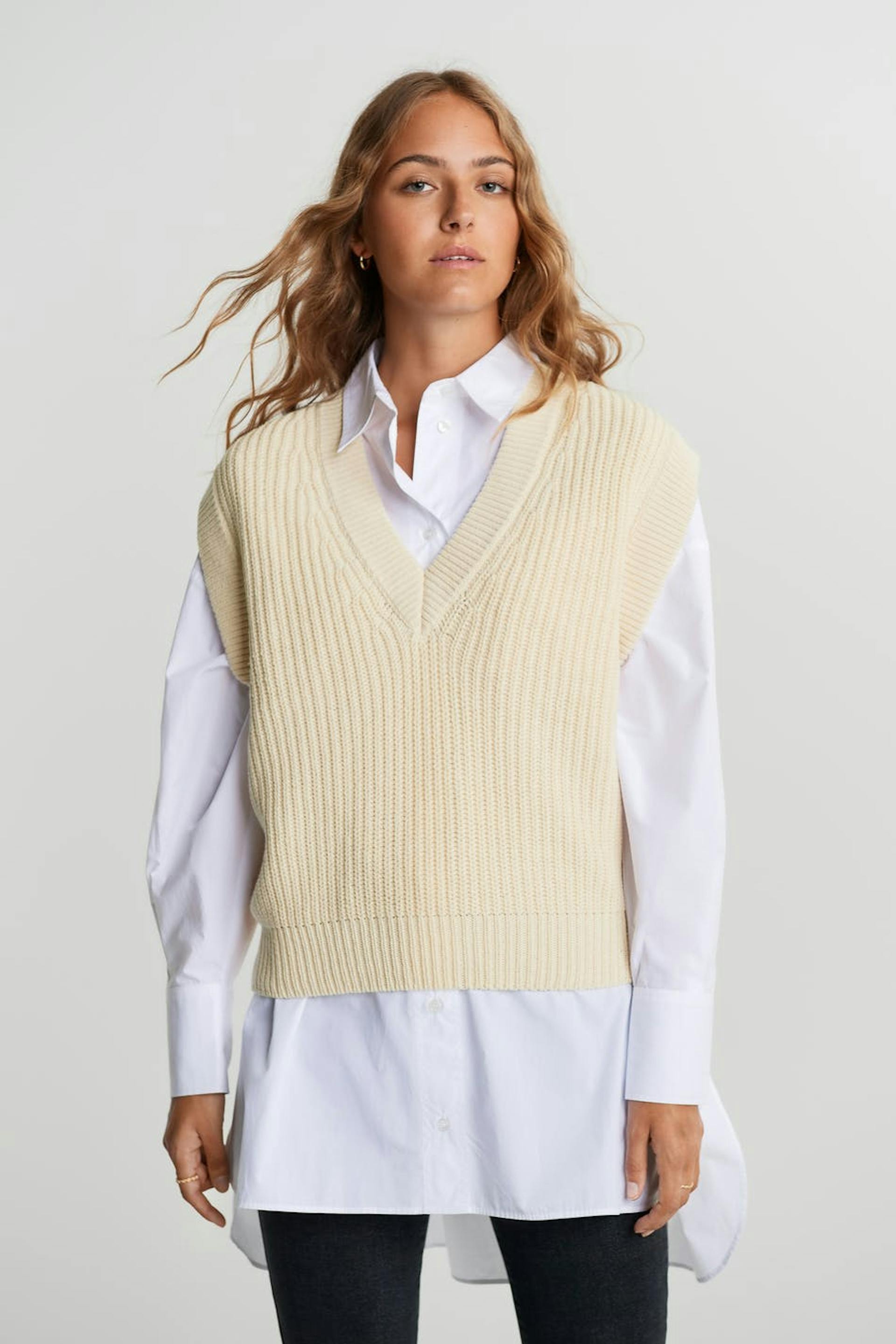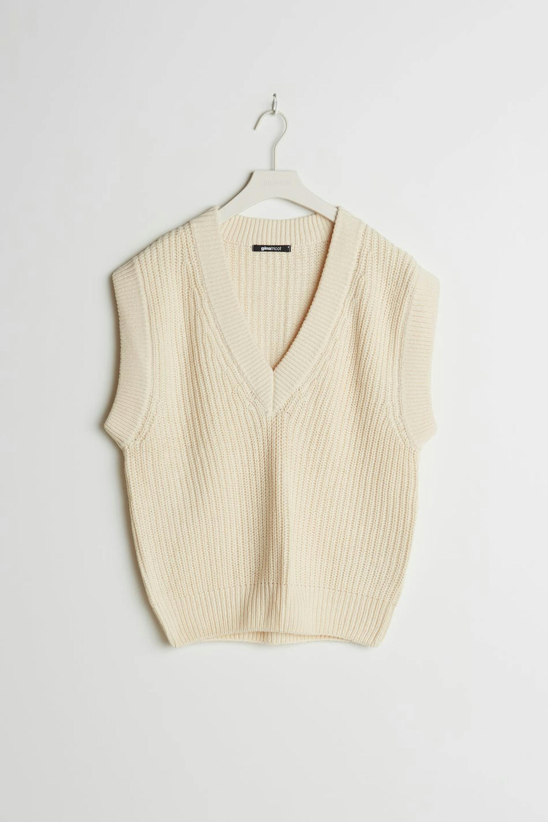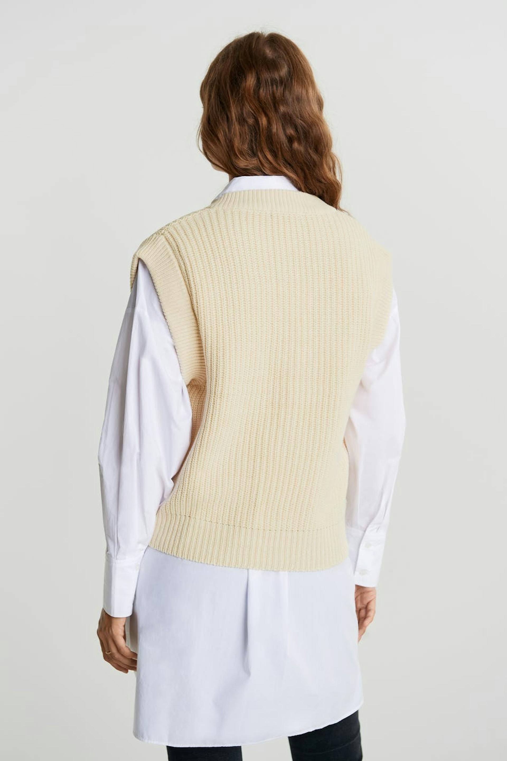 Knitted waistcoat with a V-neck. The waistcoat is beige and short.