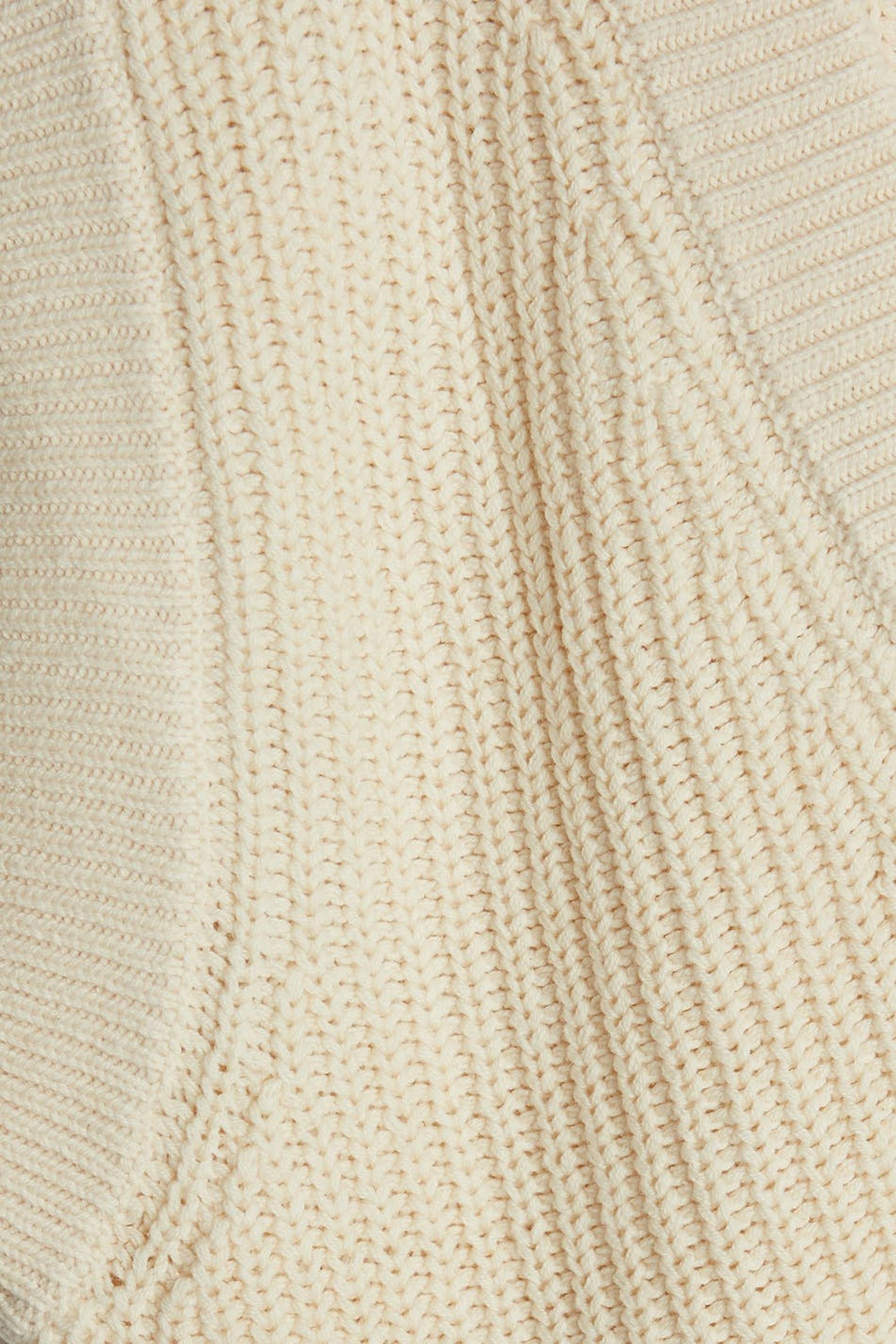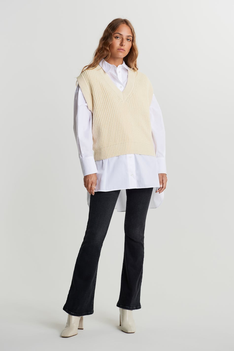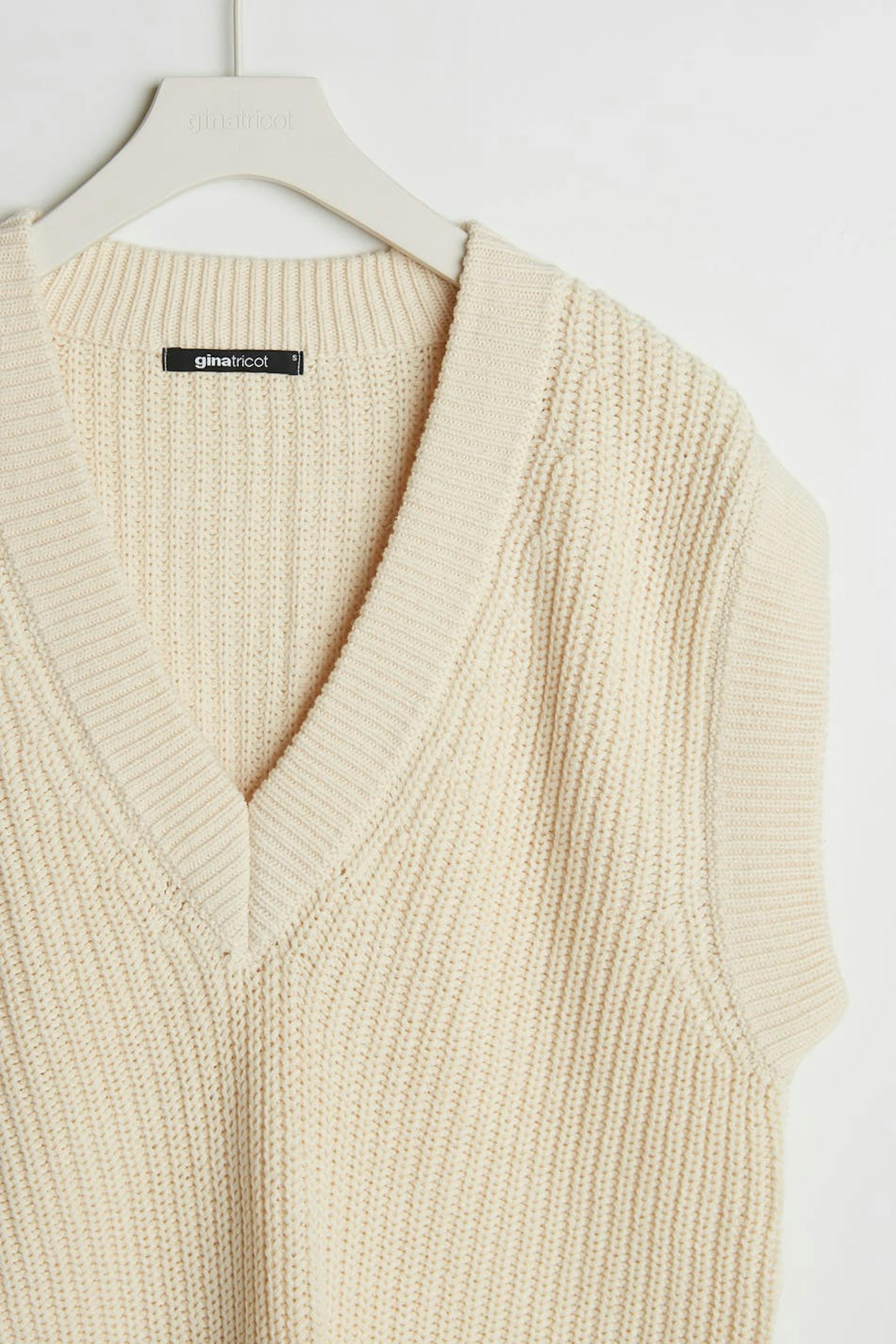 Knitted waistcoat with a V-neck. The waistcoat is beige and short.