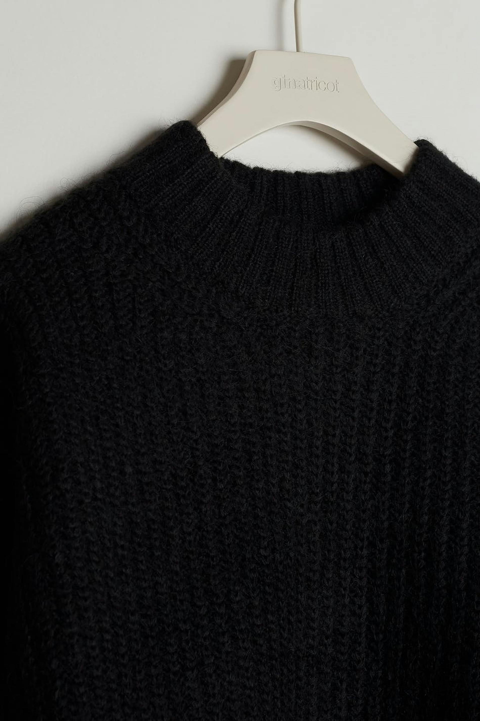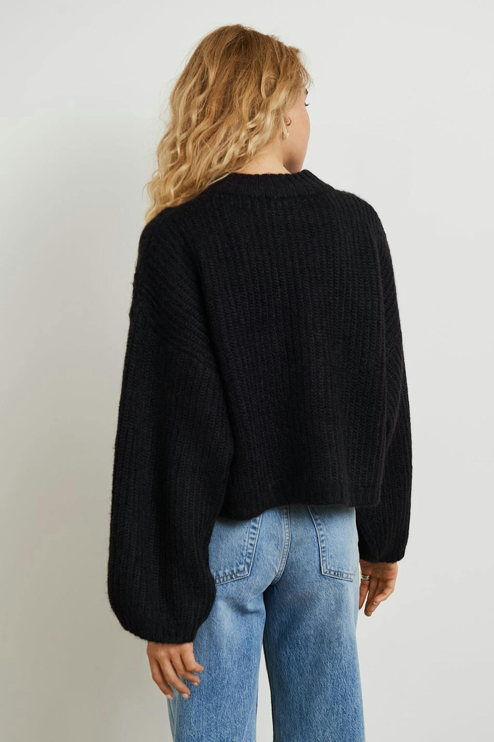 Knitted jumper with an oversize fit. The jumper is black and has a short length. It has balloon sleeves and a high neckline.