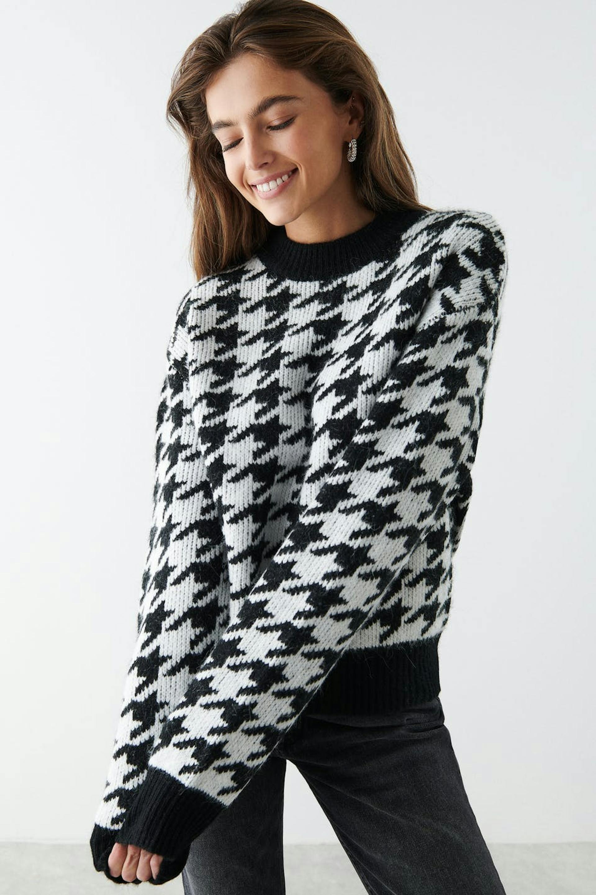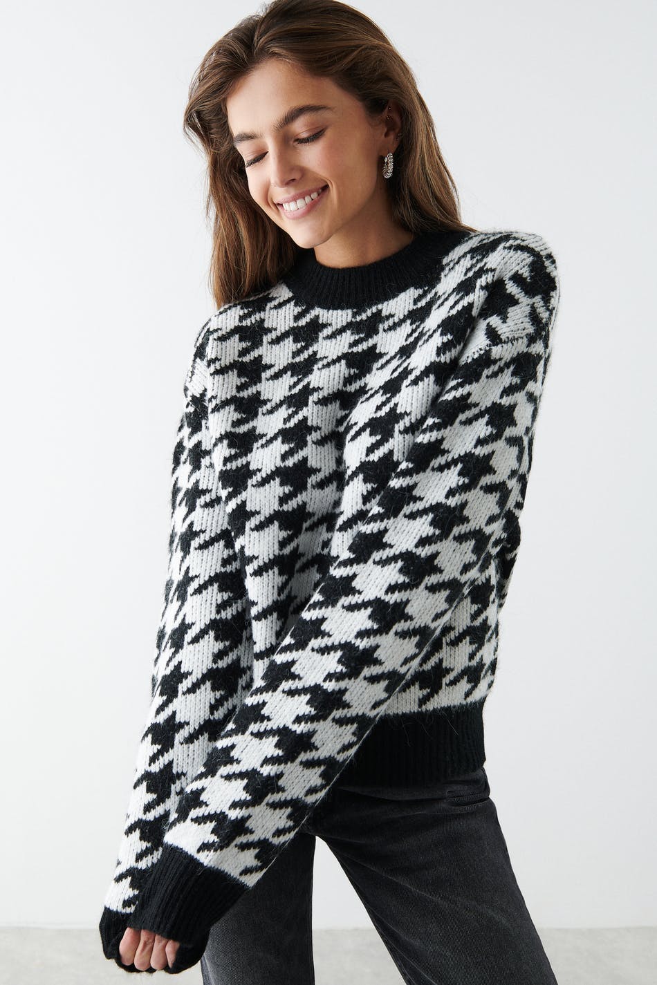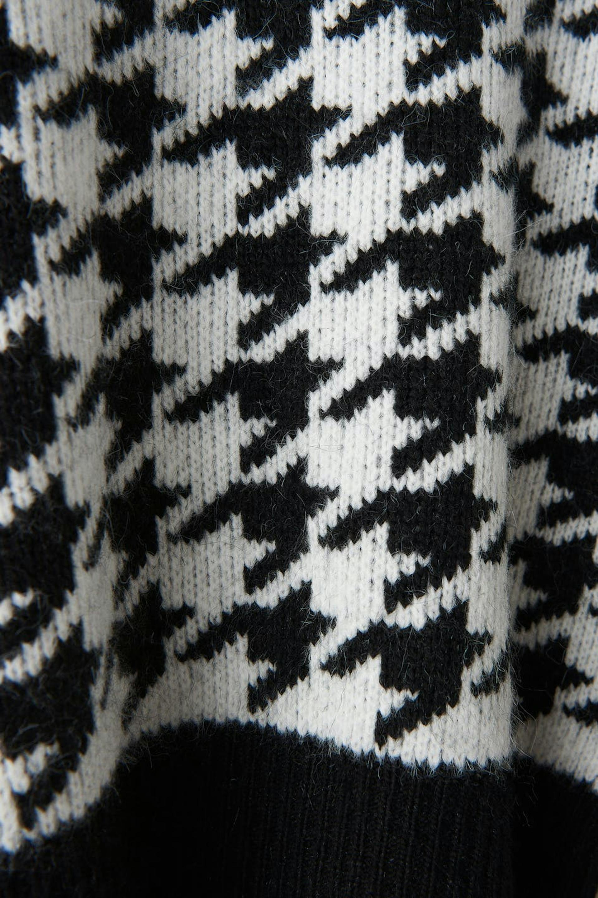 Dog tooth patterned jumper with boxy fit. The jumper is black, white and jacquard-knit. It has crew neckline.
