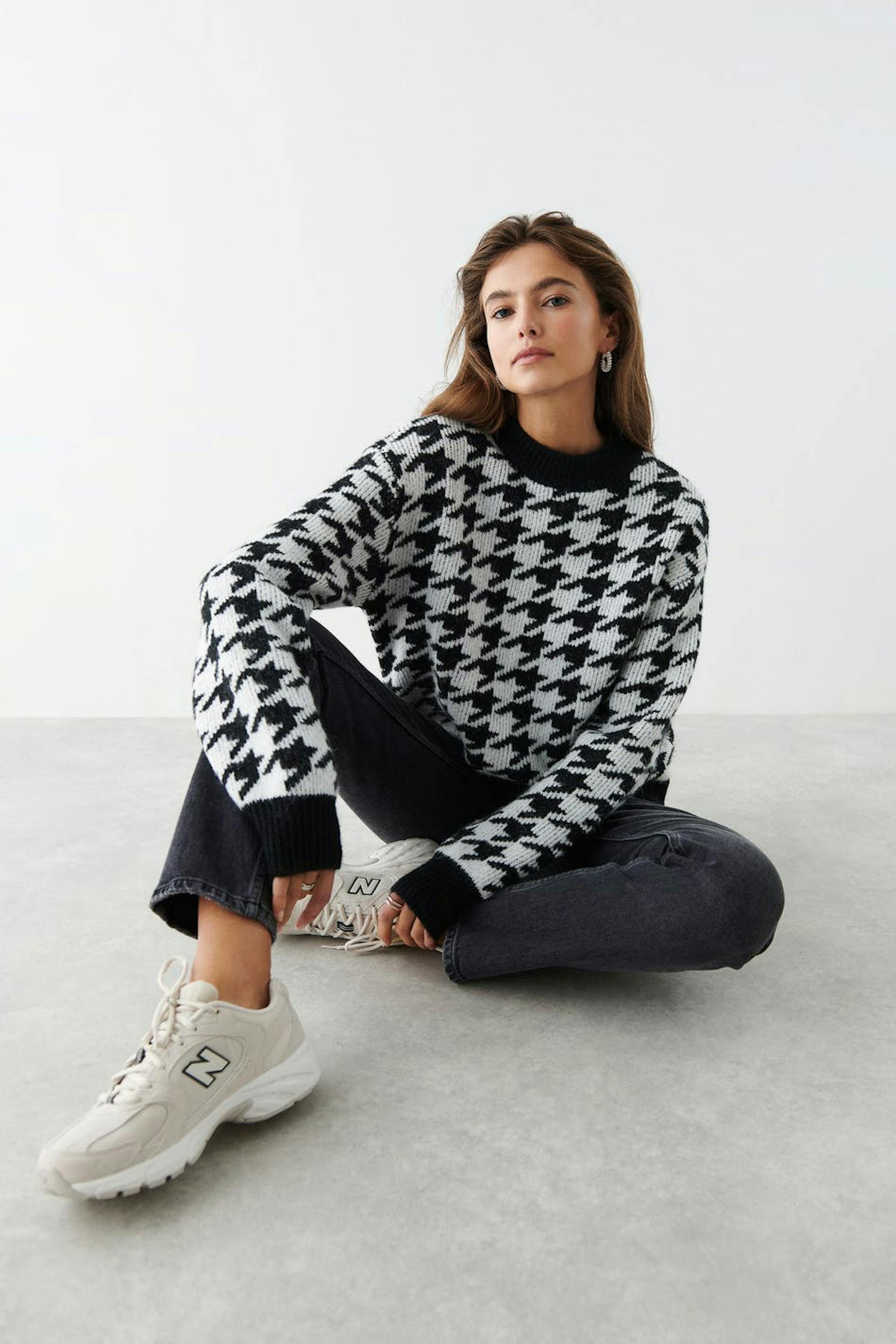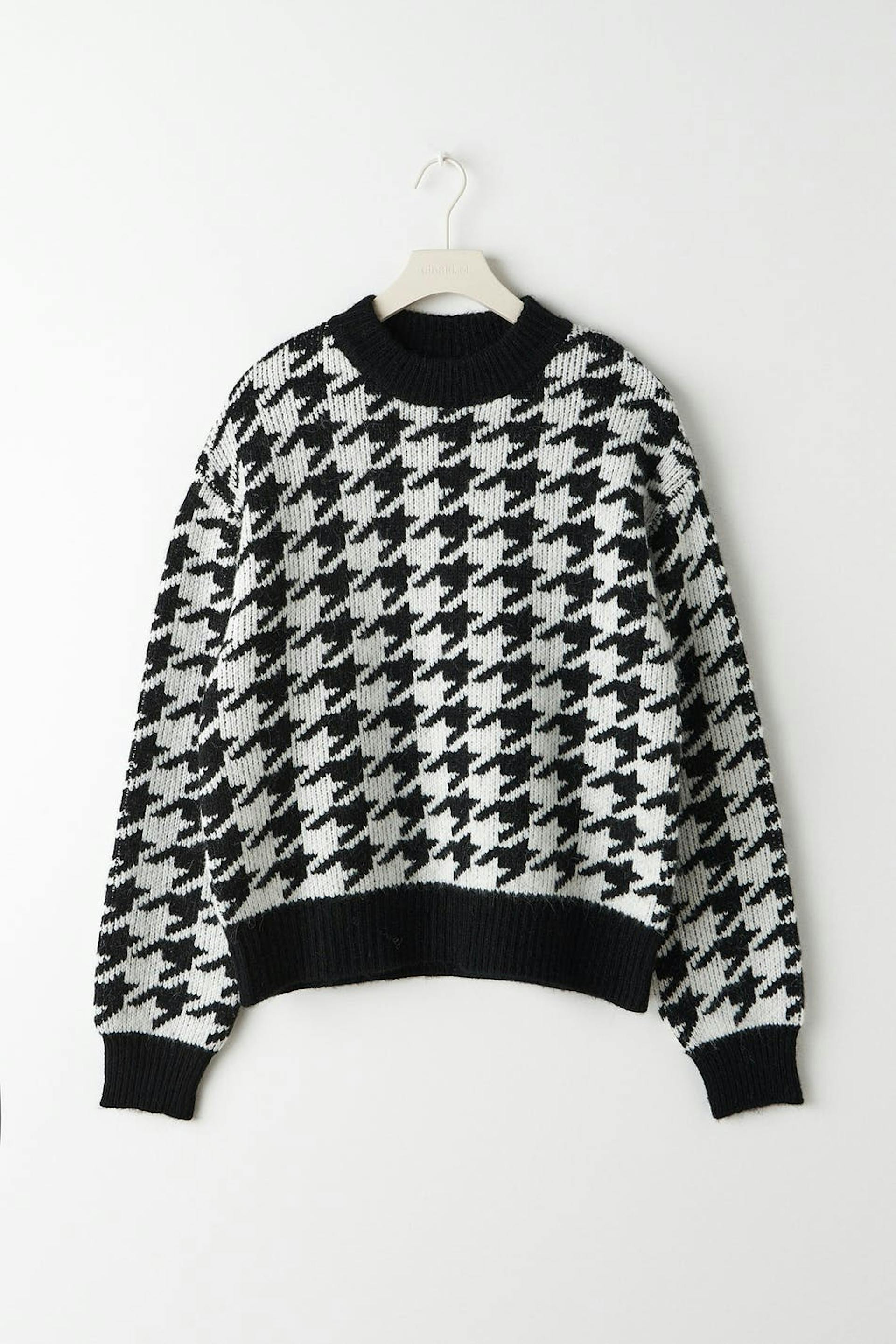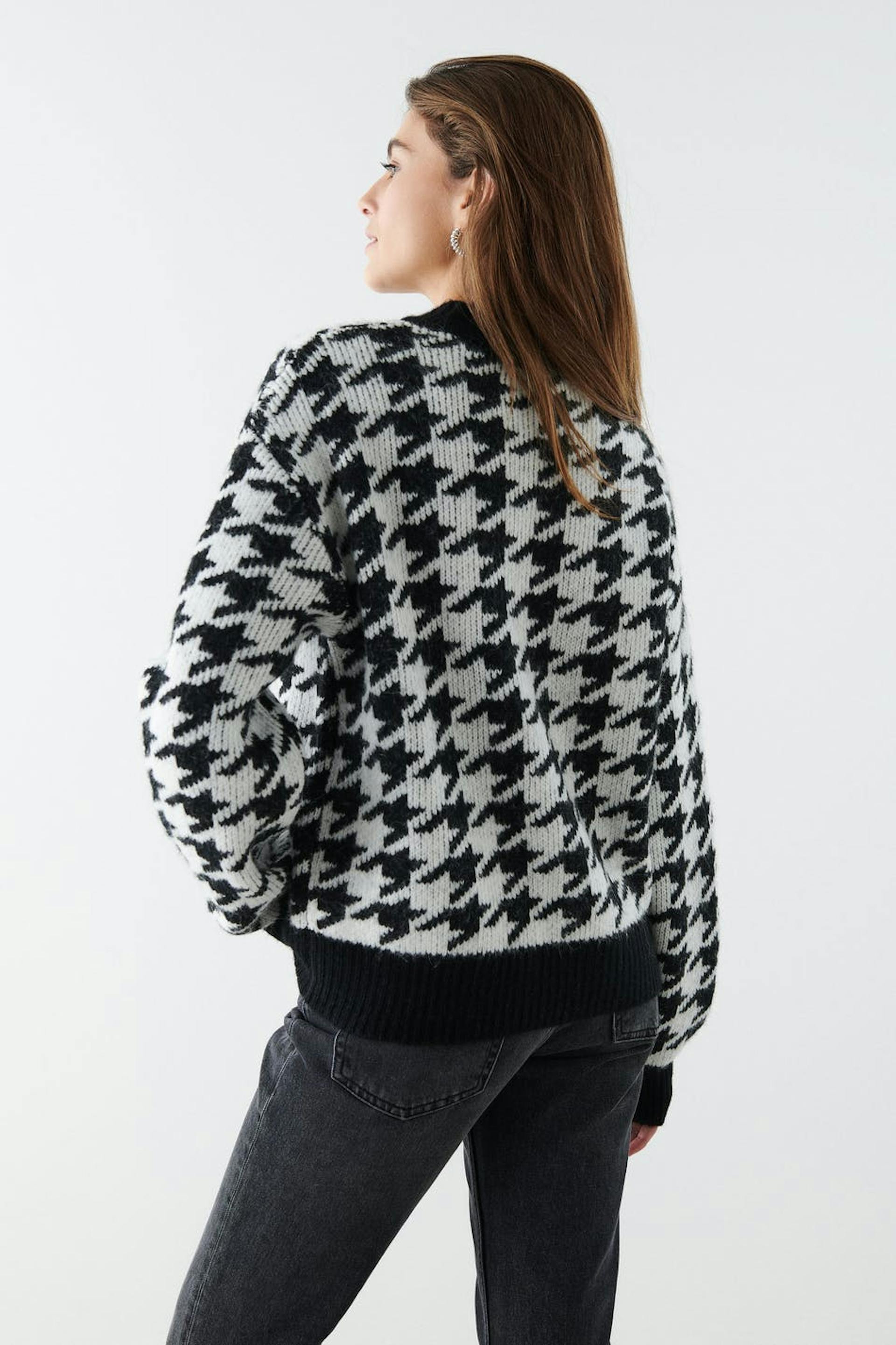 Dog tooth patterned jumper with boxy fit. The jumper is black, white and jacquard-knit. It has crew neckline.