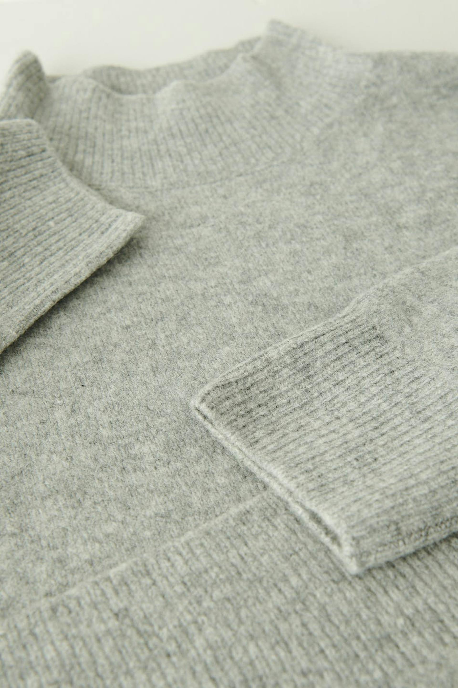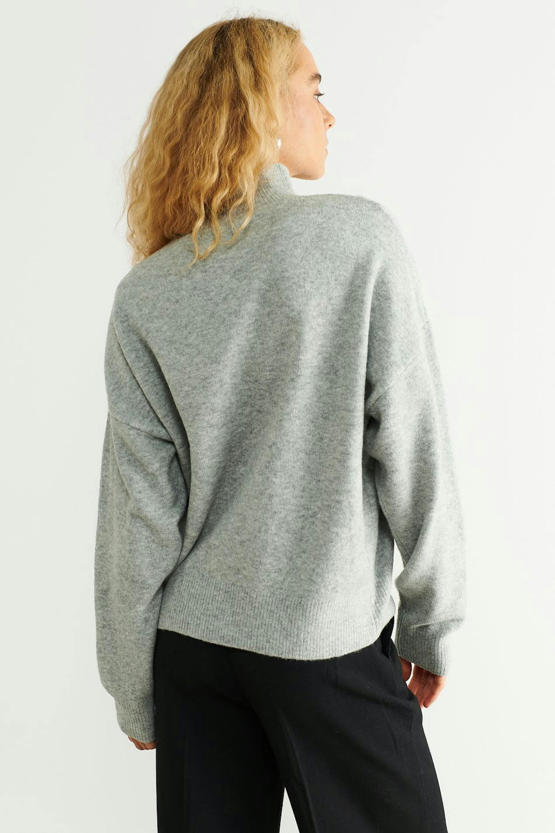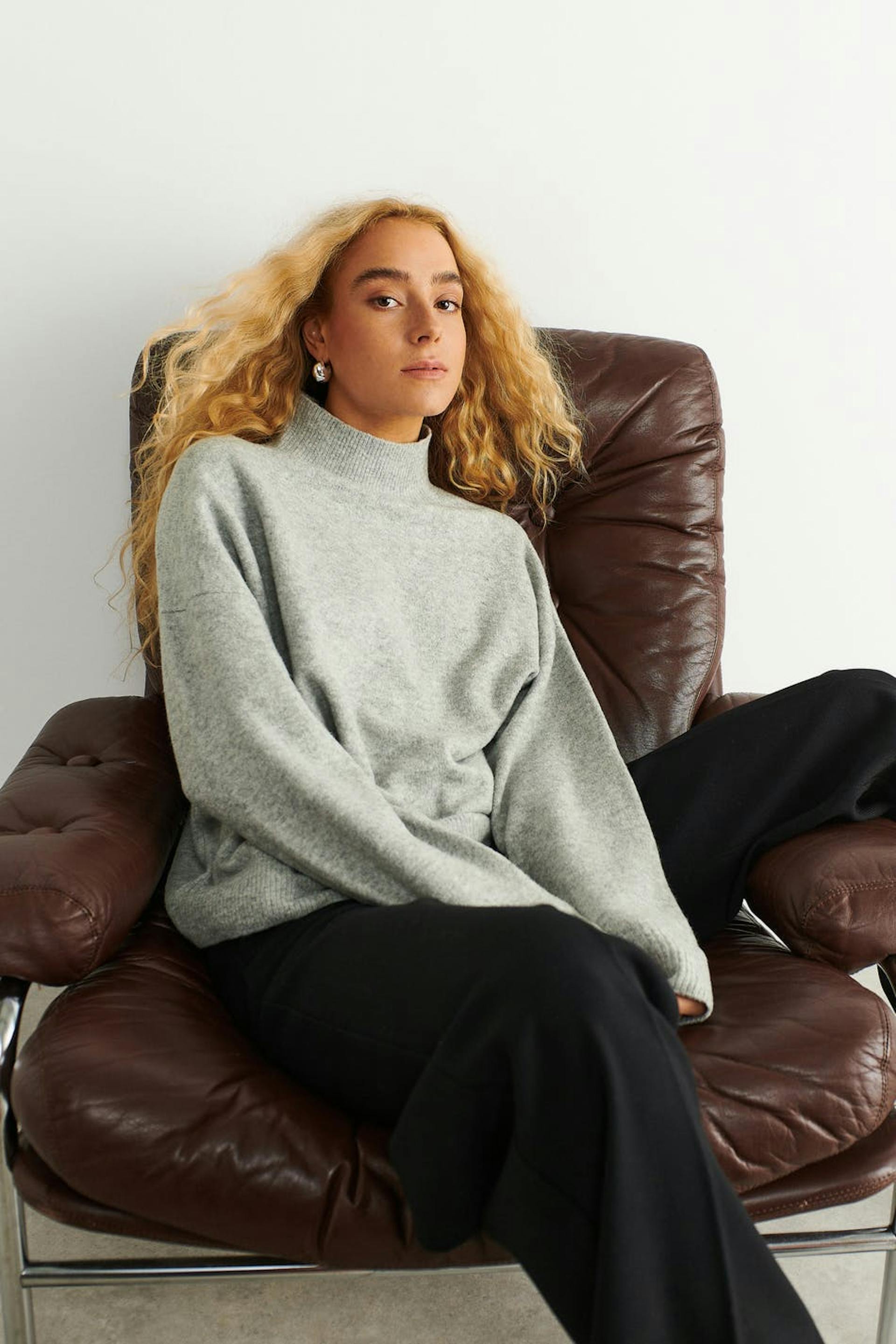 Knitted jumper with turtleneck. The jumper is grey and has a boxy fit. It has dropped shoulders and ribbed hem.