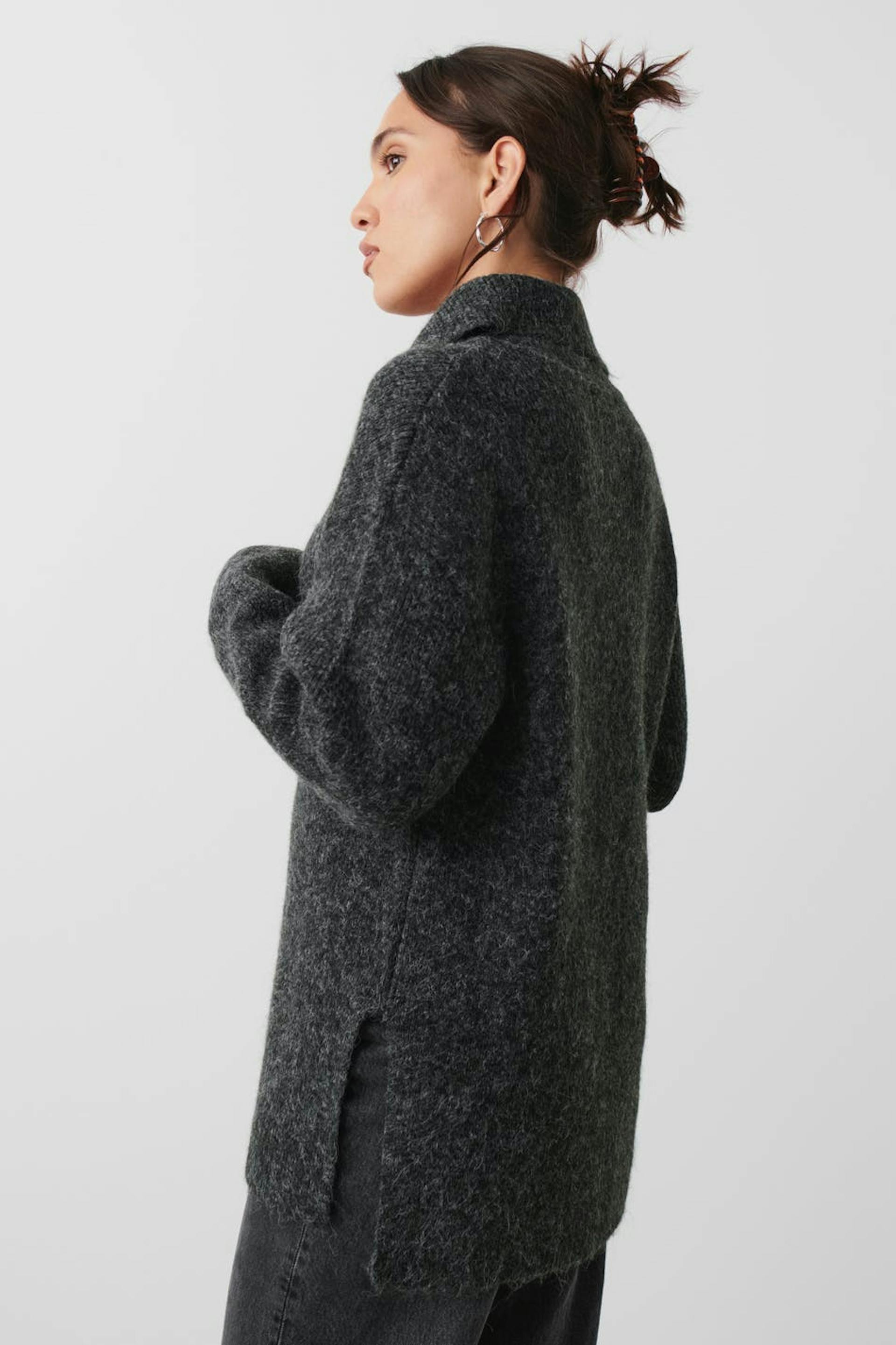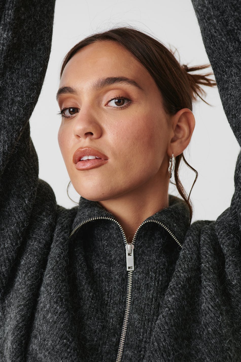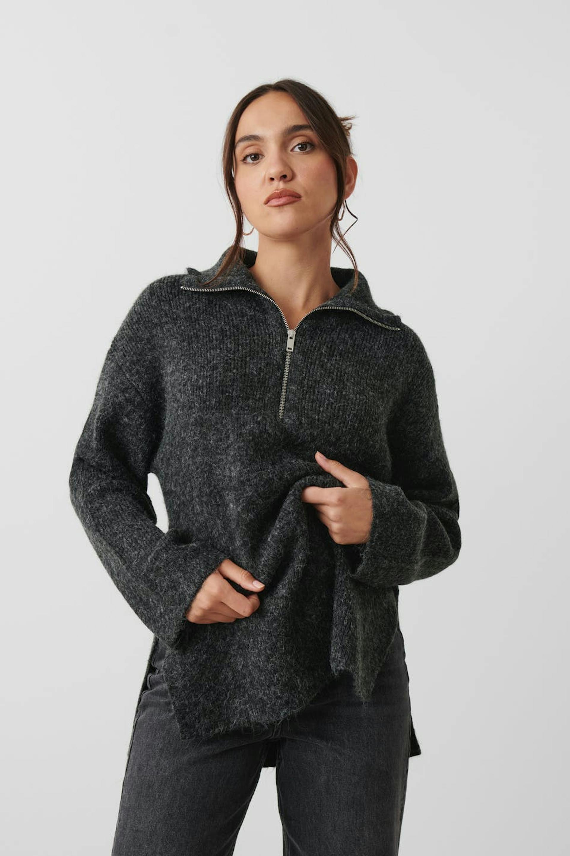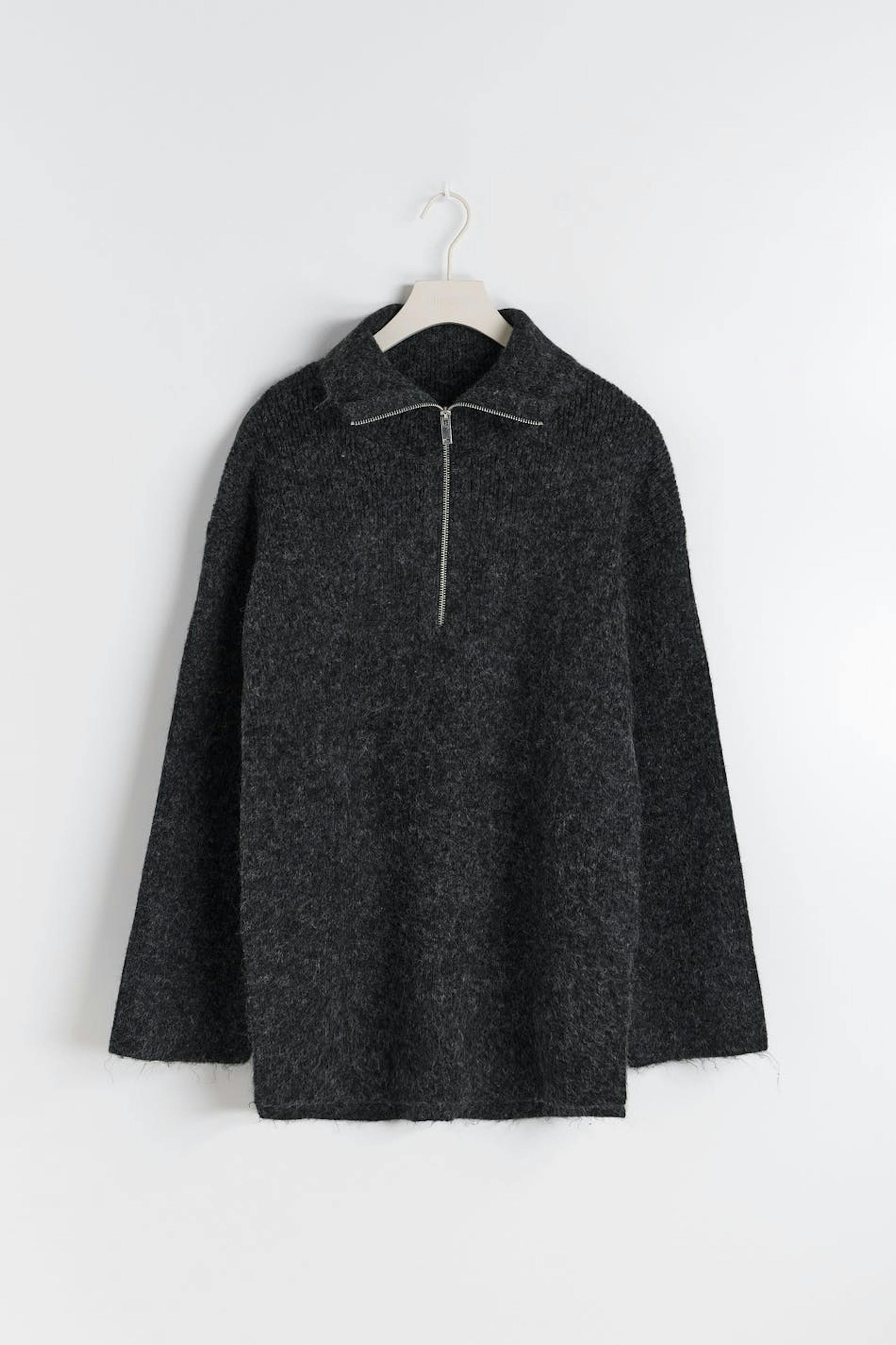 Knitted jumper with a high, zippered collar. The jumper is grey, knitted and ribbed.