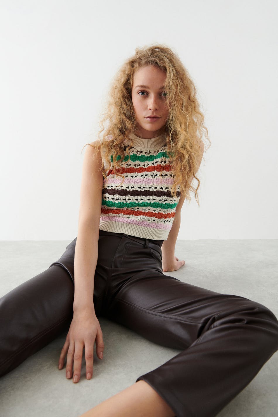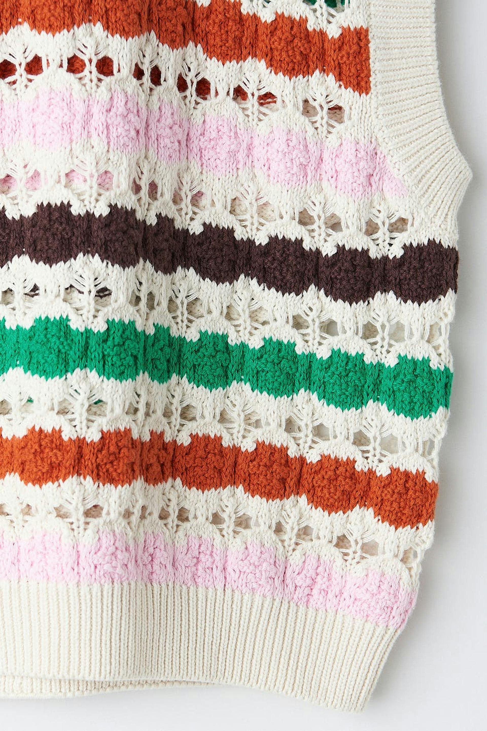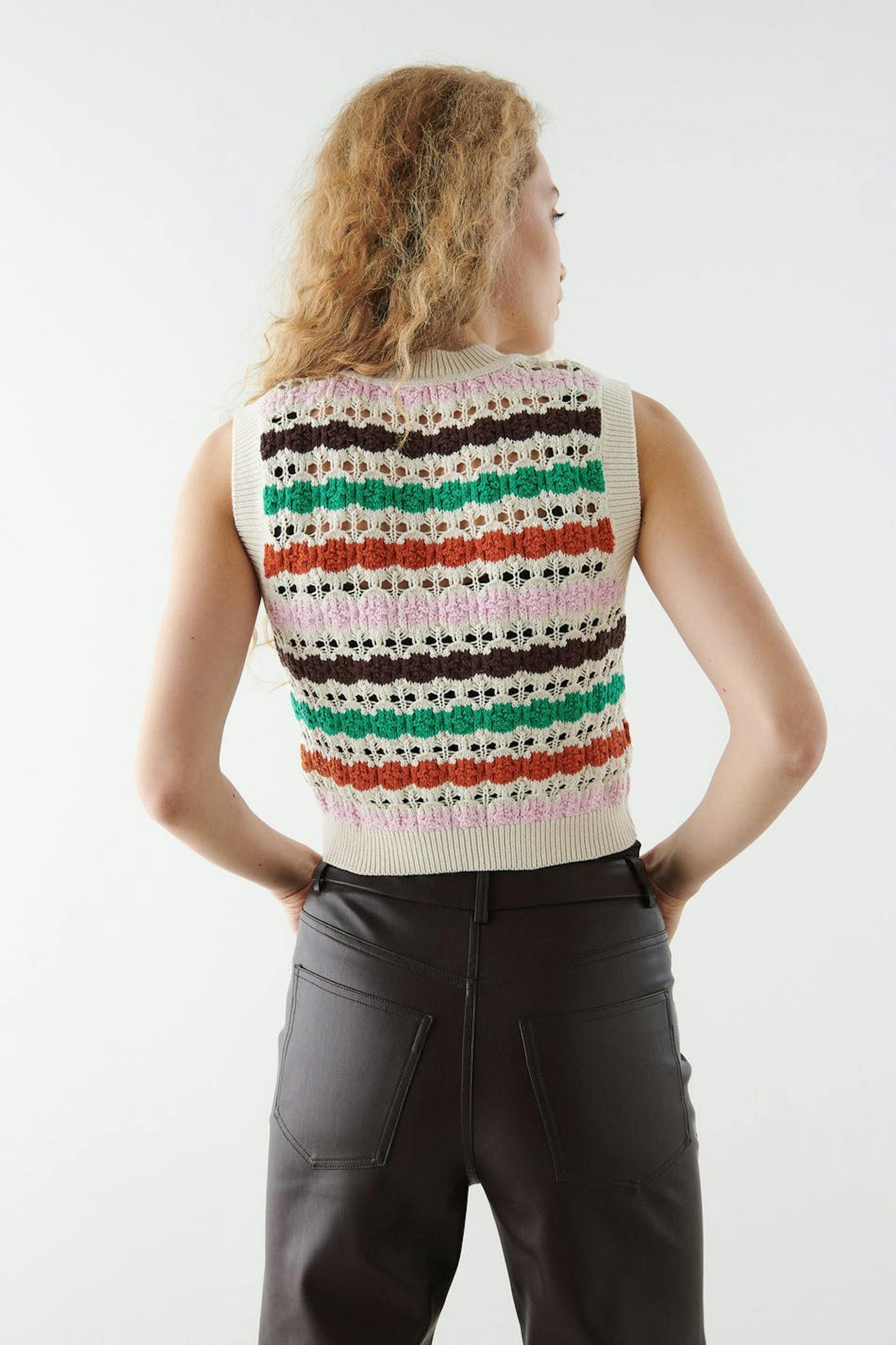 Striped knitted vest with cropped length. The vest is red, green and pink. It has high neckline, straight fit and ribbed hem.