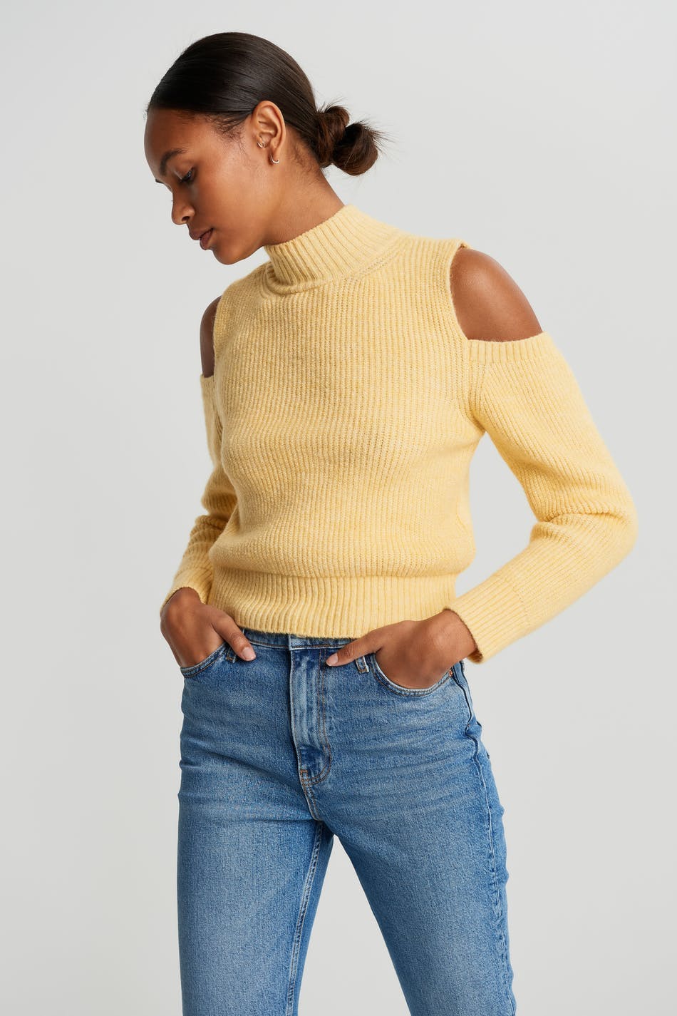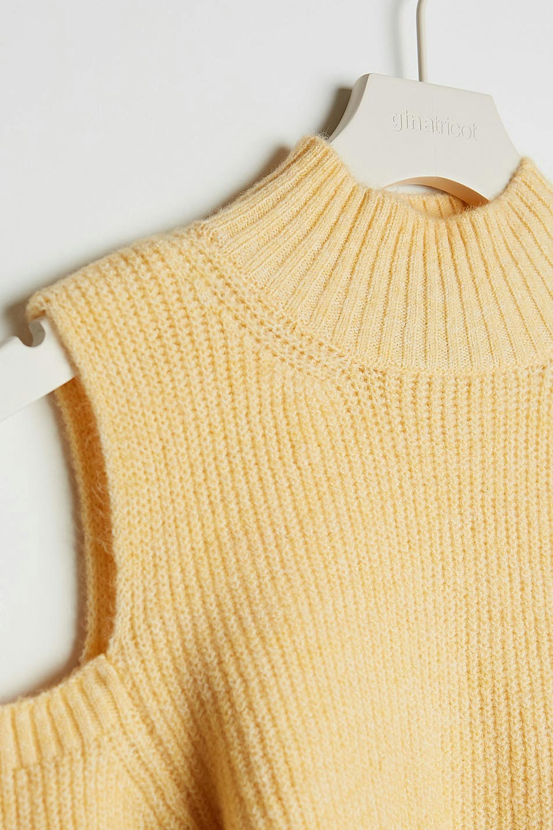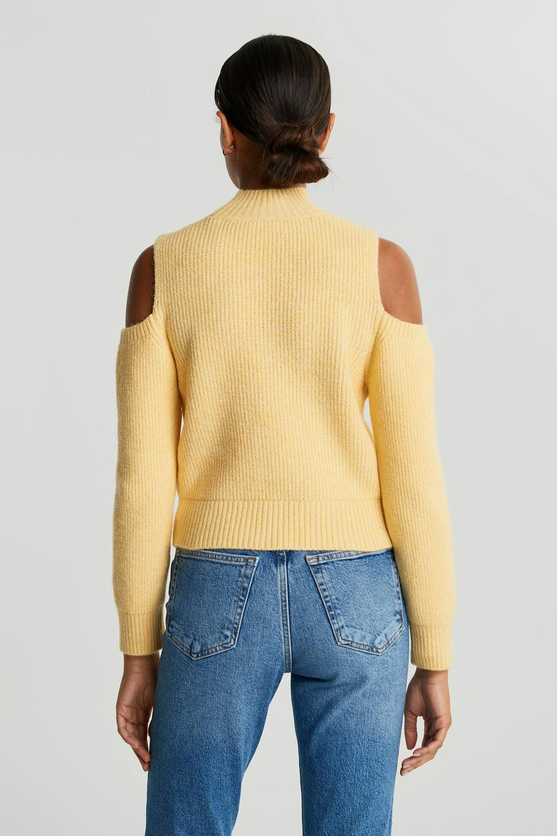 Knitted jumper with cutout details at the shoulders. The jumper is yellow and long-sleeved and has a turtleneck.