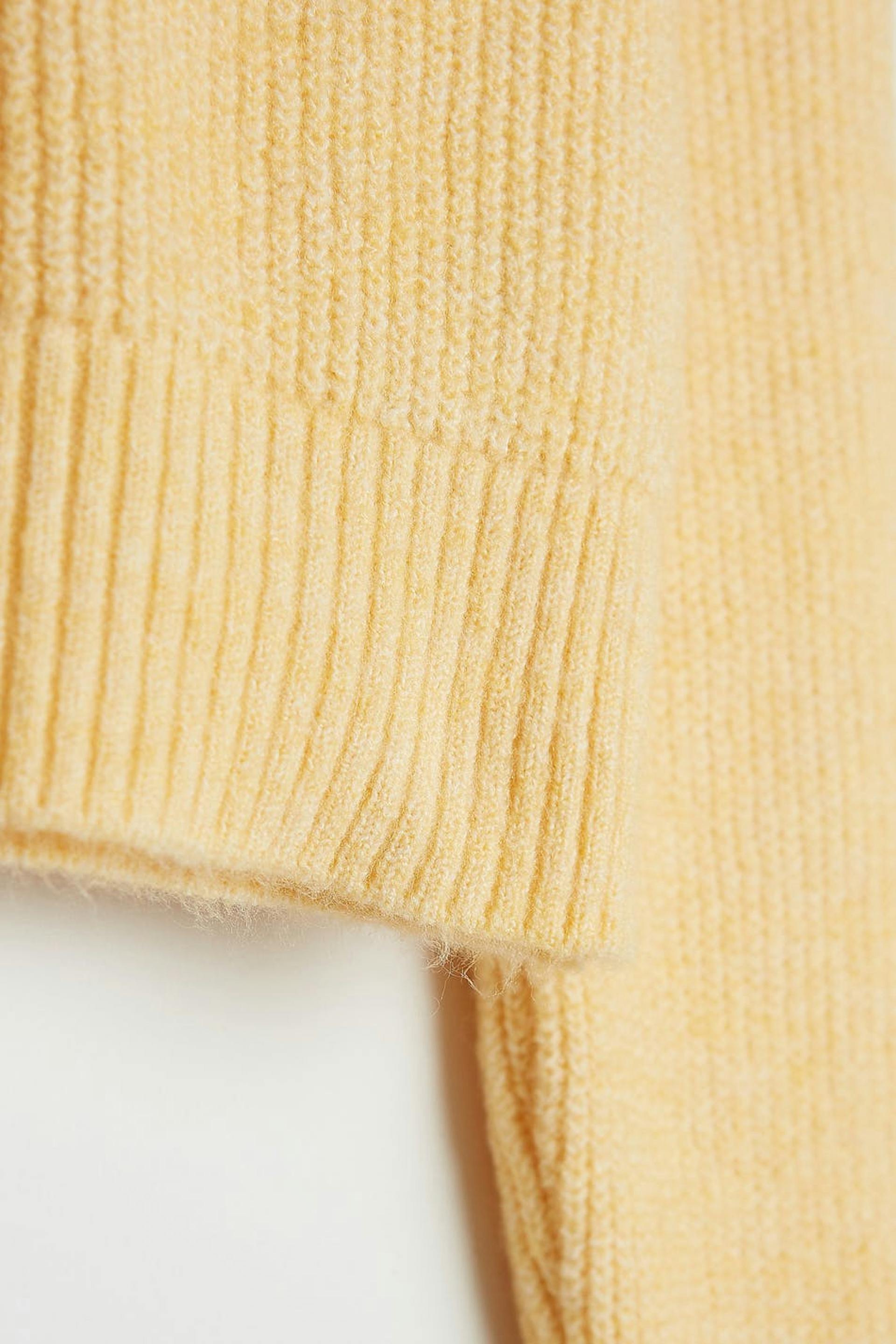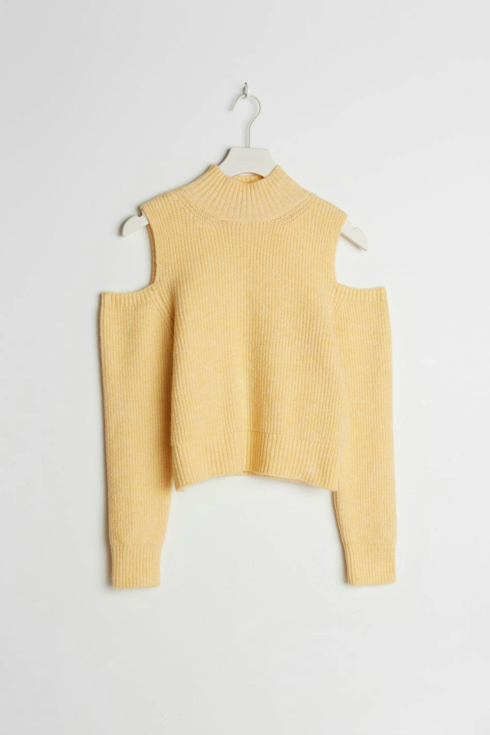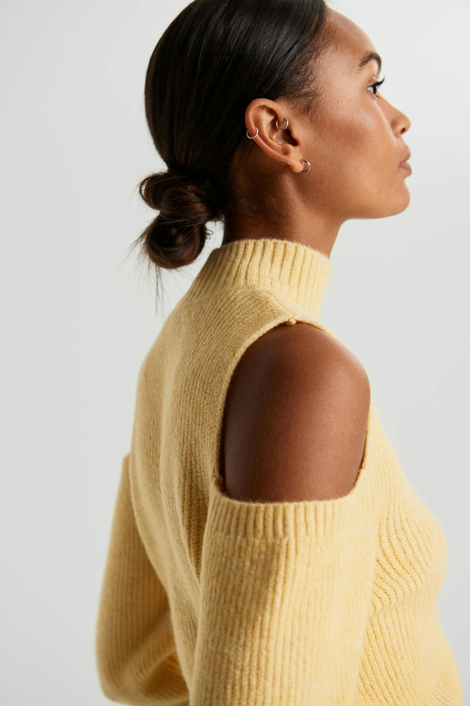 Knitted jumper with cutout details at the shoulders. The jumper is yellow and long-sleeved and has a turtleneck.