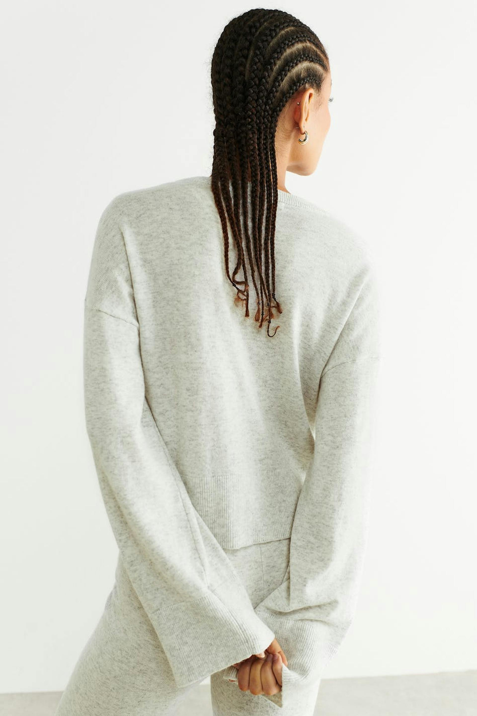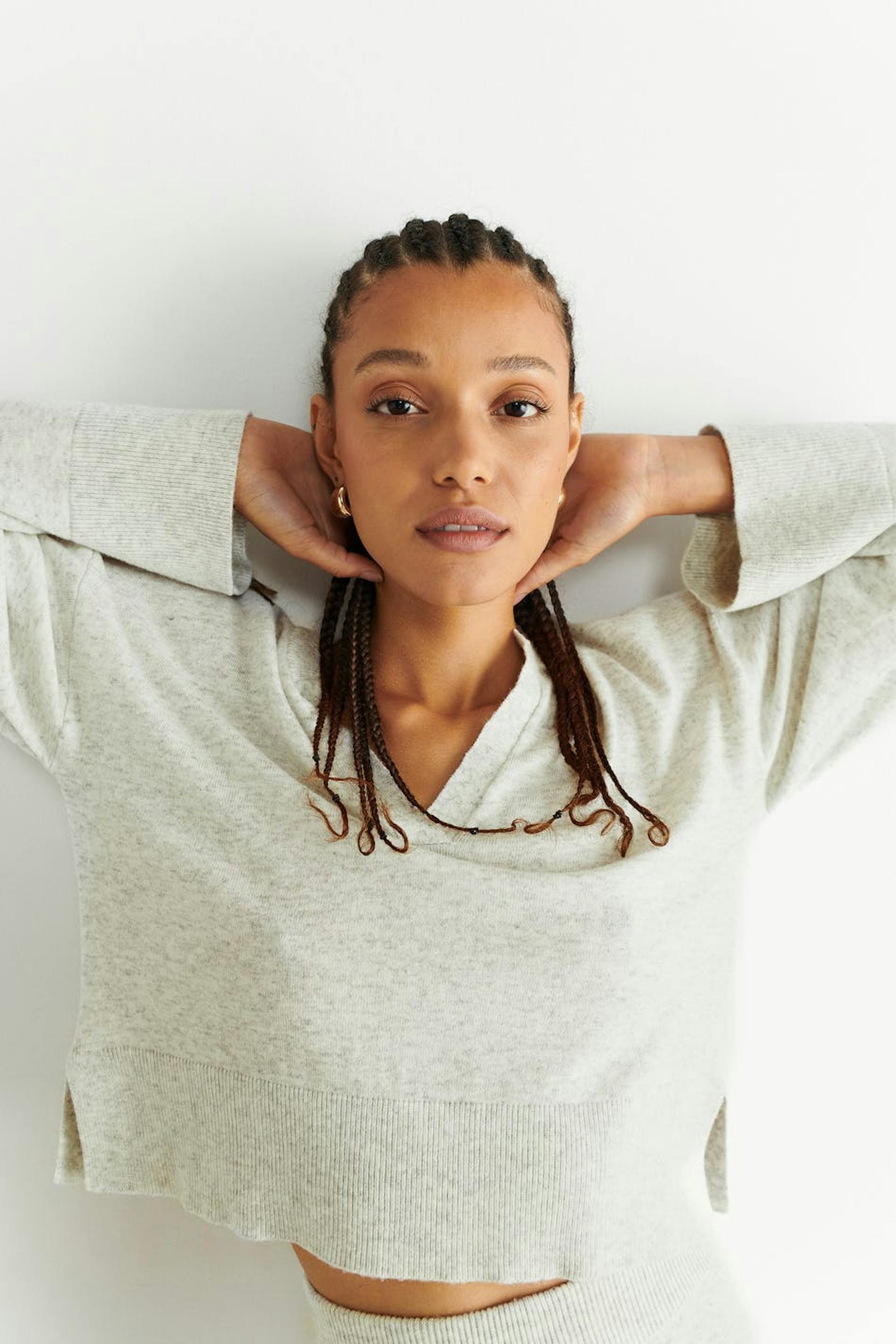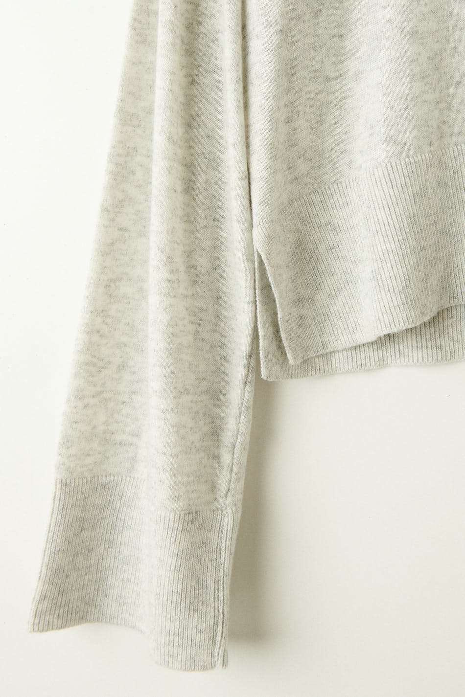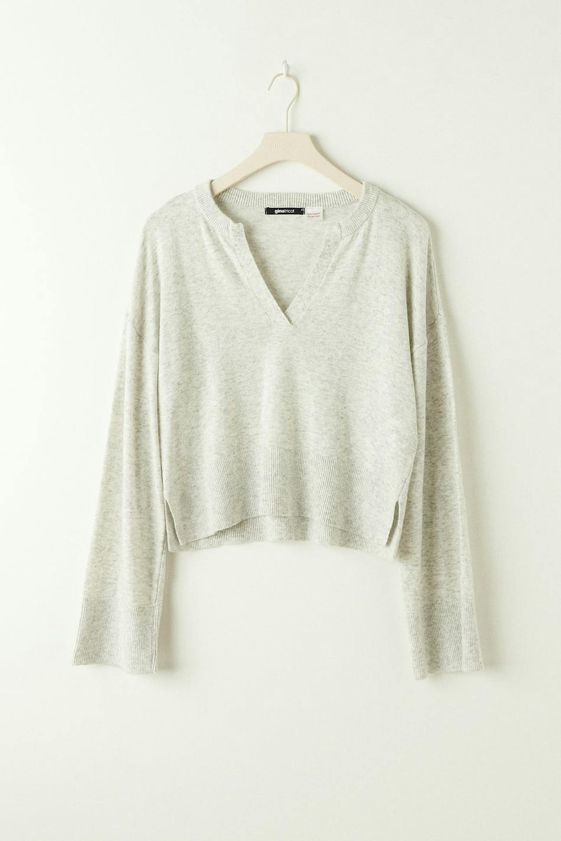Knitted jumper with loose-fitting style. The jumper is grey and has lapped v-neck. It has dropped shoulders, slit in the sides and rib knit at the bottom and on the sleeve ends.