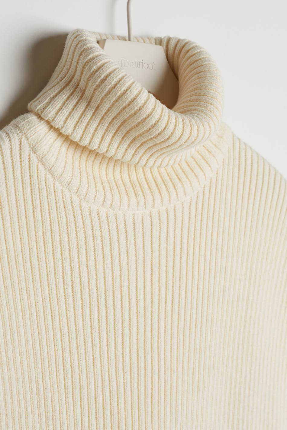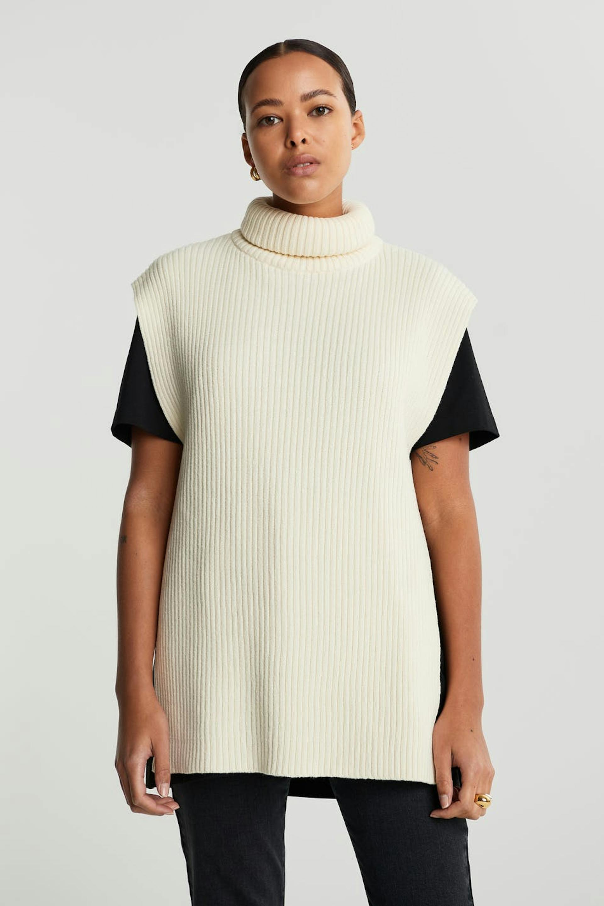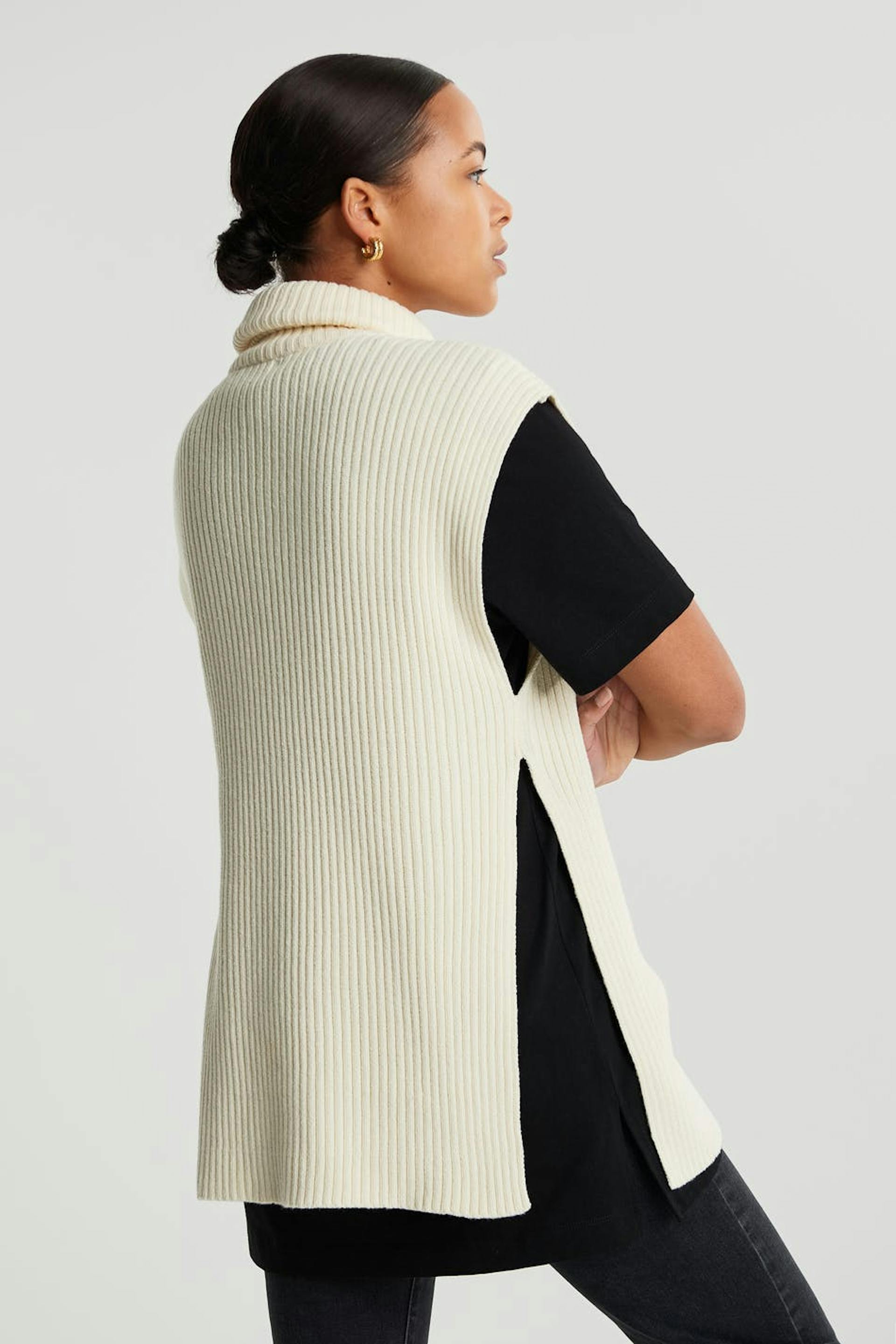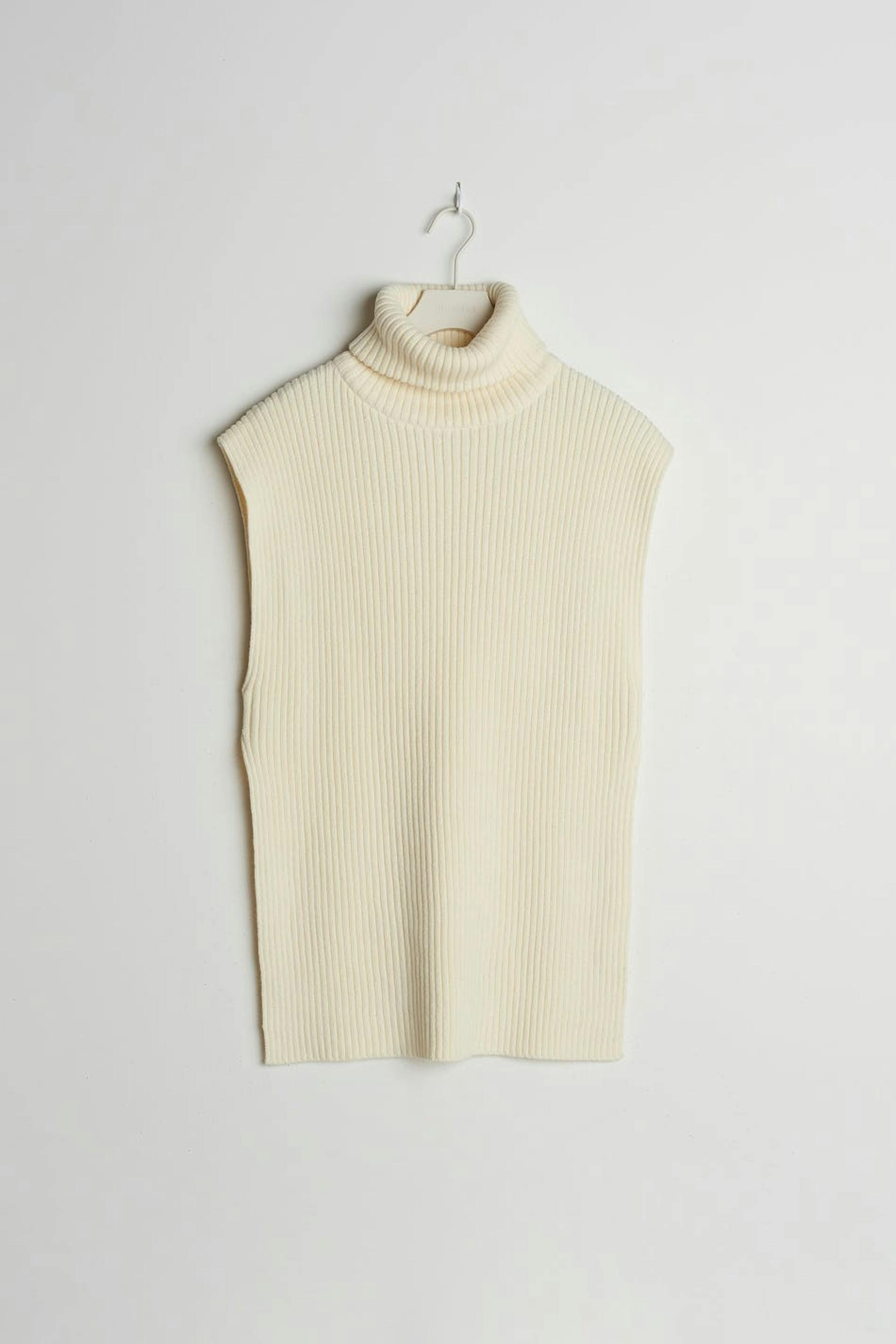 Knitted gilet with a turtleneck. The waistcoat is white and sleeveless and has an oversize, boxy fit. It has a high slit on the sides.