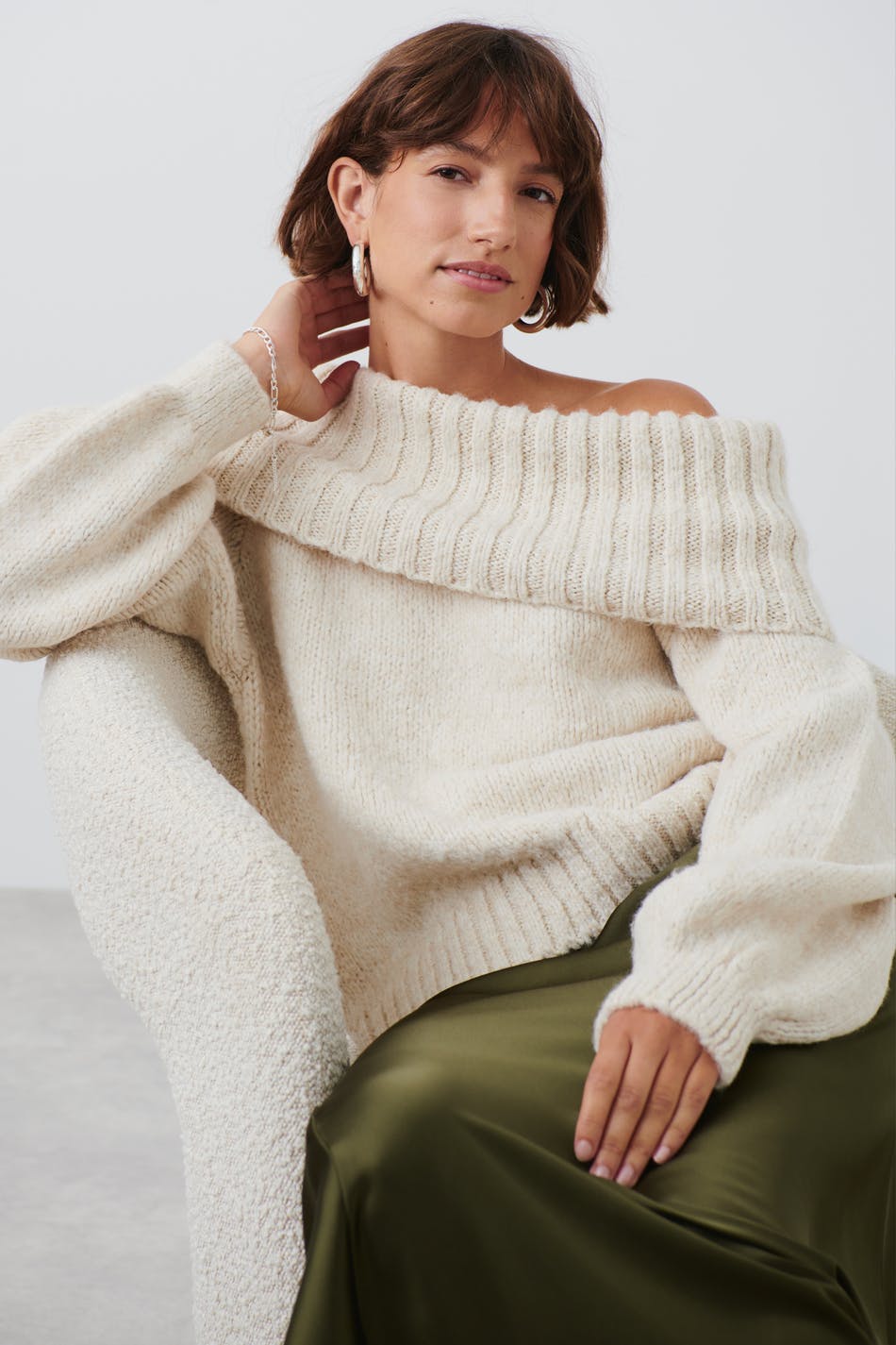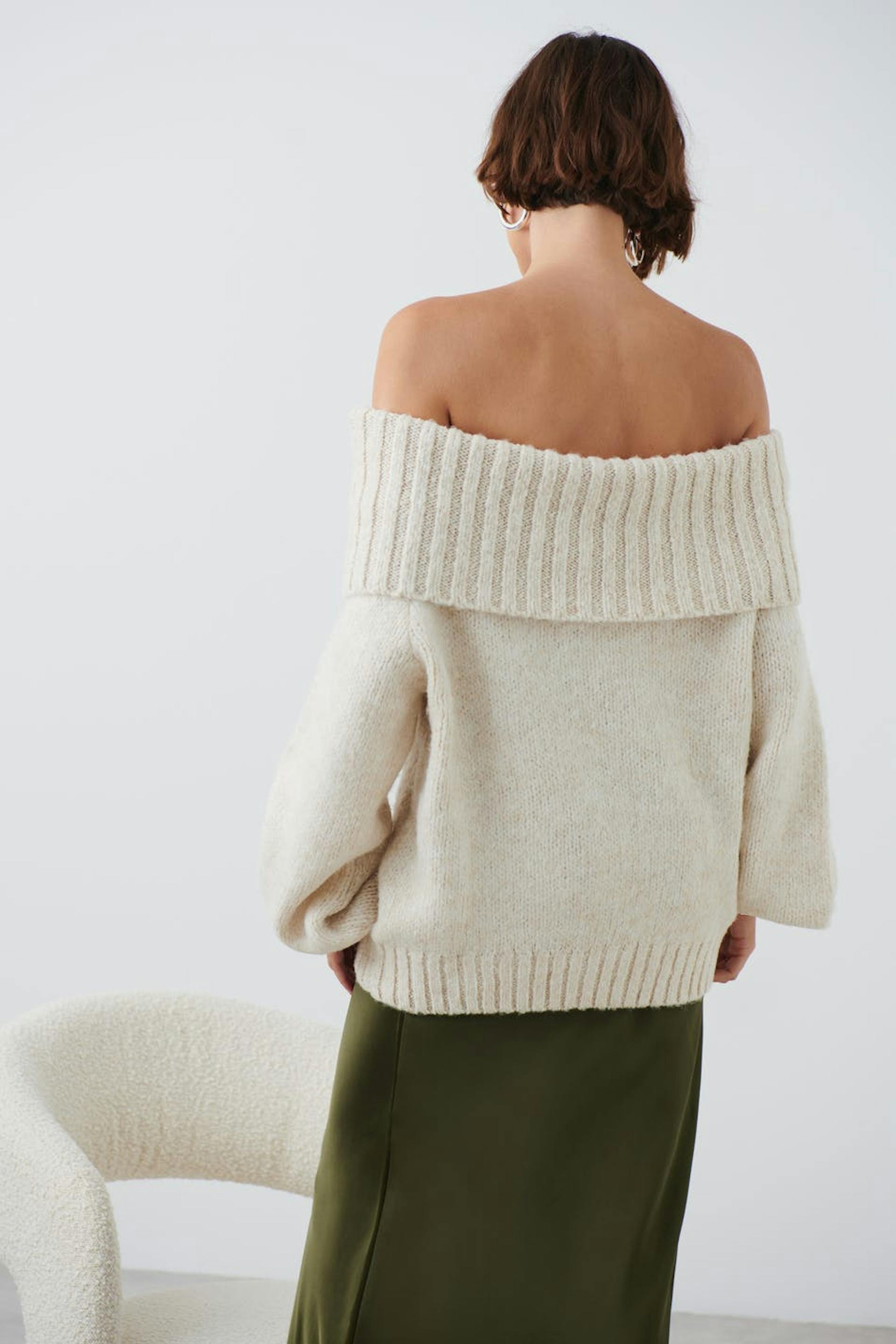 Knitted off the shoulder jumper with folded upper edge. The jumper is white and has long sleeve. It has rib knit on the neckline and at the bottom.
