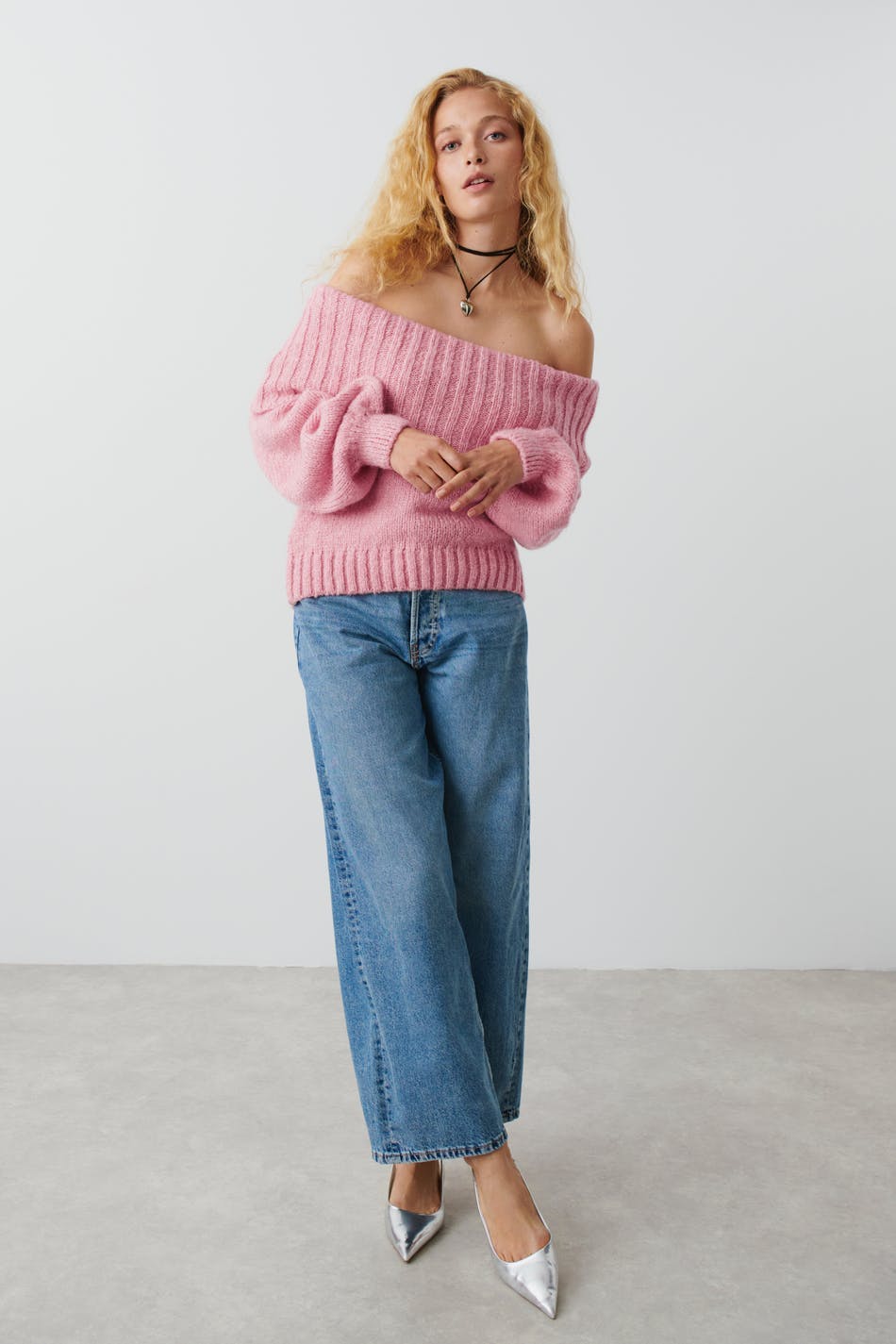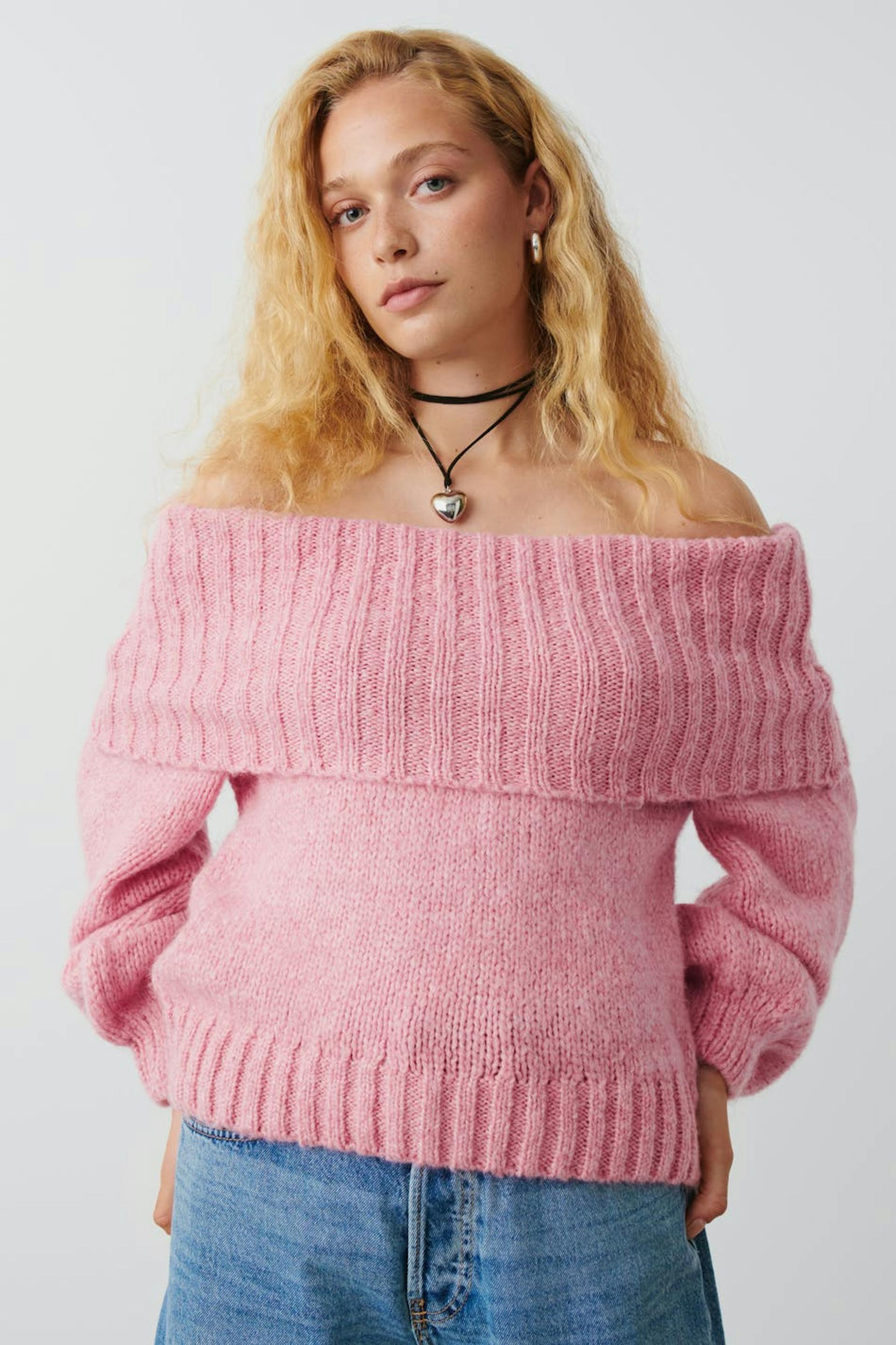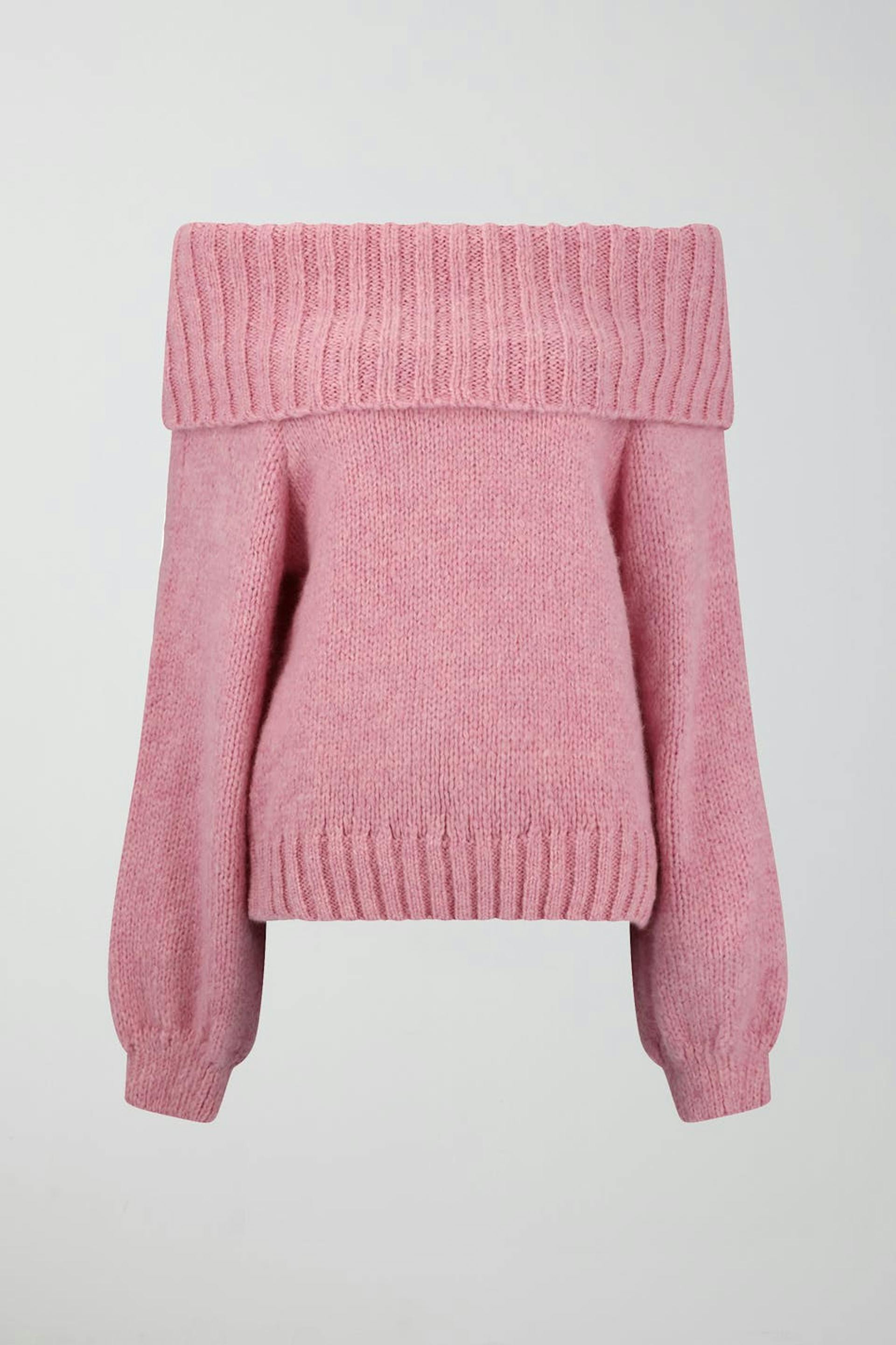 Knitted off the shoulder jumper with folded upper edge. The jumper is pink and has long sleeve. It has rib knit on the neckline and at the bottom.