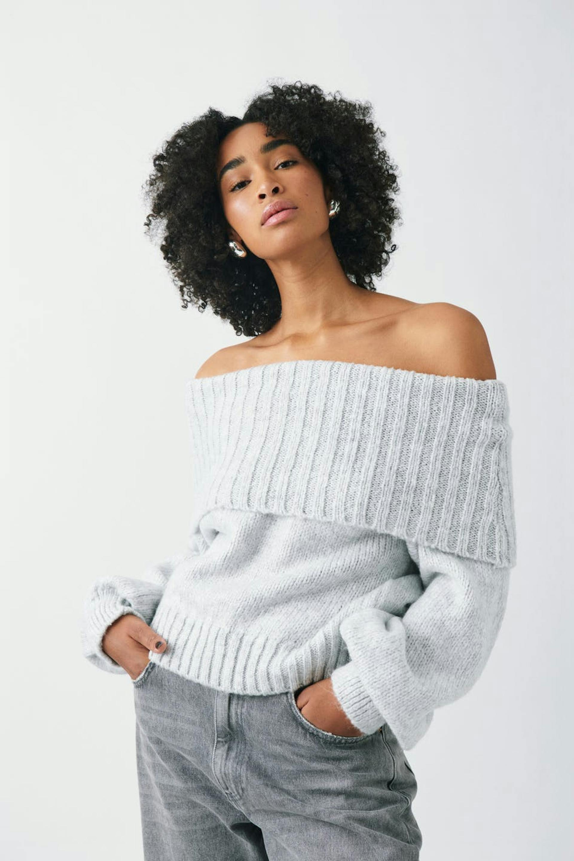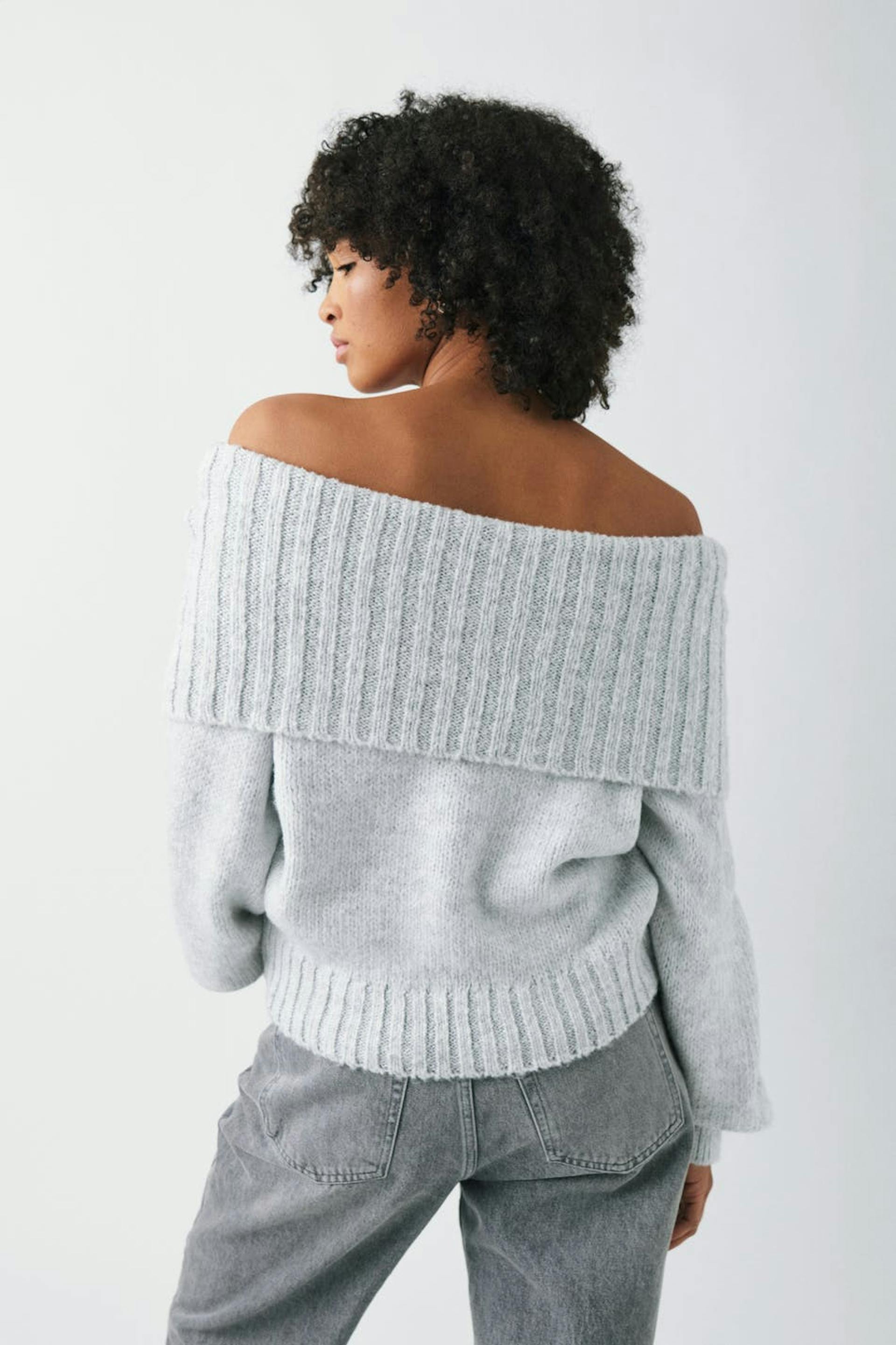 Knitted off the shoulder jumper with folded upper edge. The jumper is grey and has long sleeve. It has rib knit on the neckline and at the bottom.