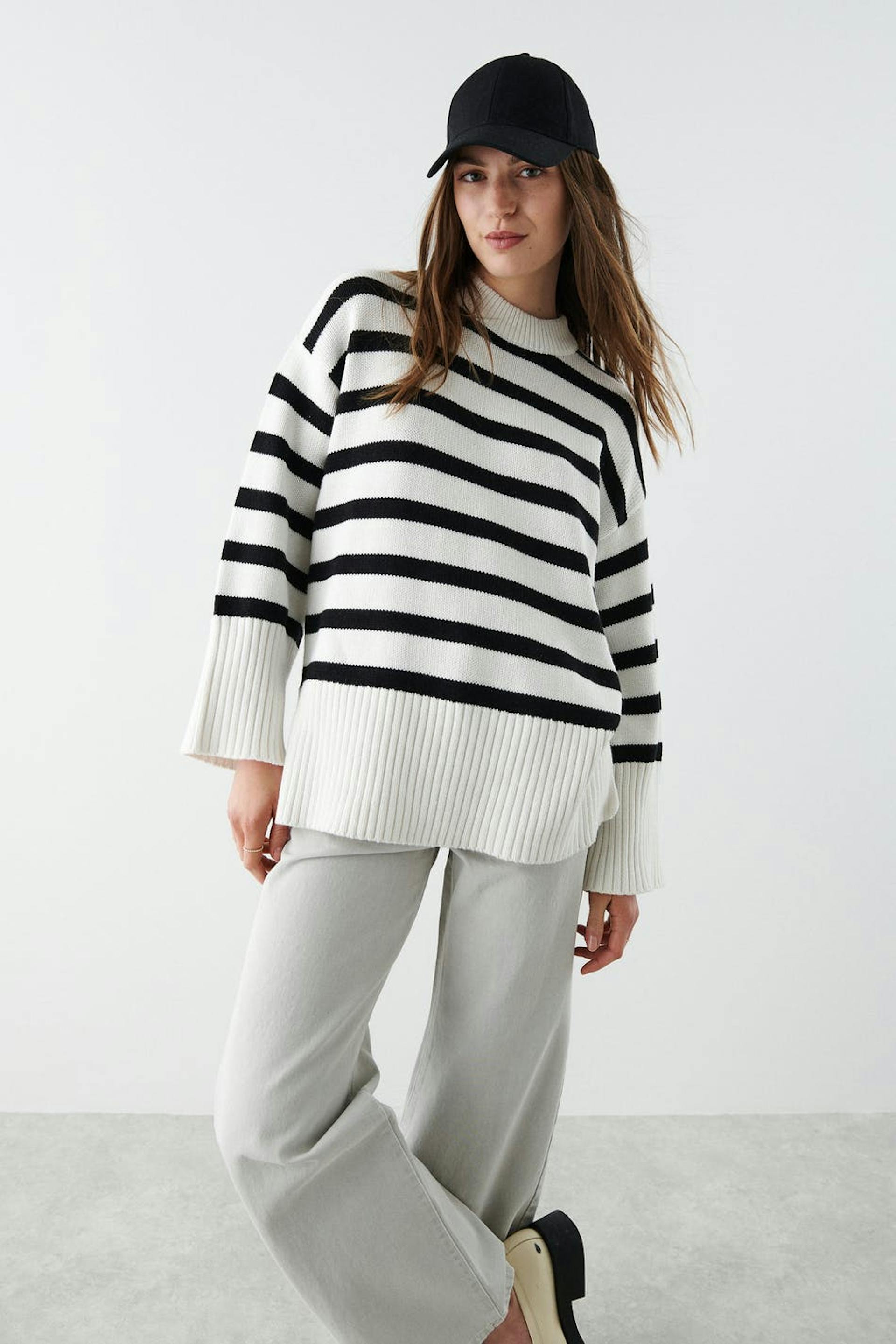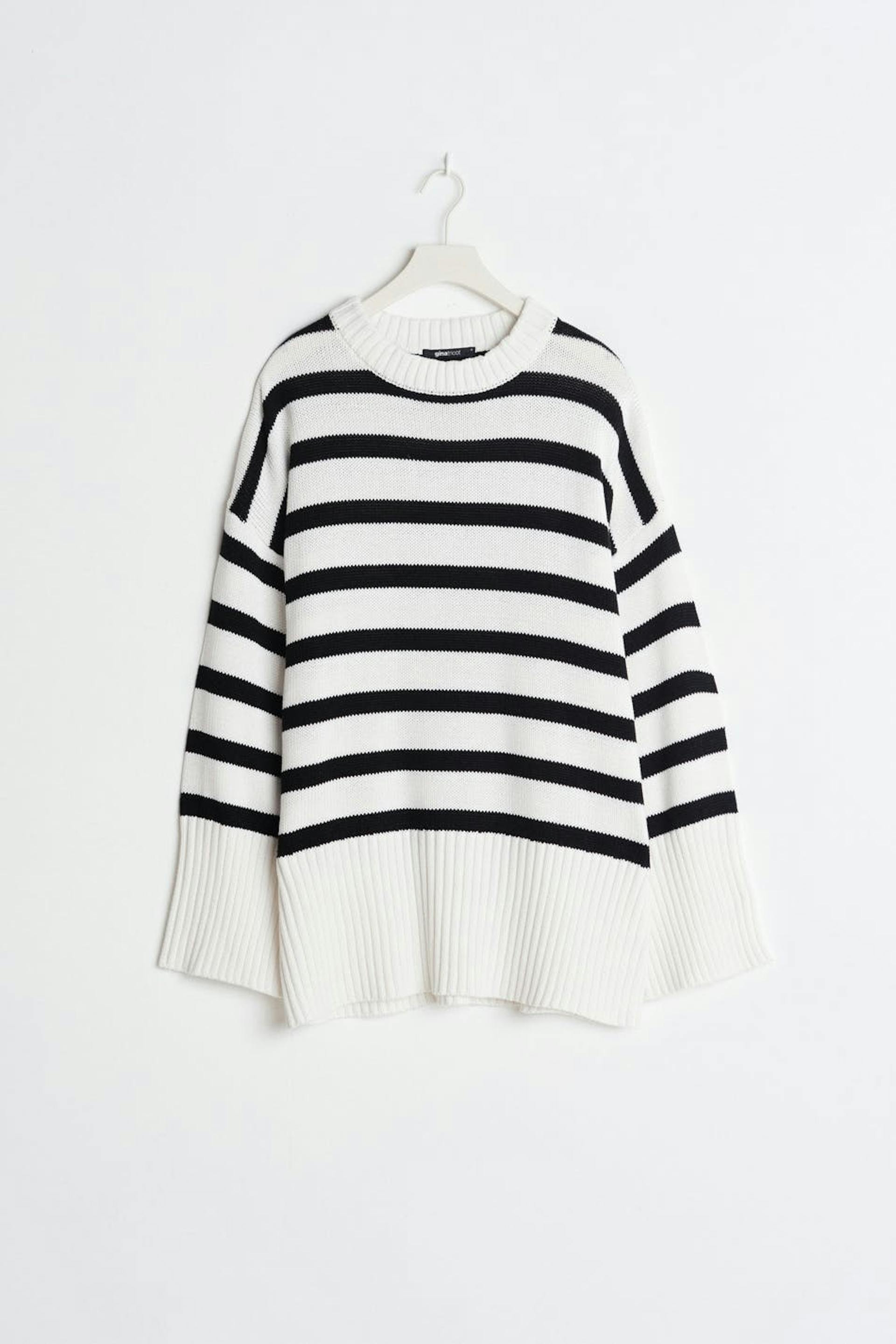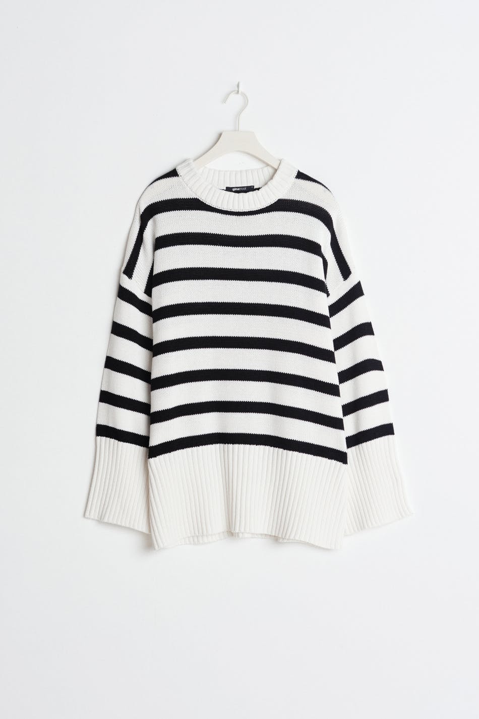 Striped knitted sweater with loose-fitting style. The sweat is white and has long sleeves. It has round neckline, slit in the sides, dropped shoulders and a wide, ribbed hemline at the bottom and on the sleeve ends.