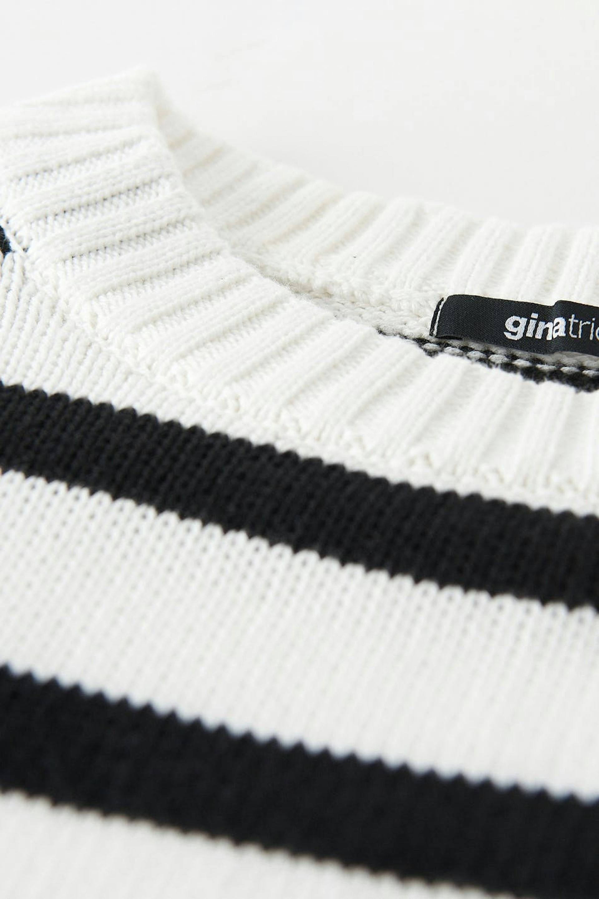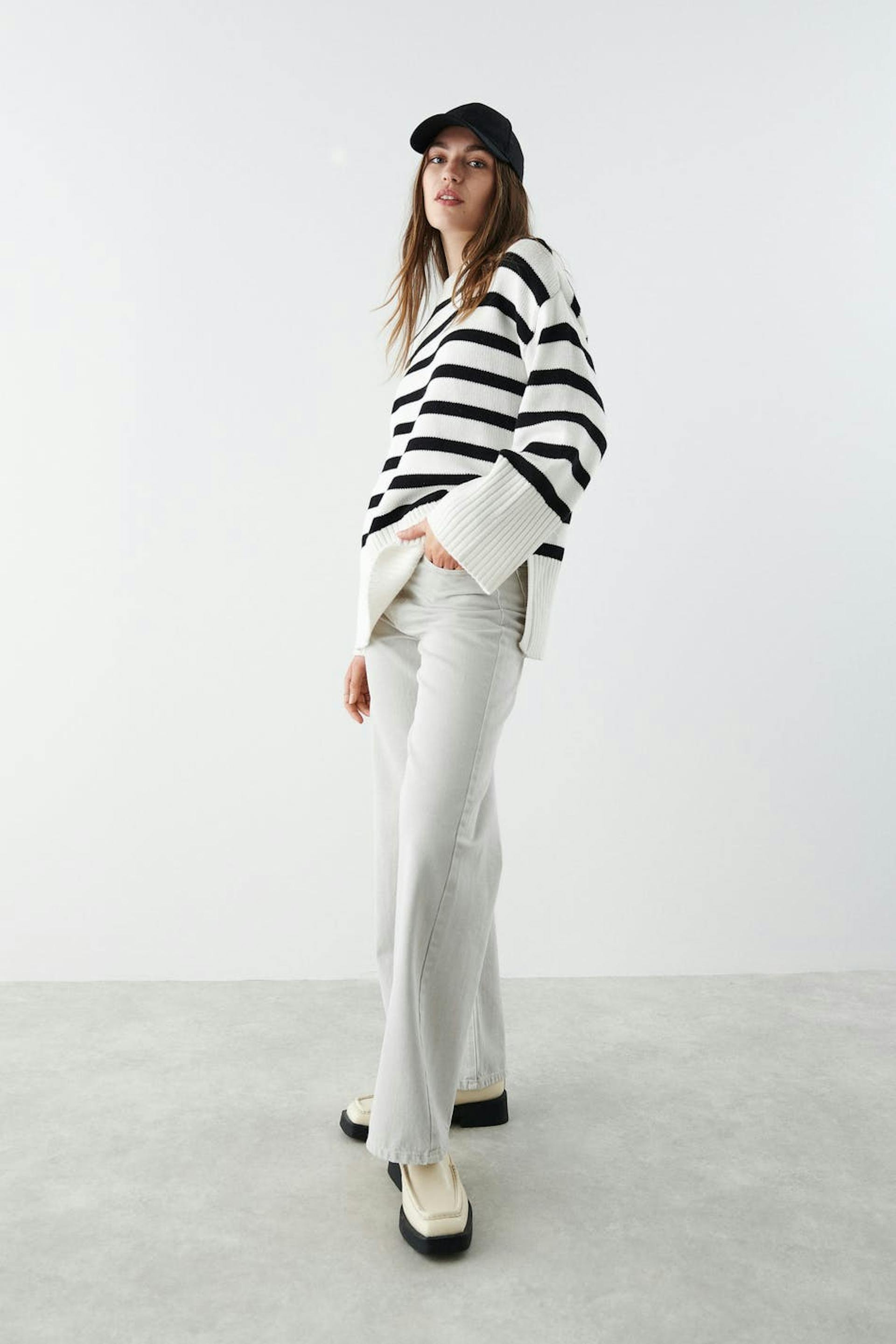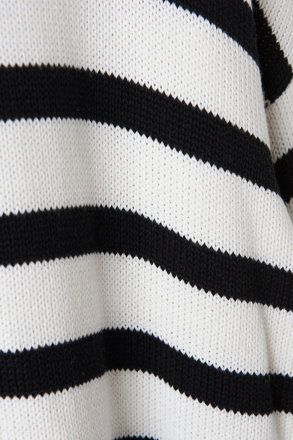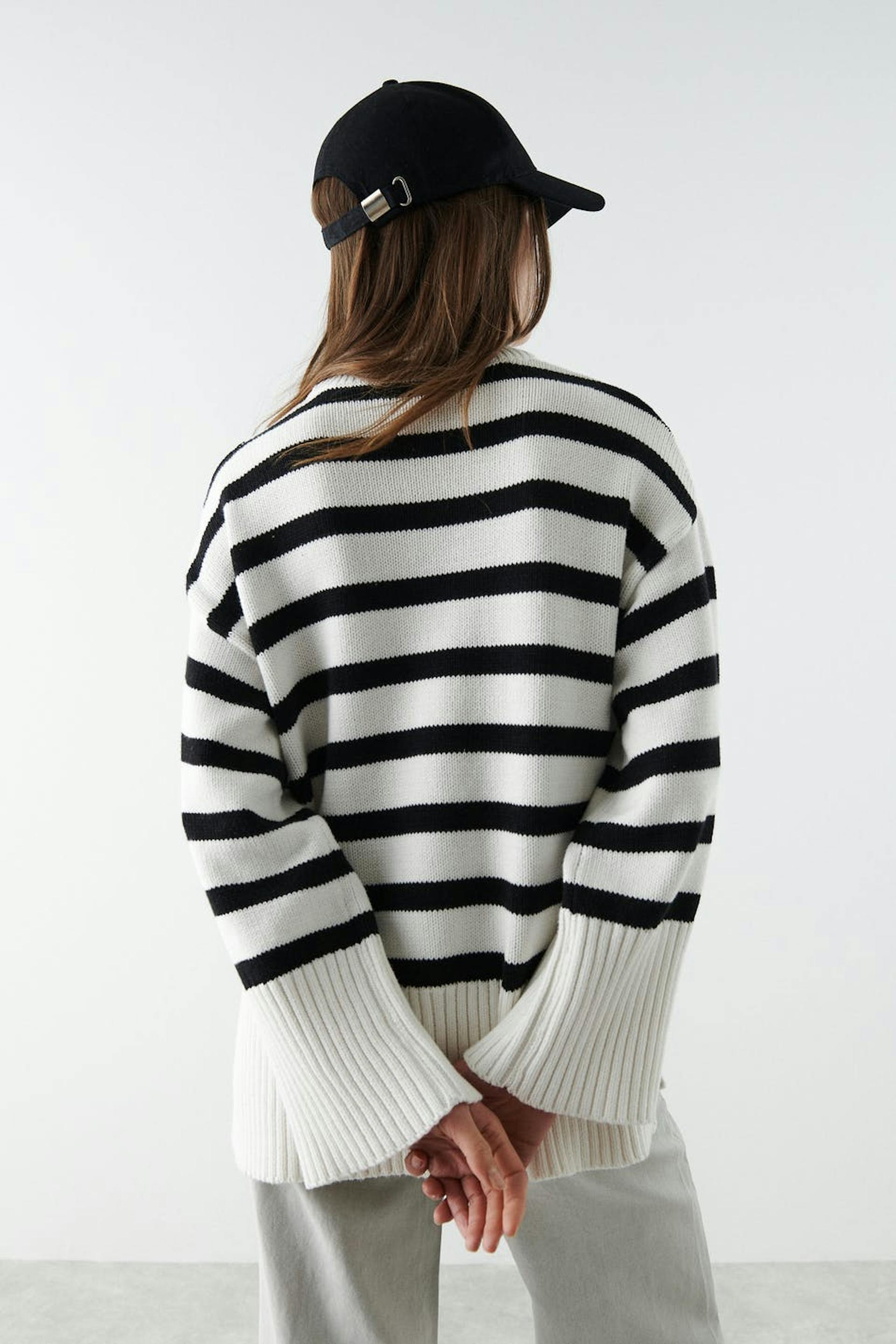 Striped knitted sweater with loose-fitting style. The sweat is white and has long sleeves. It has round neckline, slit in the sides, dropped shoulders and a wide, ribbed hemline at the bottom and on the sleeve ends.