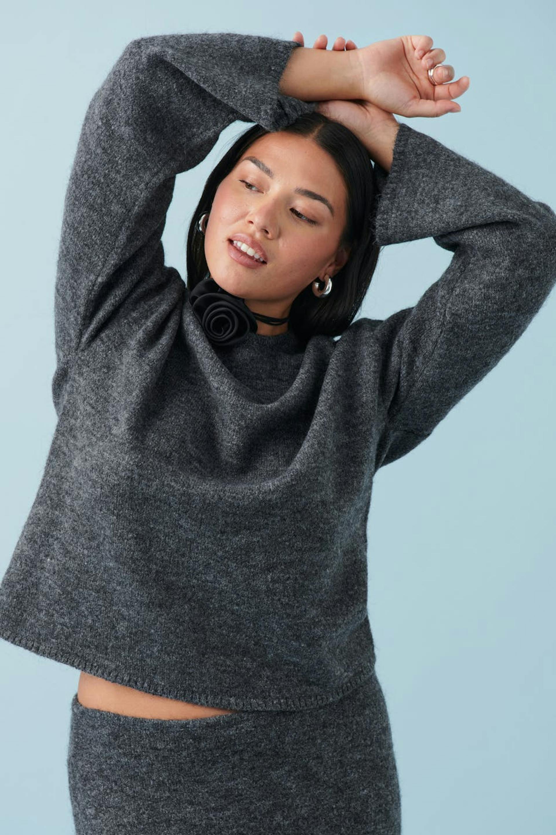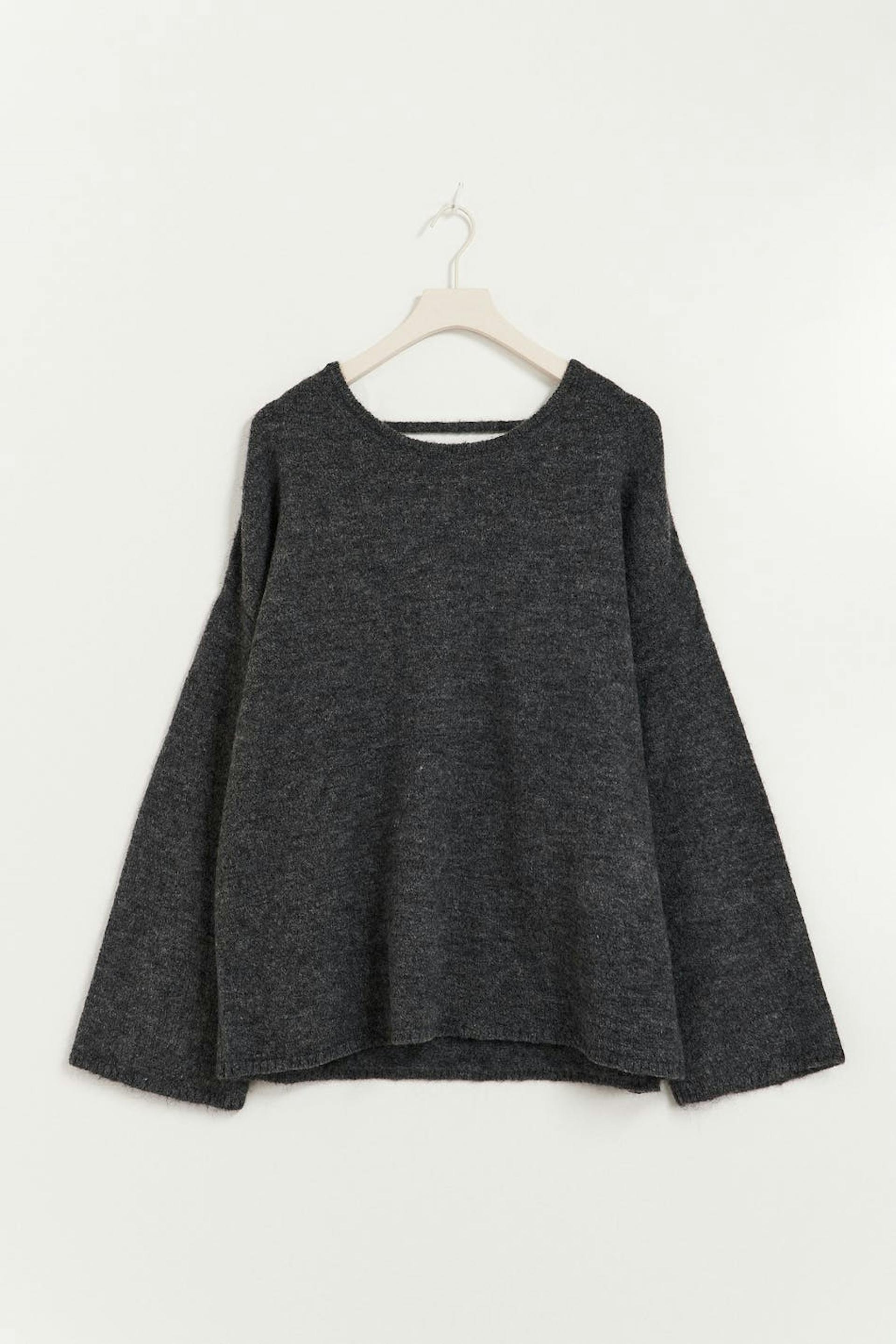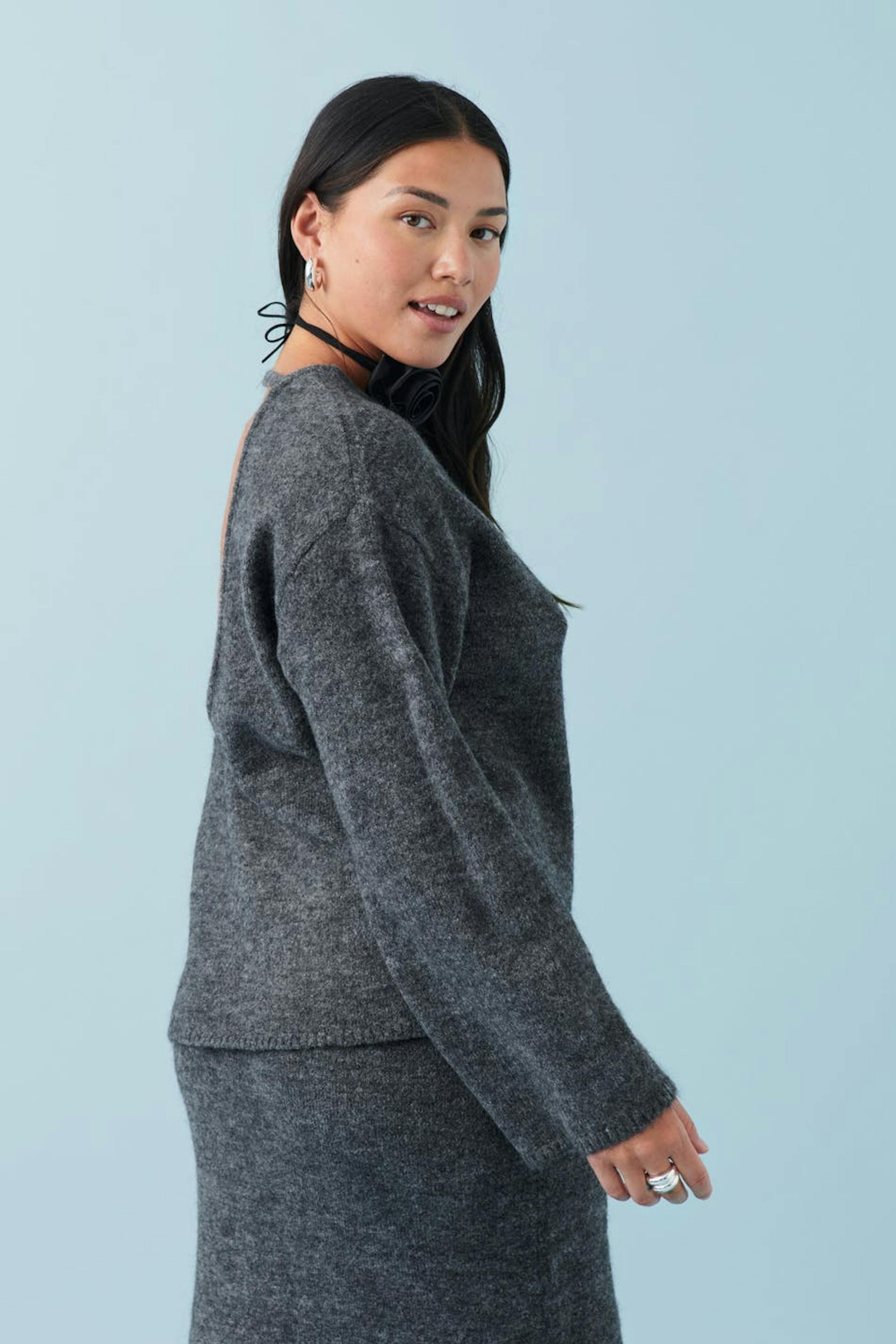 Knitted sweater with open back. The sweat is grey and has soft quality. It has boxy fit, round neckline, long sleeve and rib knit at sleeve ends and at the bottom.