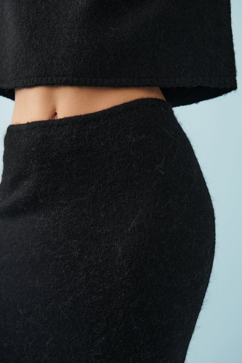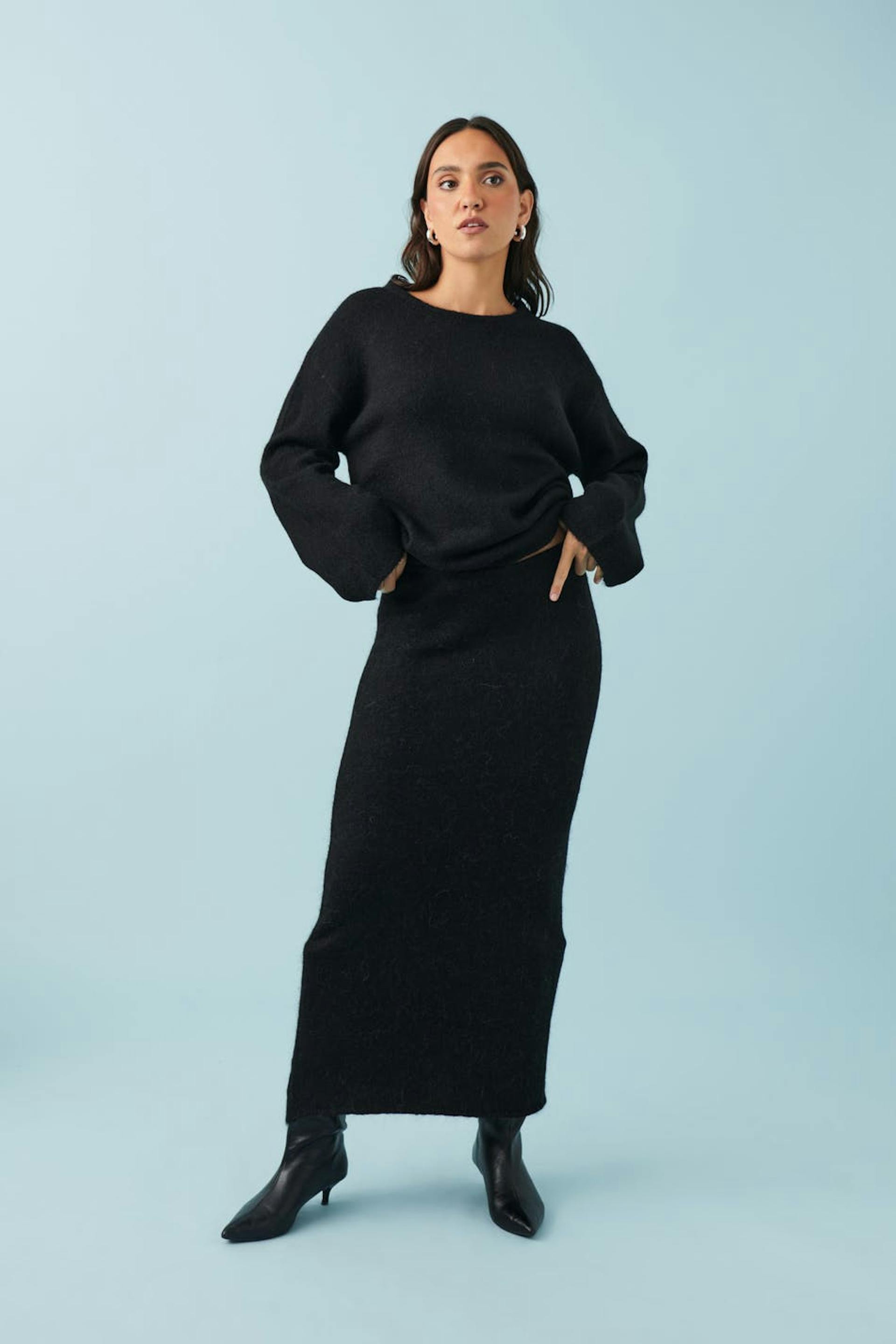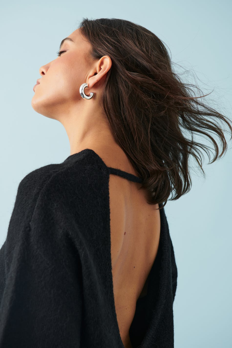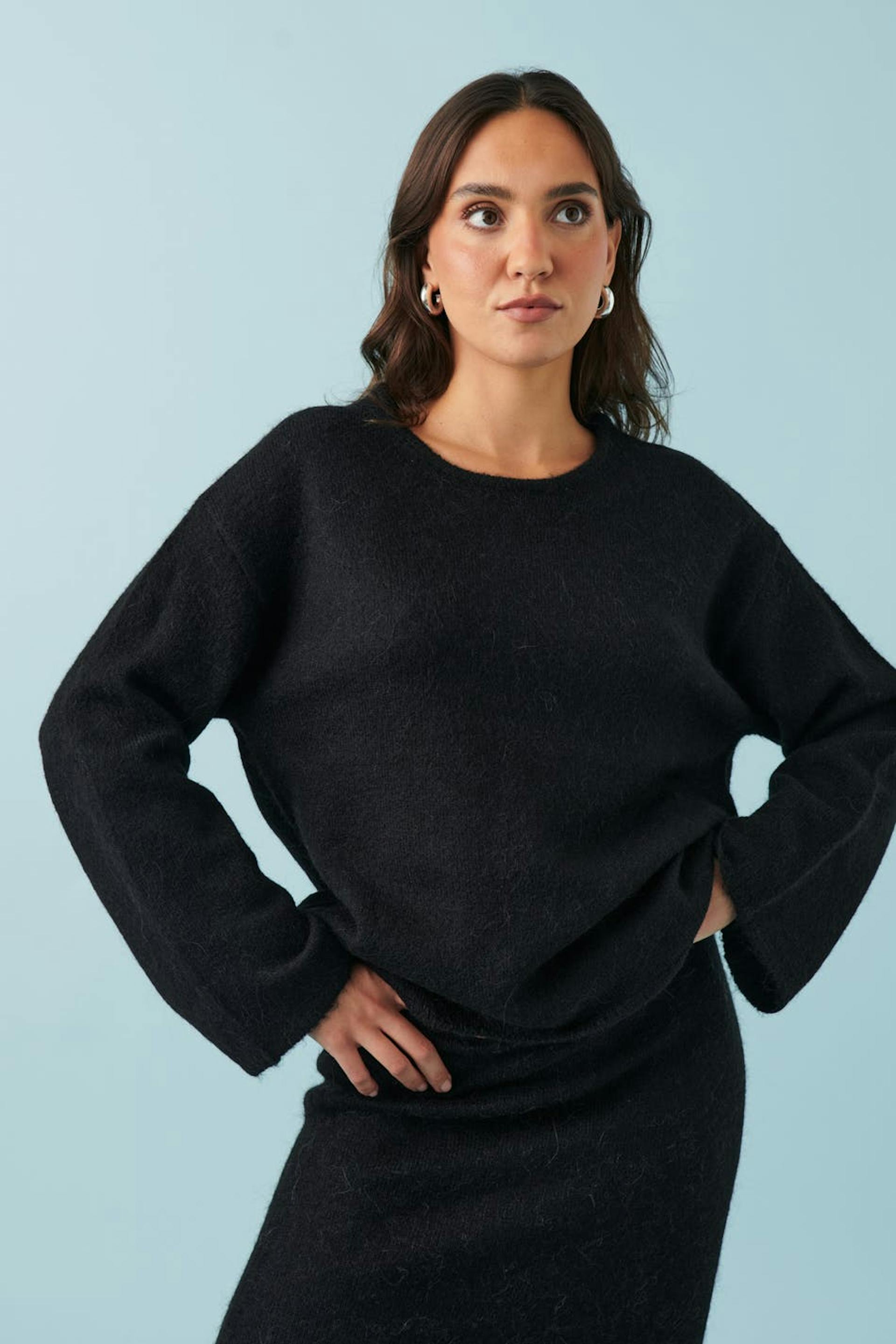 Knitted jumper with open back. The jumper is black and has soft quality. It has boxy fit, round neckline, long sleeve and rib knit at sleeve ends and at the bottom.