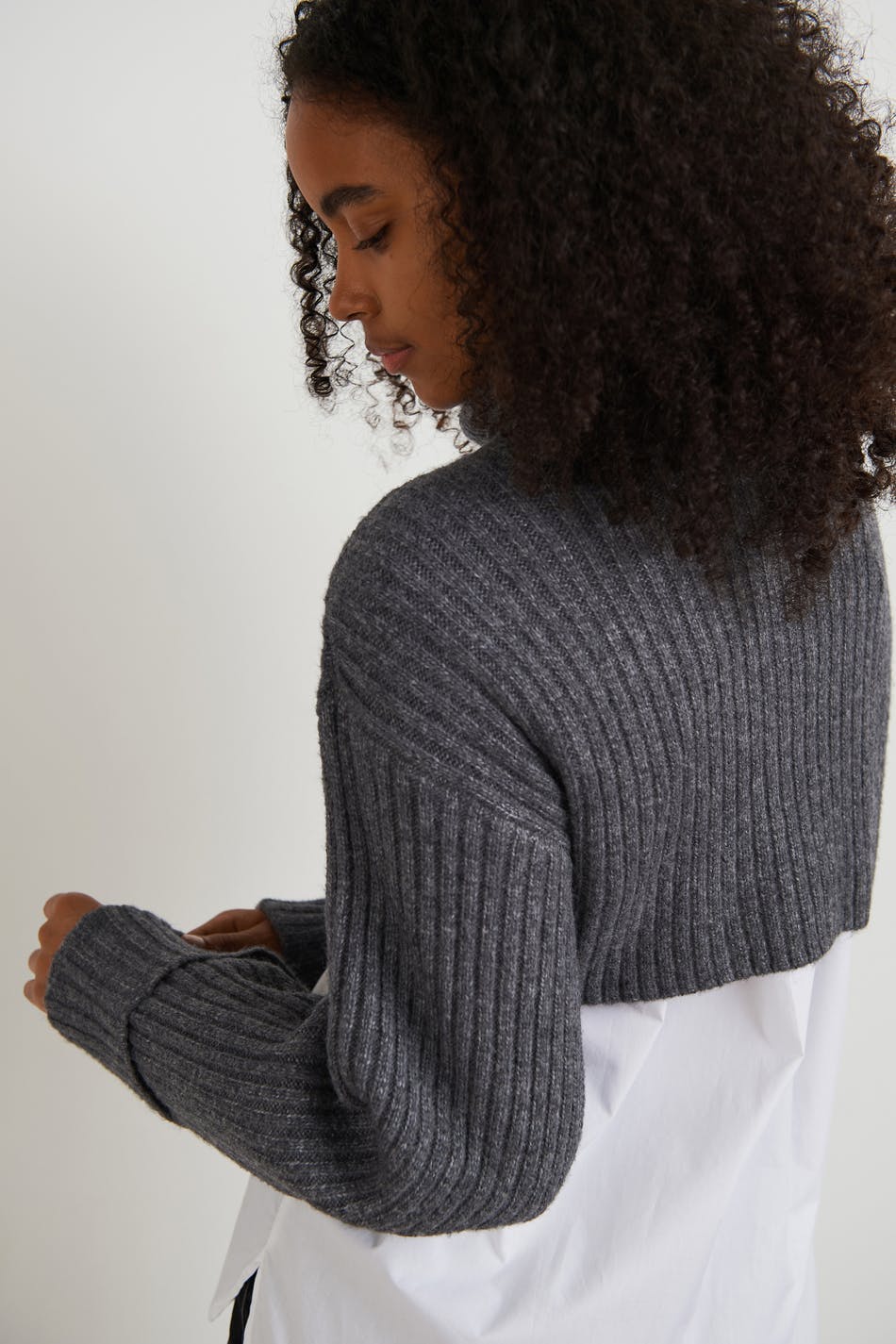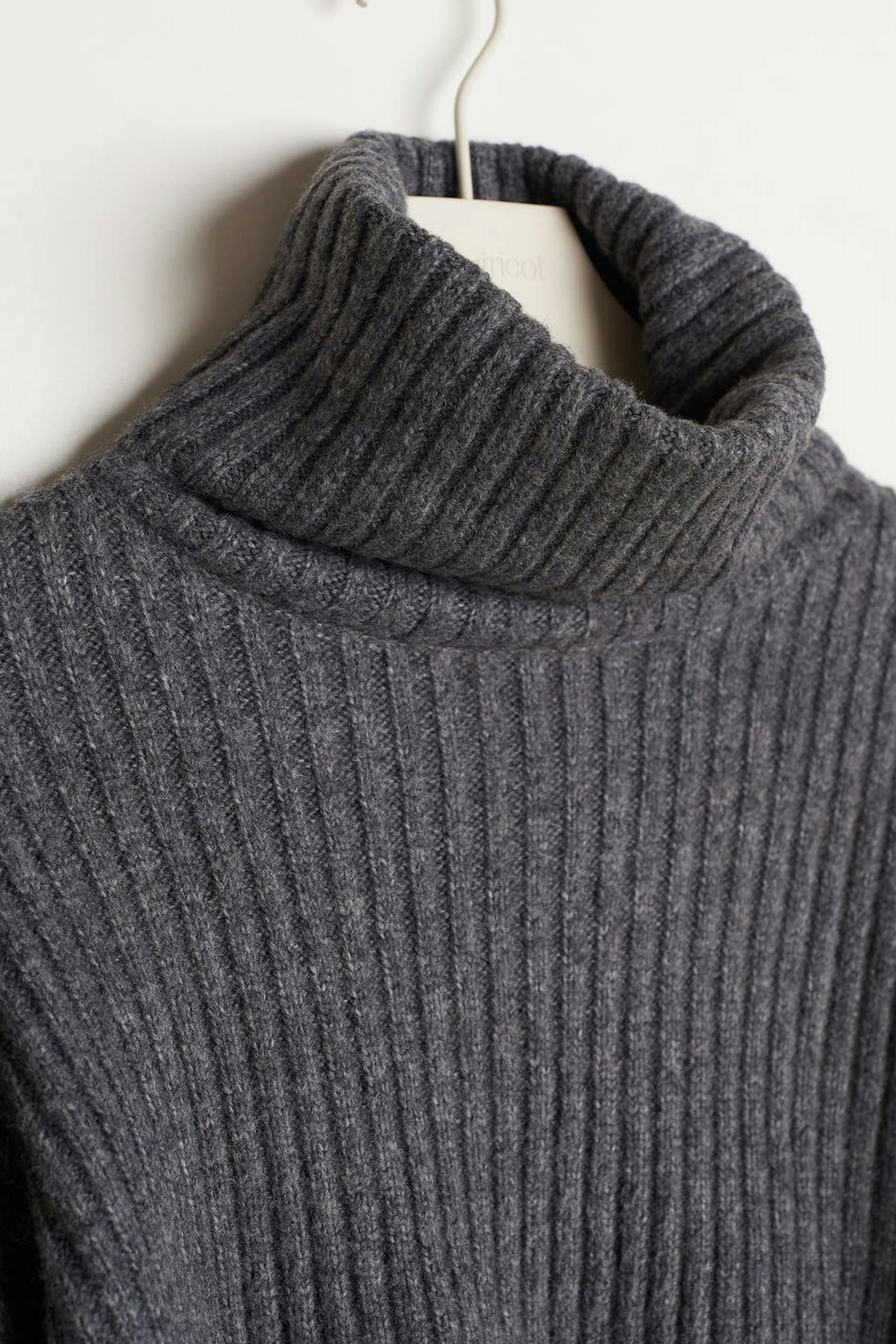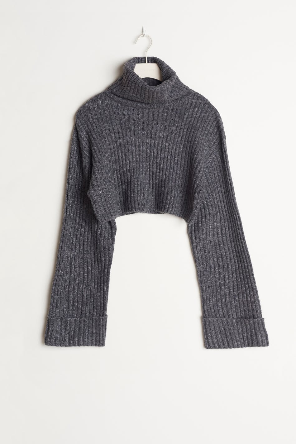 Knitted jumper with a loose-fitting style. The jumper is grey, knitted and long-sleeved. It has a turtleneck and a cropped length.