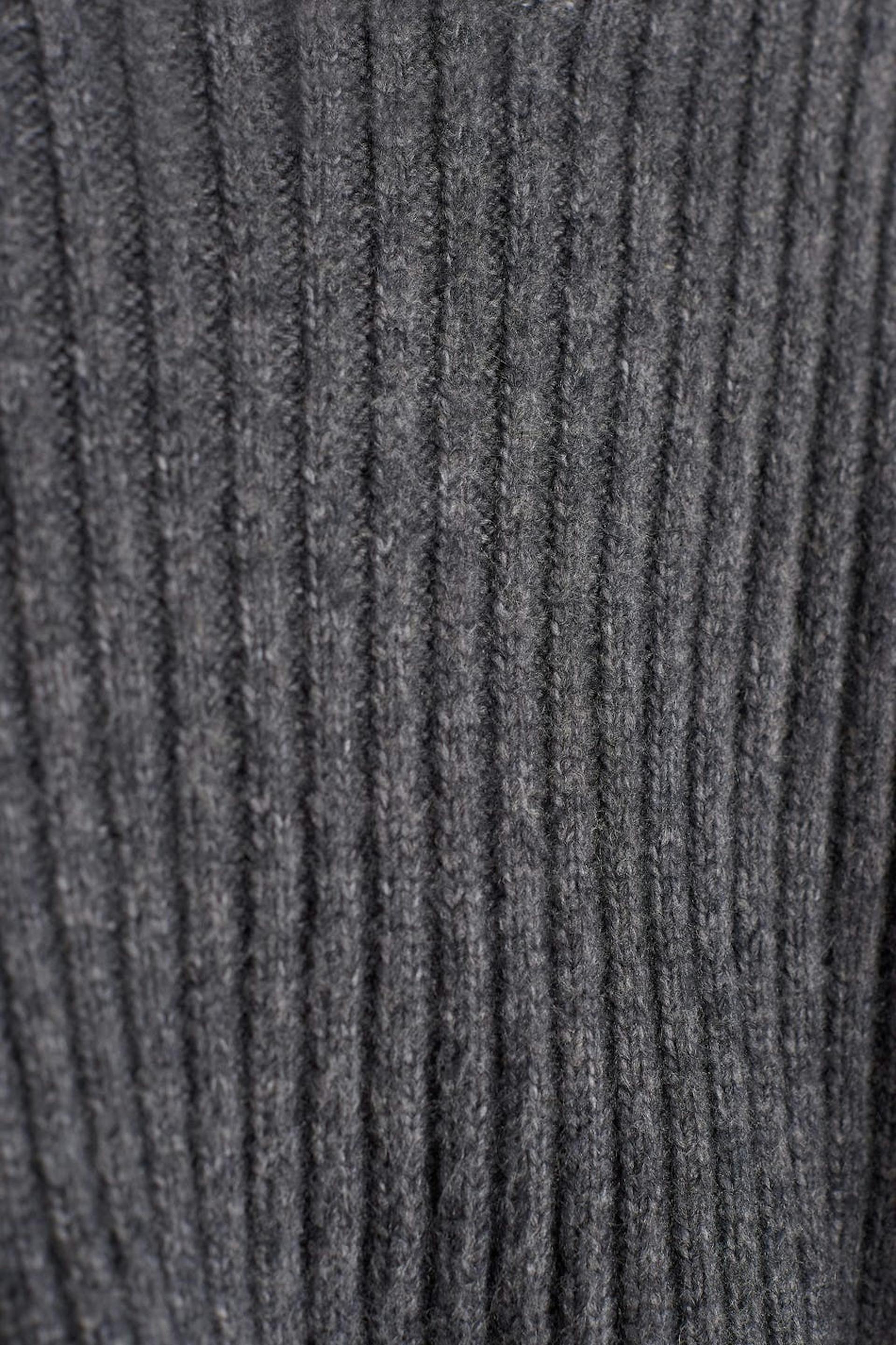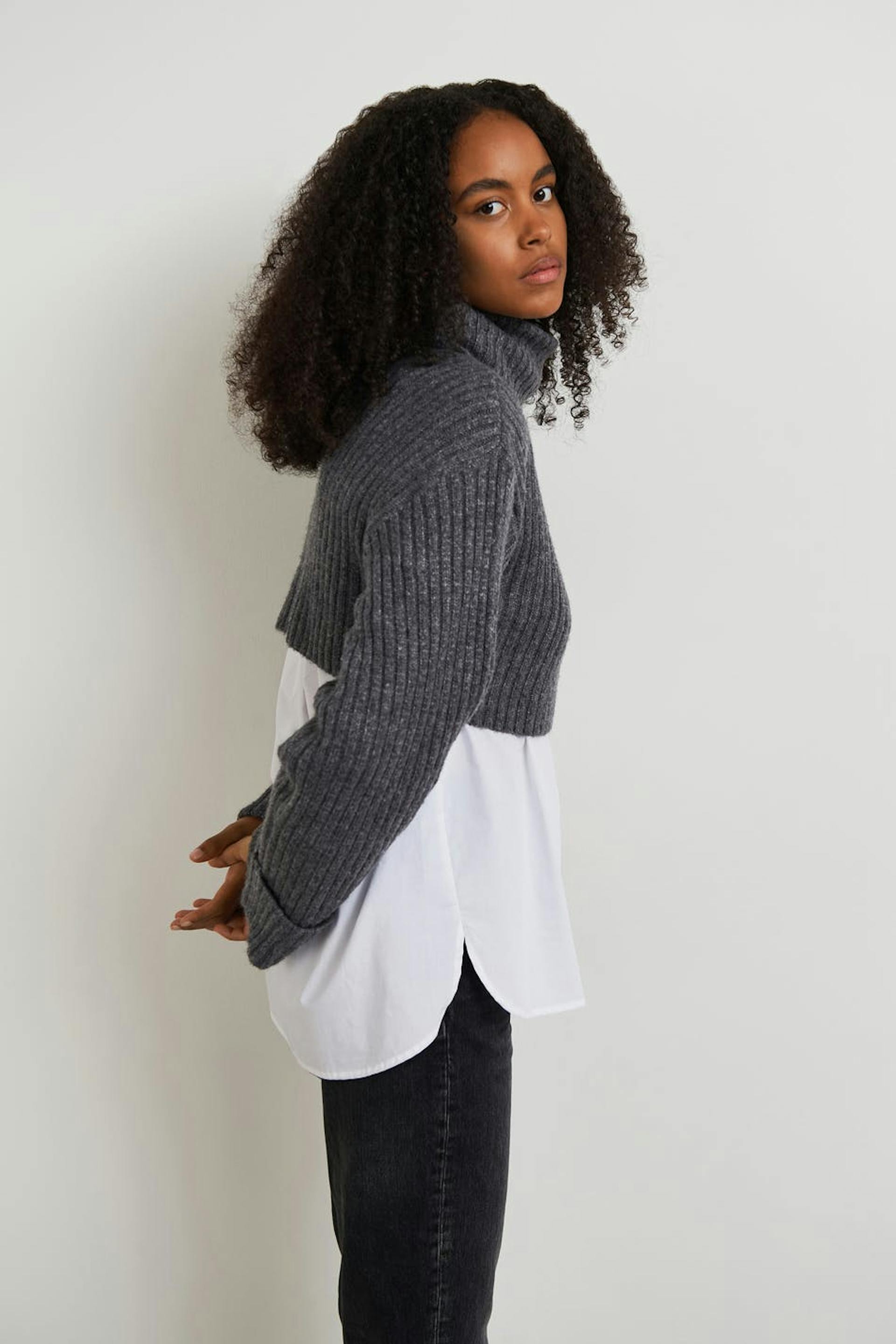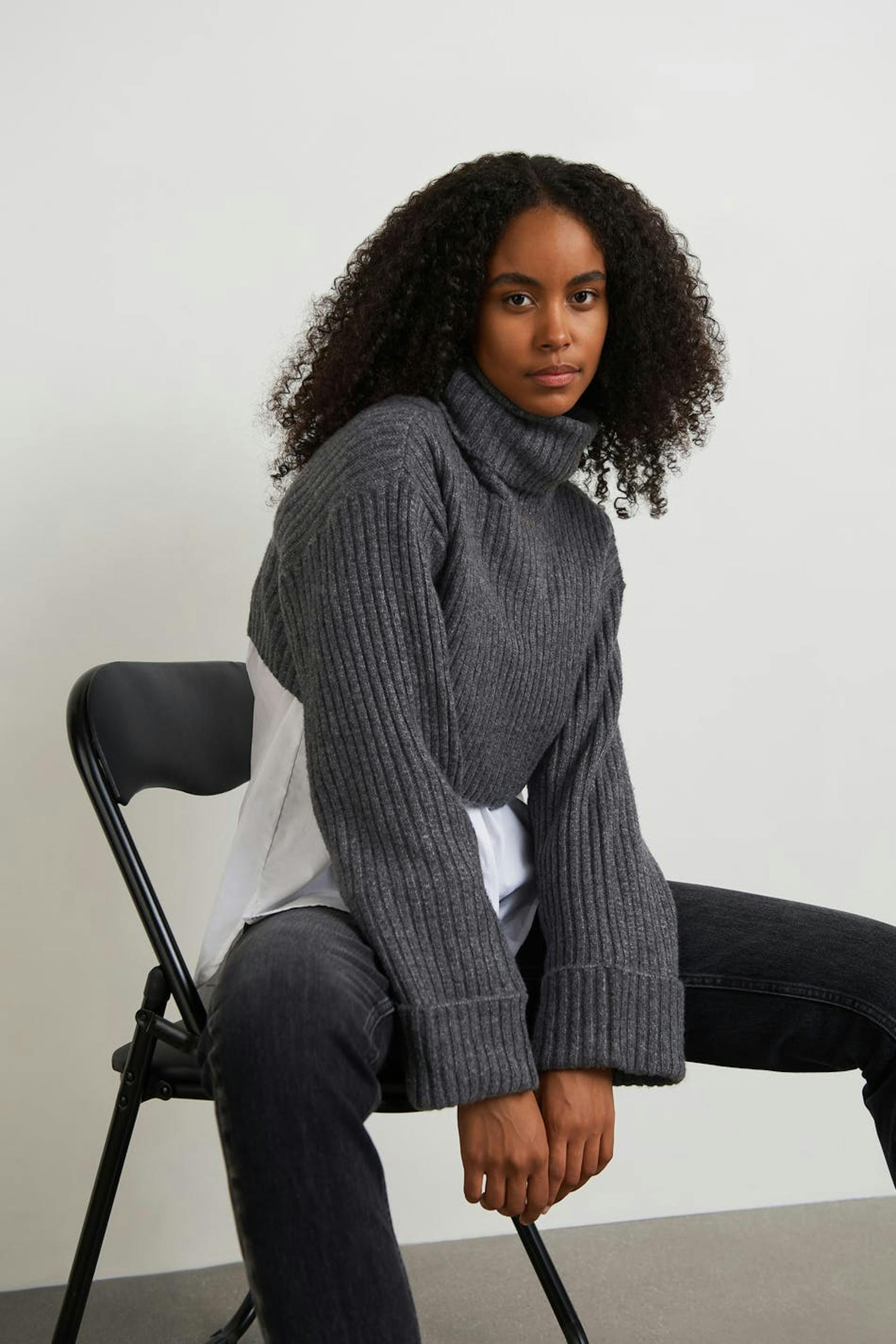 Knitted jumper with a loose-fitting style. The jumper is grey, knitted and long-sleeved. It has a turtleneck and a cropped length.