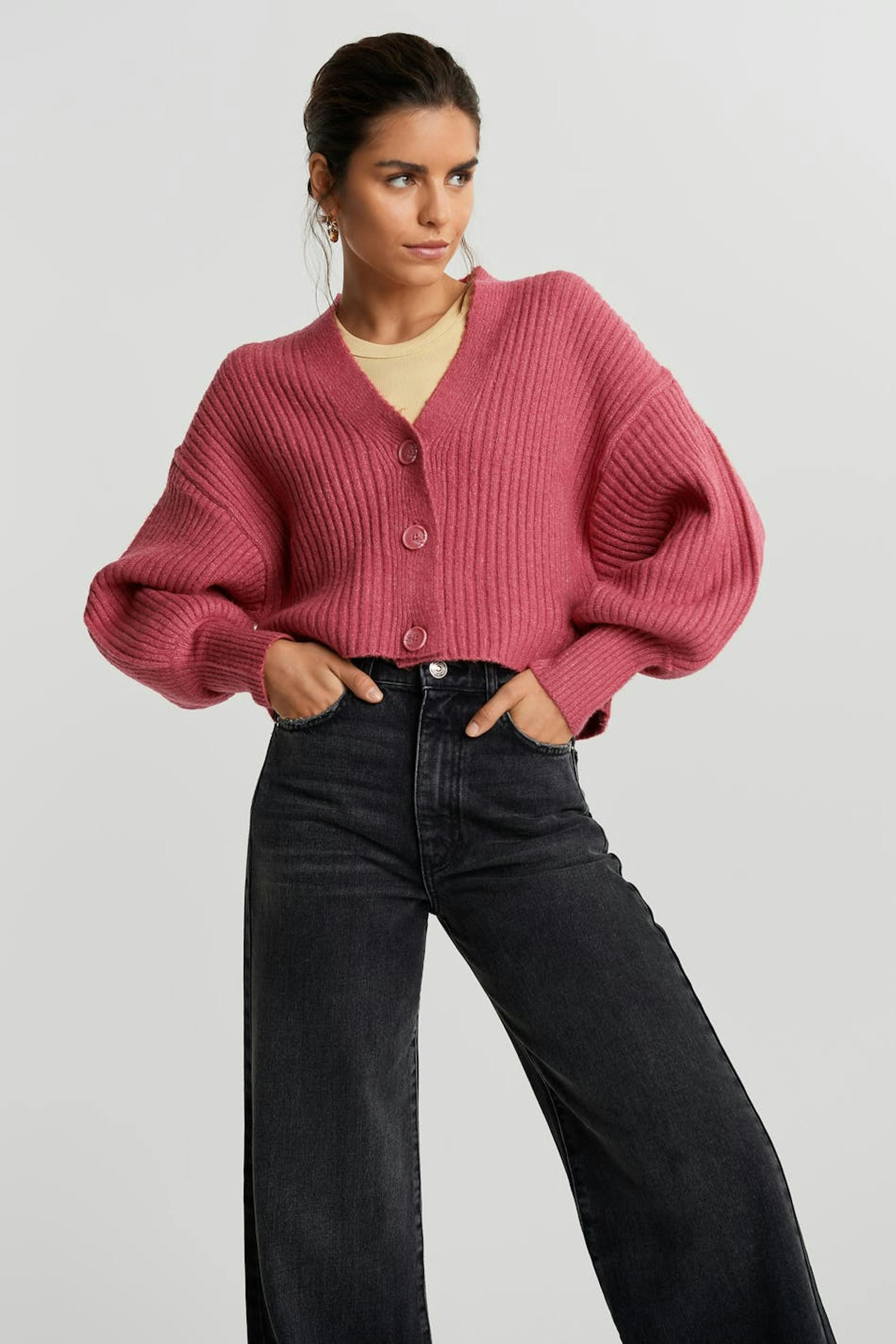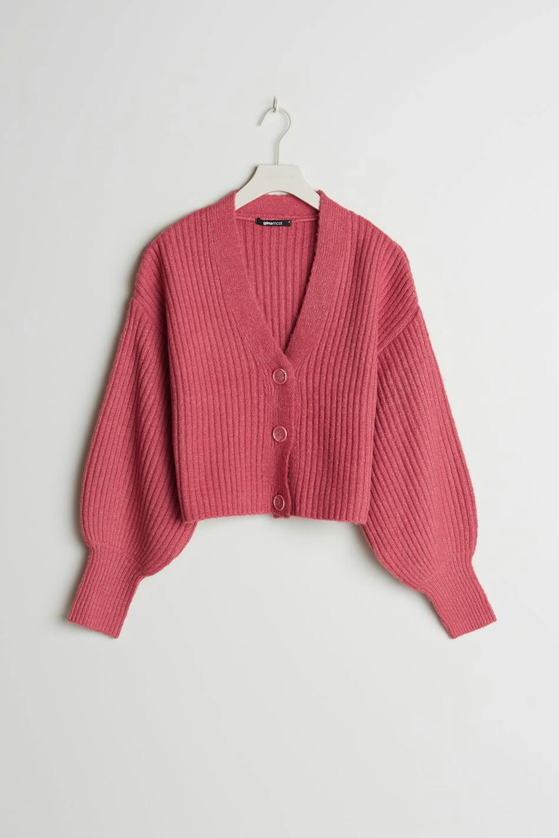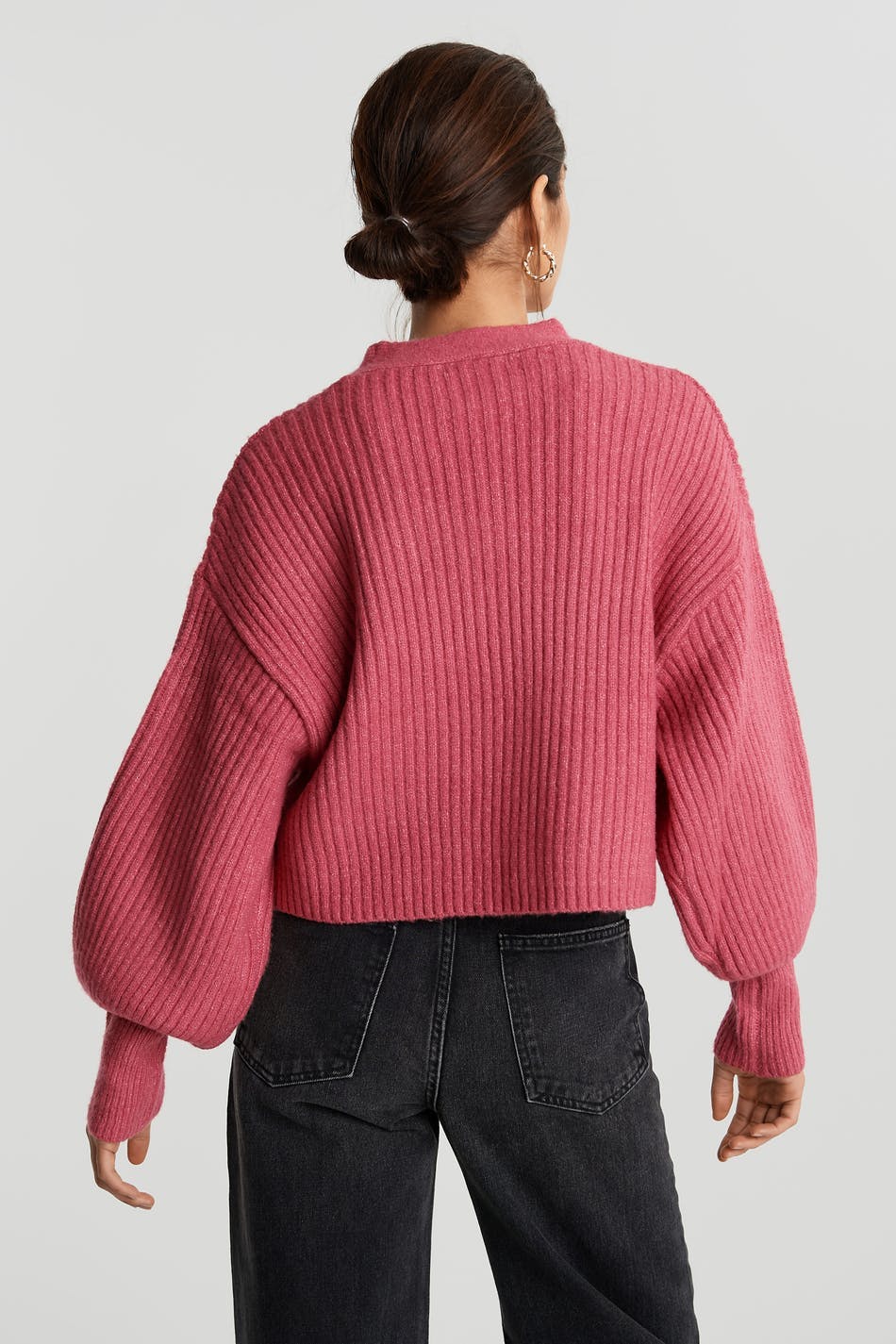 Knitted jumper with long rib knit on the sleeves. The jumper is pink and shorter.